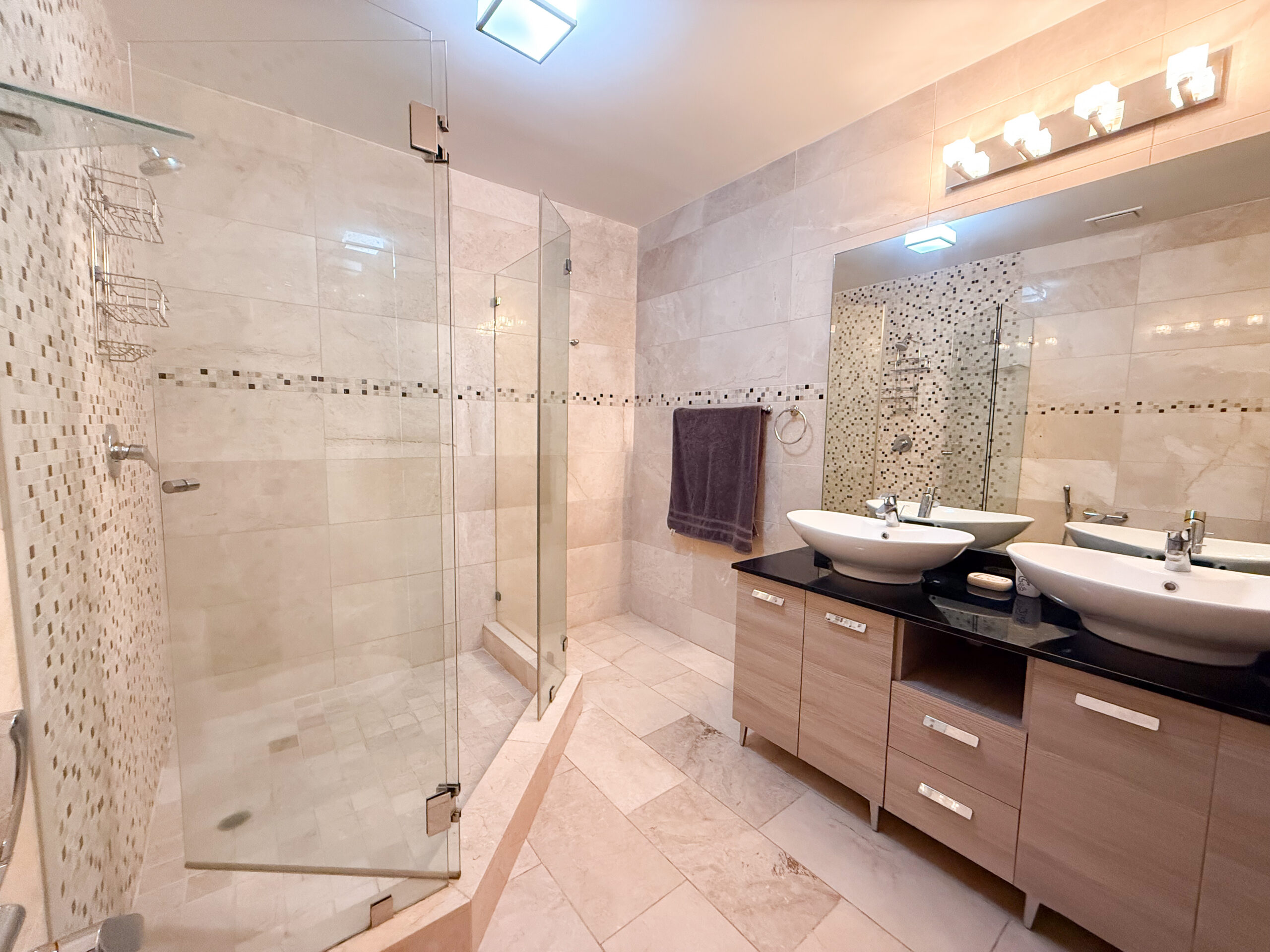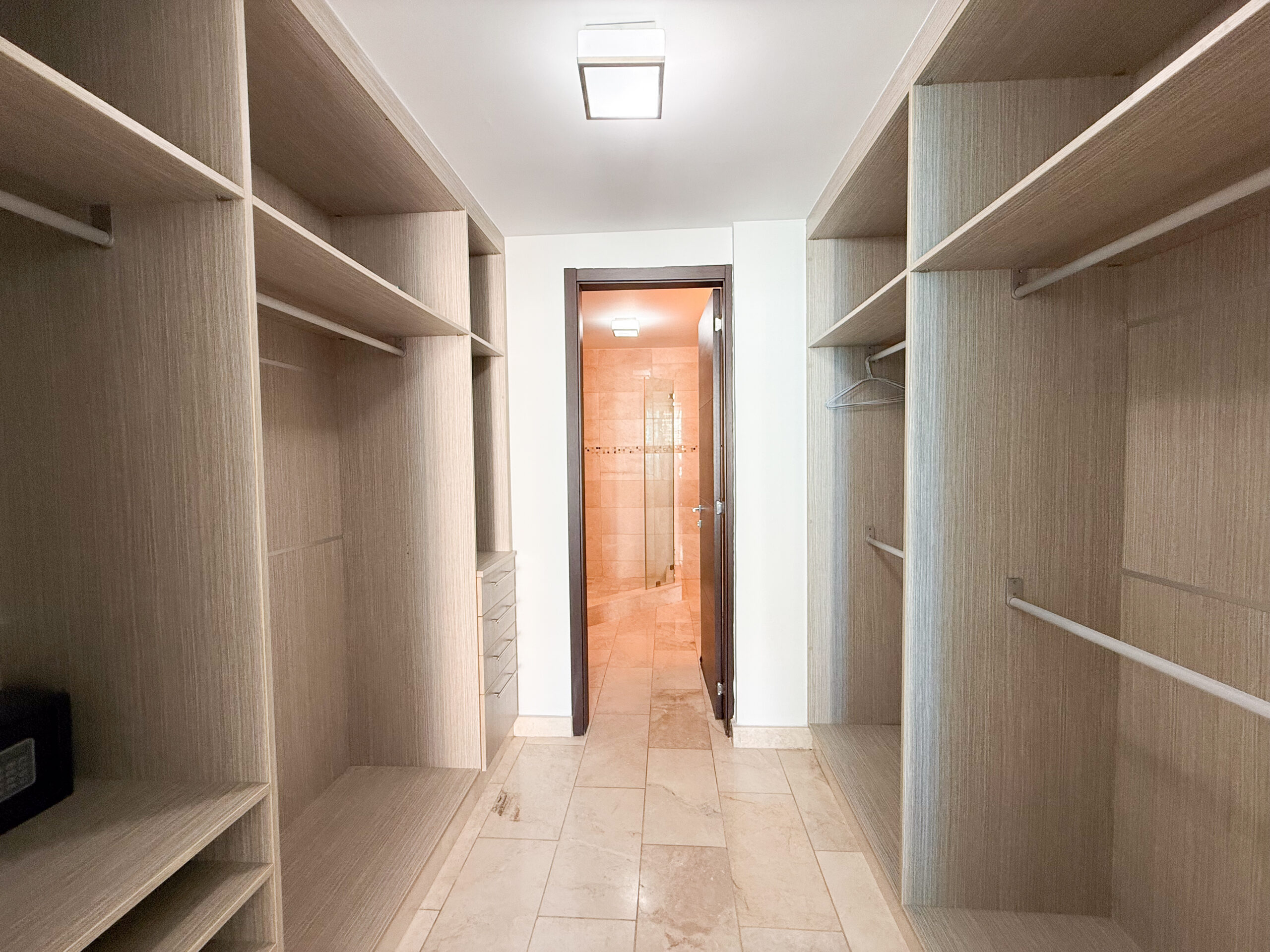 Ambas recámaras son amplias y permiten acomodar fácilmente mobiliario de tamaño completo. La recámara principal incluye un walk-in closet de doble acceso y un baño en suite con doble lavabo, ofreciendo buen espacio de almacenamiento y una distribución cómoda e intuitiva. En total, el apartamento cuenta con 2.5 baños, lo que funciona muy bien tanto para el uso diario como para recibir visitas.