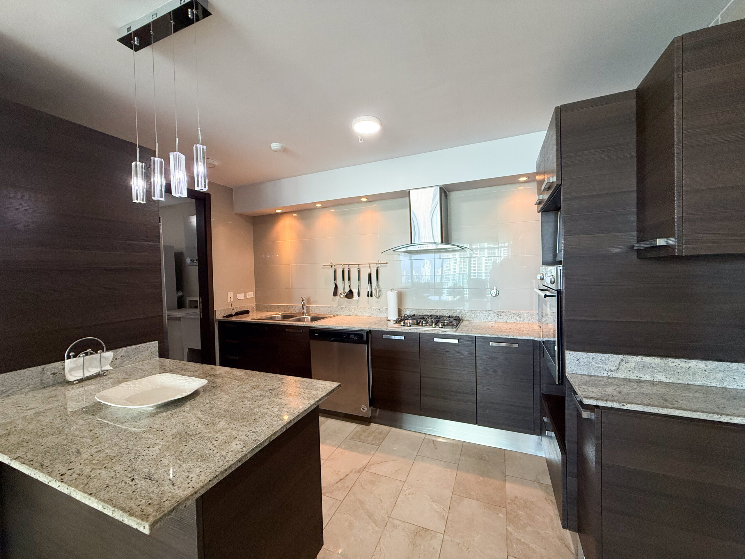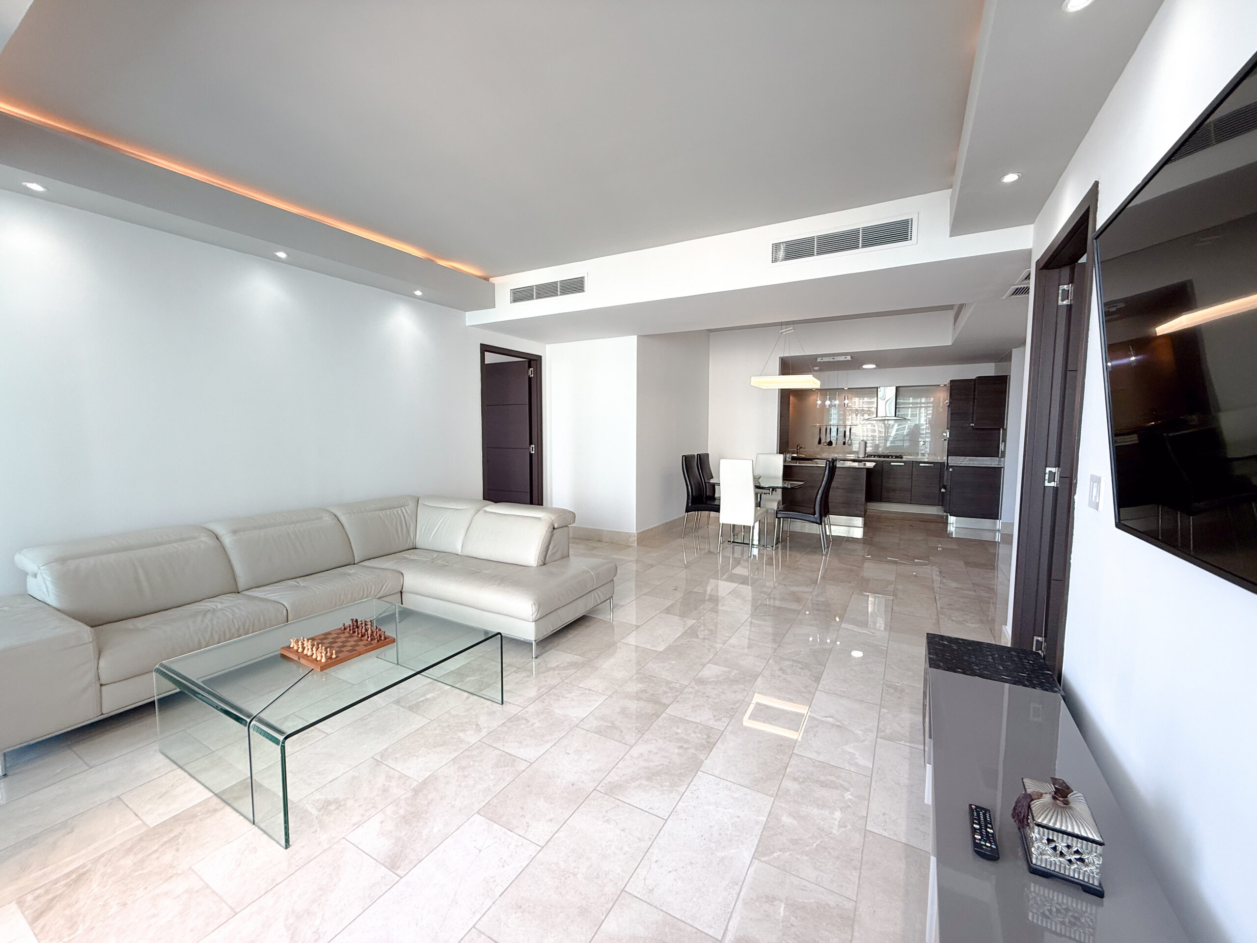 El área social principal está diseñada como un espacio abierto con pisos de mármol, lo que permite que la sala, el comedor y la cocina se integren de manera natural. La cocina cuenta con una isla central, salpicadero completo y acceso directo a un cuarto de lavandería contiguo, manteniendo las áreas de servicio discretas sin interrumpir el espacio principal.