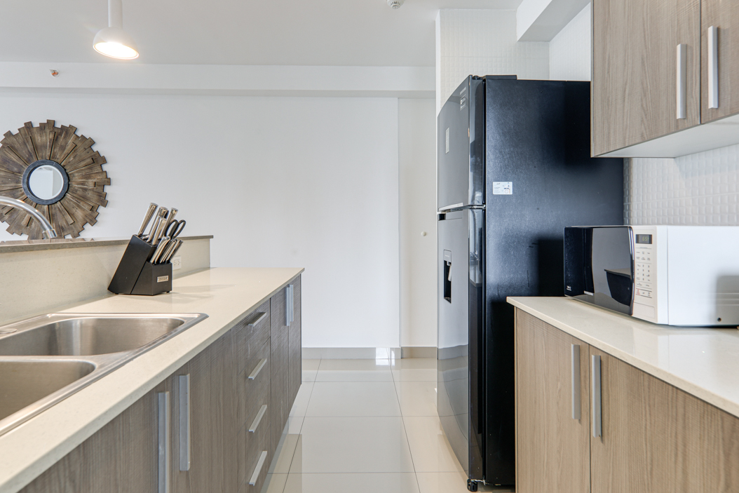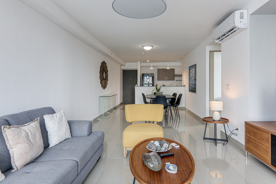 Este apartamento amoblado en alquiler en Zaphiro ofrece 115 m² de espacio bien distribuido. Cuenta con una amplia sala y comedor con ventanales de piso a techo que destacan las vistas a la ciudad. La cocina es espaciosa, con abundante espacio de trabajo y almacenamiento.