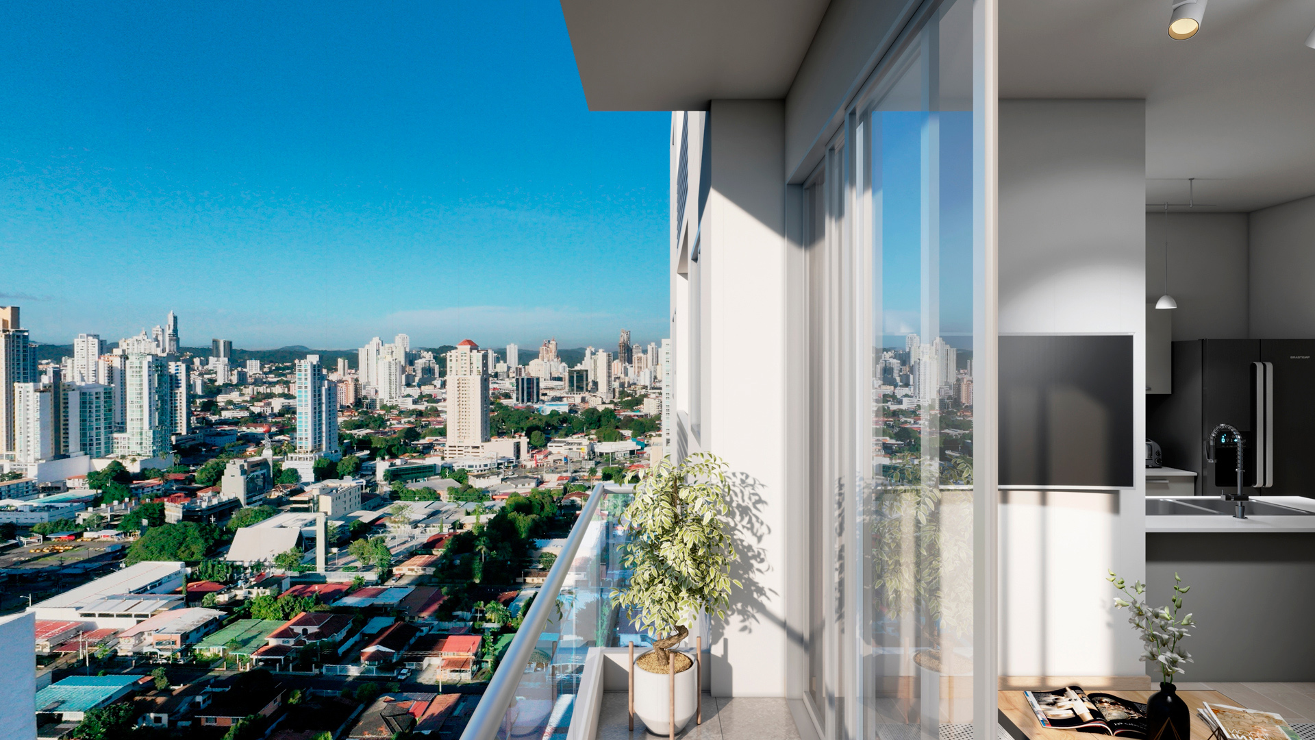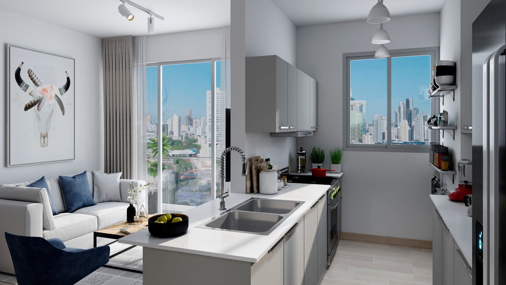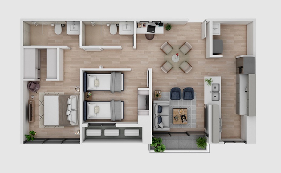El Modelo E aprovecha al máximo sus 80 m² con una distribución bien pensada y fácil de vivir. La sala y el comedor se ubican en el centro, conectándose de forma natural con la cocina y abriéndose hacia un balcón con vistas a la ciudad, lo que hace que el espacio se sienta más amplio.