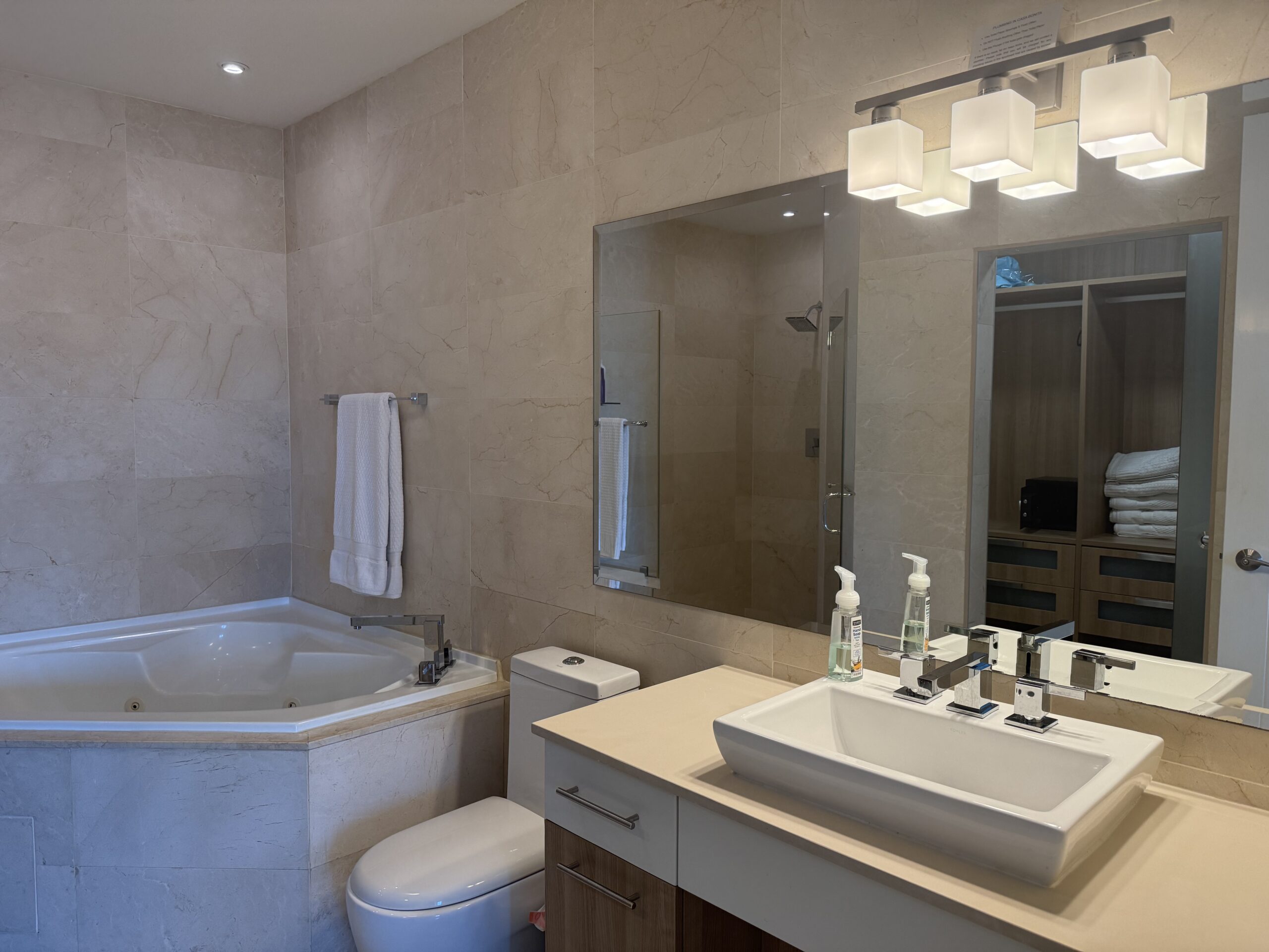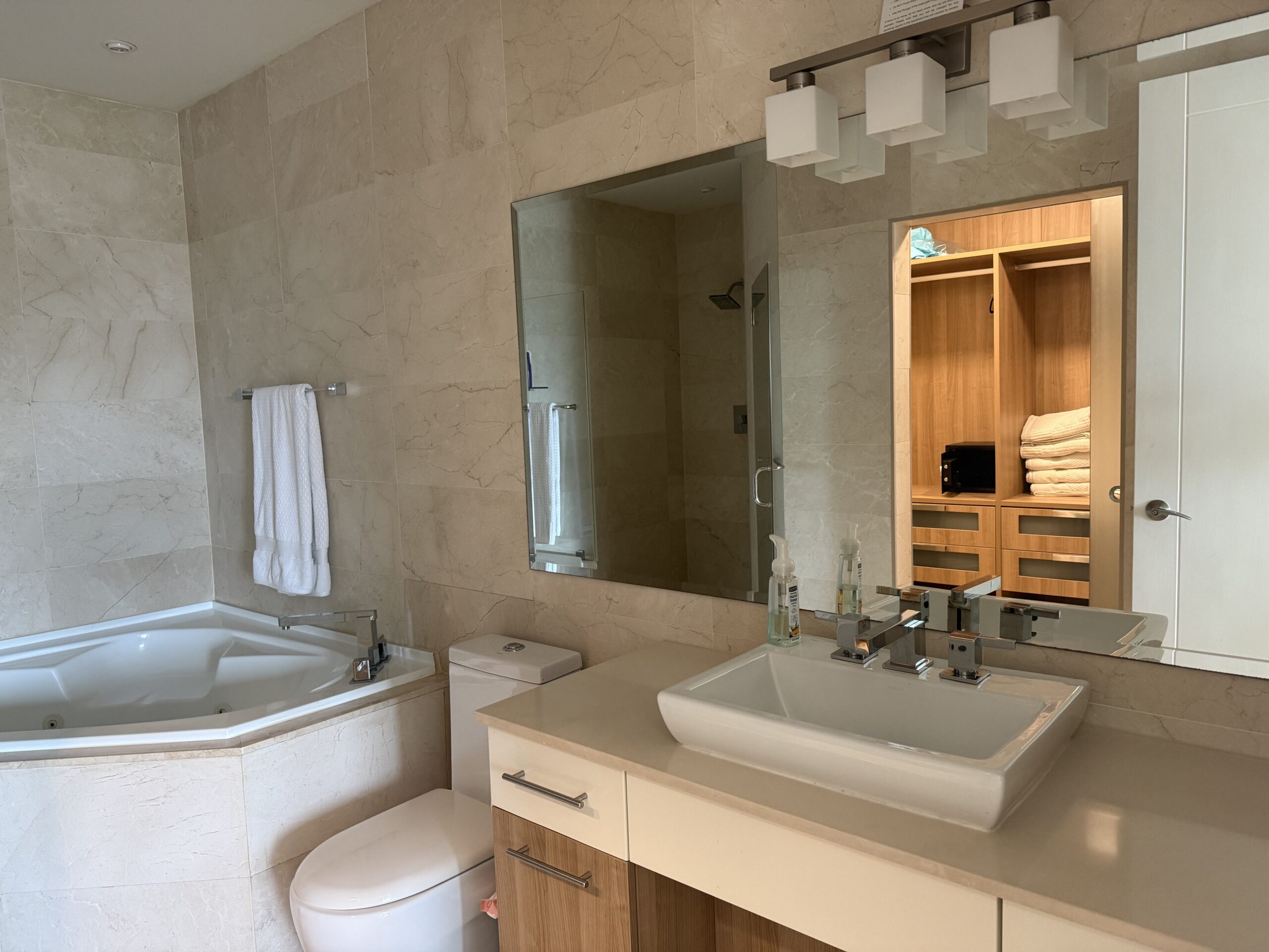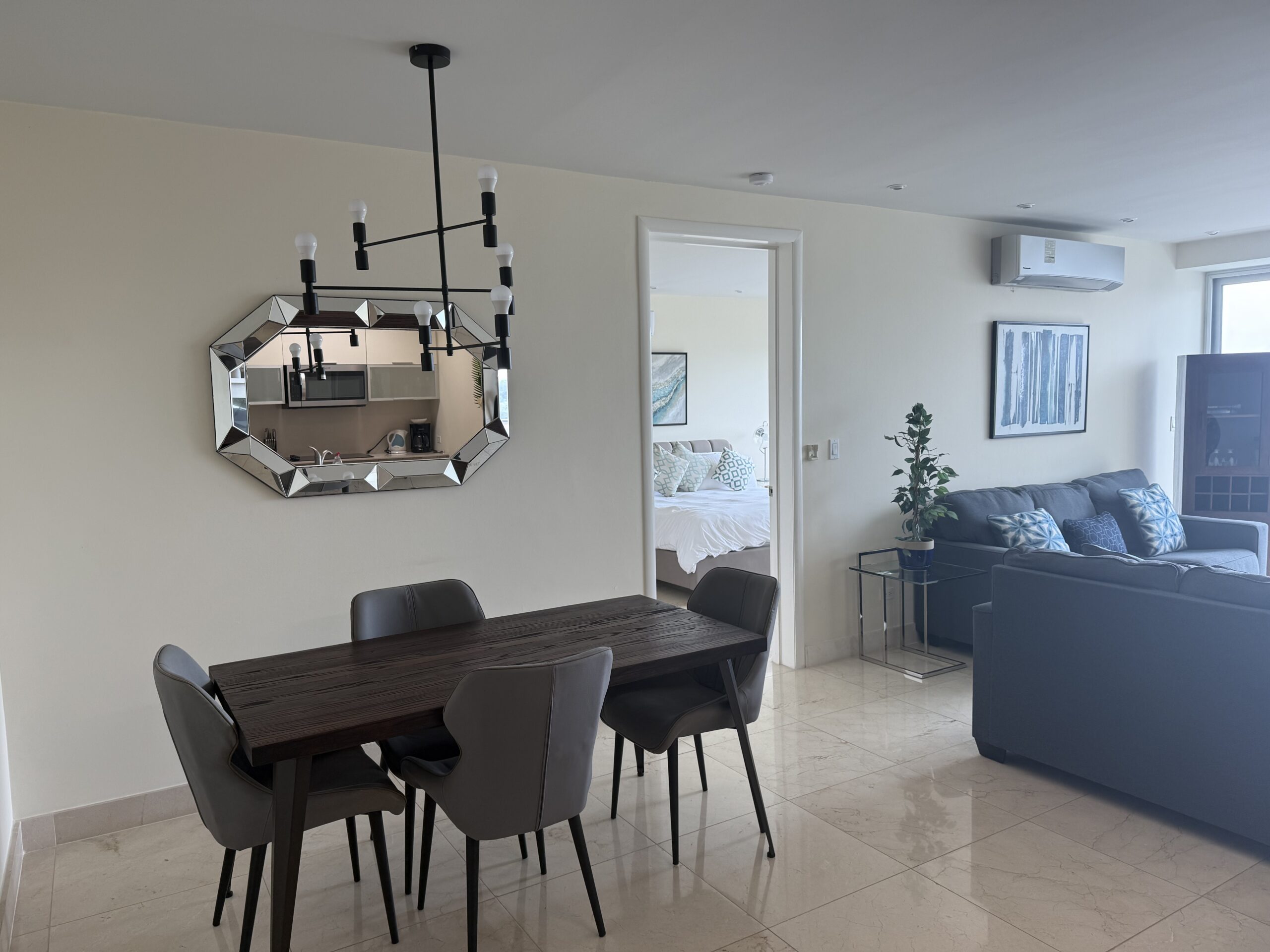 El piso de mármol se extiende en toda la propiedad, y la cocina cuenta con sobres de cuarzo. El baño principal incluye una tina tipo jacuzzi, y el medio baño adicional hace que la distribución sea más práctica para recibir visitas. Los techos altos y el aire acondicionado central completan un espacio que funciona muy bien como residencia principal, segunda vivienda o propiedad para generar ingresos.