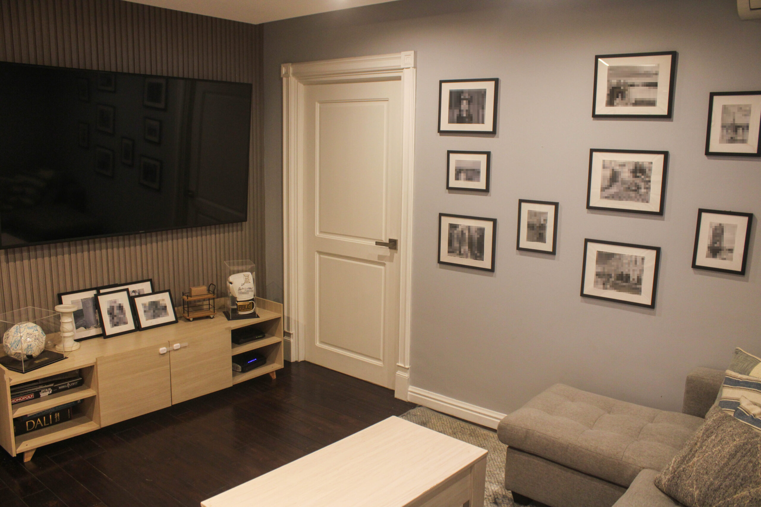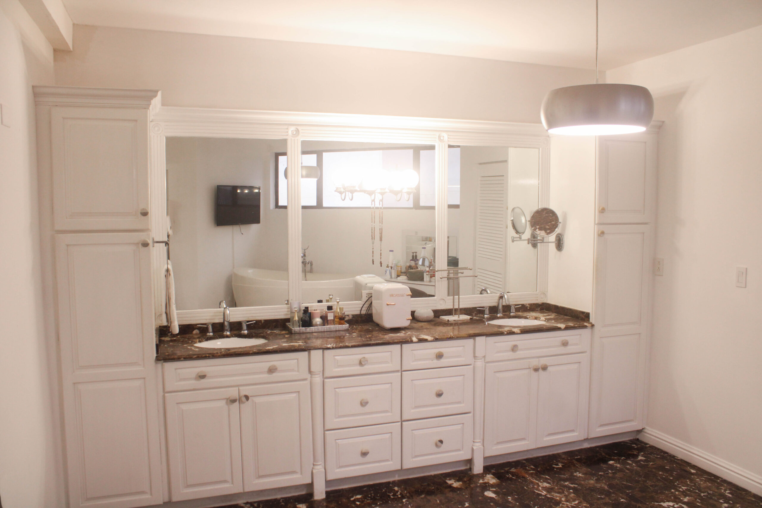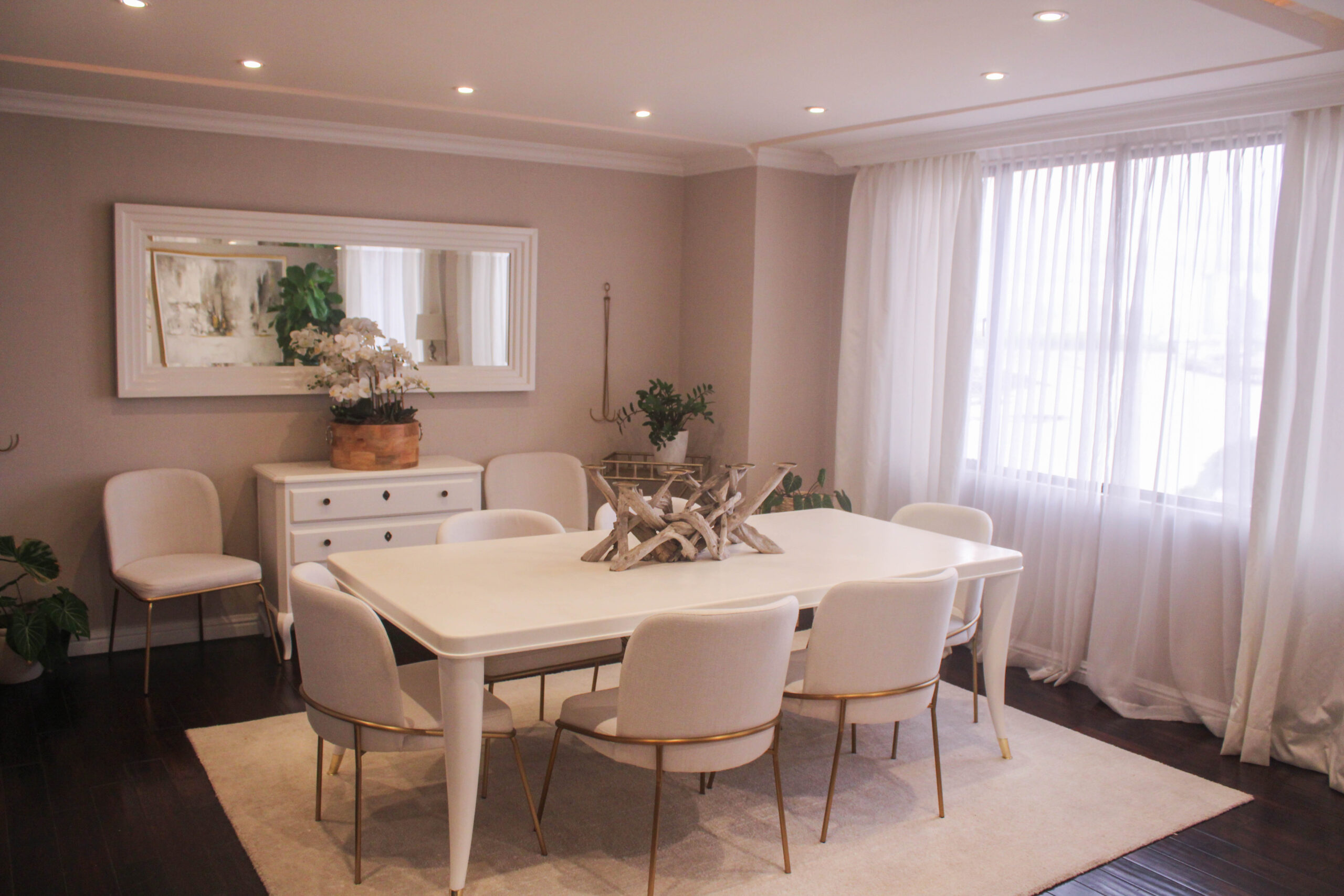El apartamento cuenta con pisos de madera en toda su extensión y amplias ventanas orientadas al este con vistas despejadas al mar. La remodelación incorporó una paleta de colores neutros, molduras blancas y acabados modernos para lograr un aspecto limpio y actualizado.