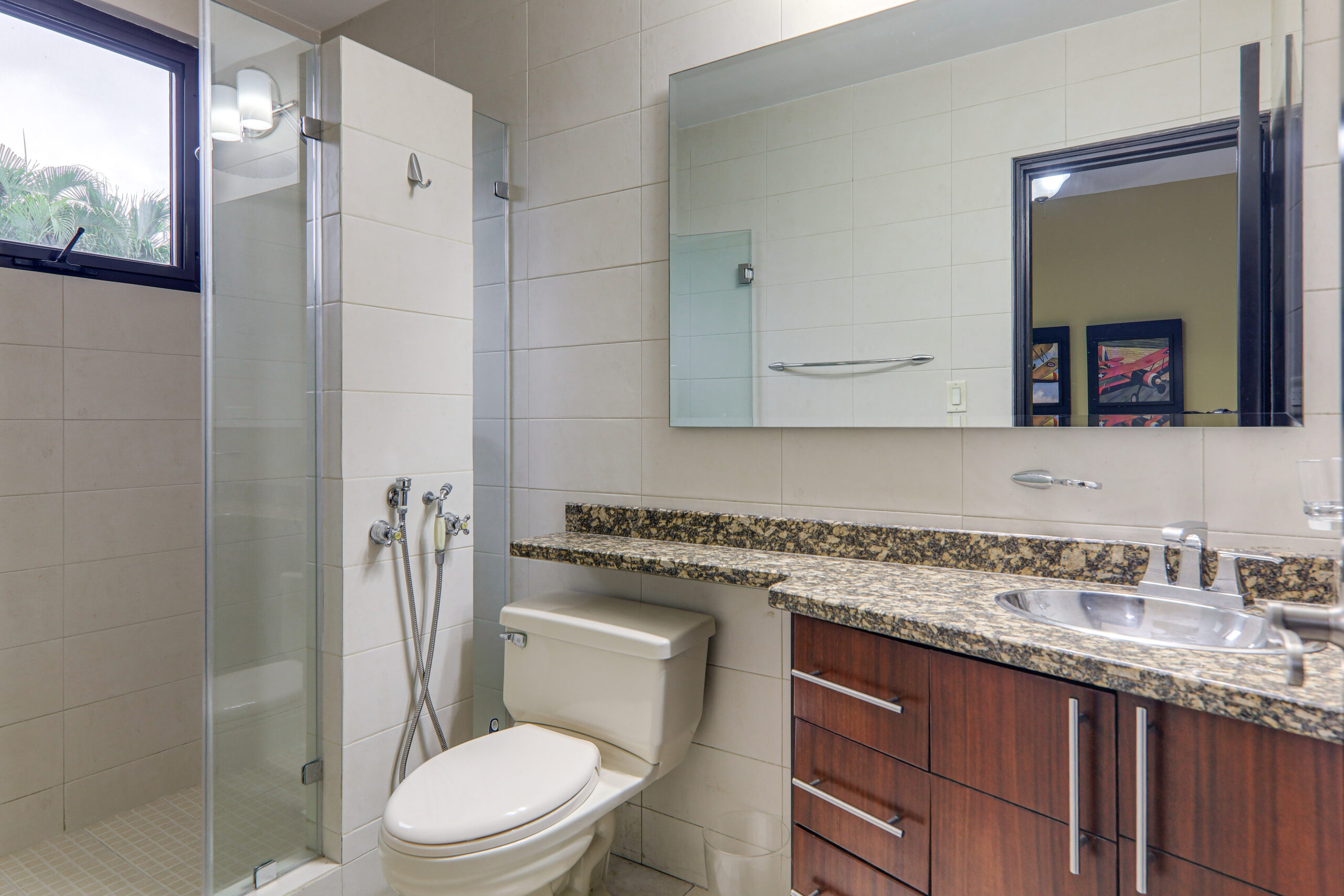 El nivel principal cuenta con amplias áreas de sala y comedor con grandes ventanales que dan al jardín. También incluye una acogedora sala familiar y un bar con muebles hechos a medida. La cocina es moderna y práctica, con encimeras de granito, buen espacio de almacenamiento y una isla central. La terraza, con cubierta ajustable, es un excelente lugar para comidas al aire libre o reuniones informales. El jardín está bien cuidado y ofrece un buen equilibrio entre áreas abiertas y privacidad. Este nivel también tiene un baño de visitas y un garaje cerrado para dos autos.