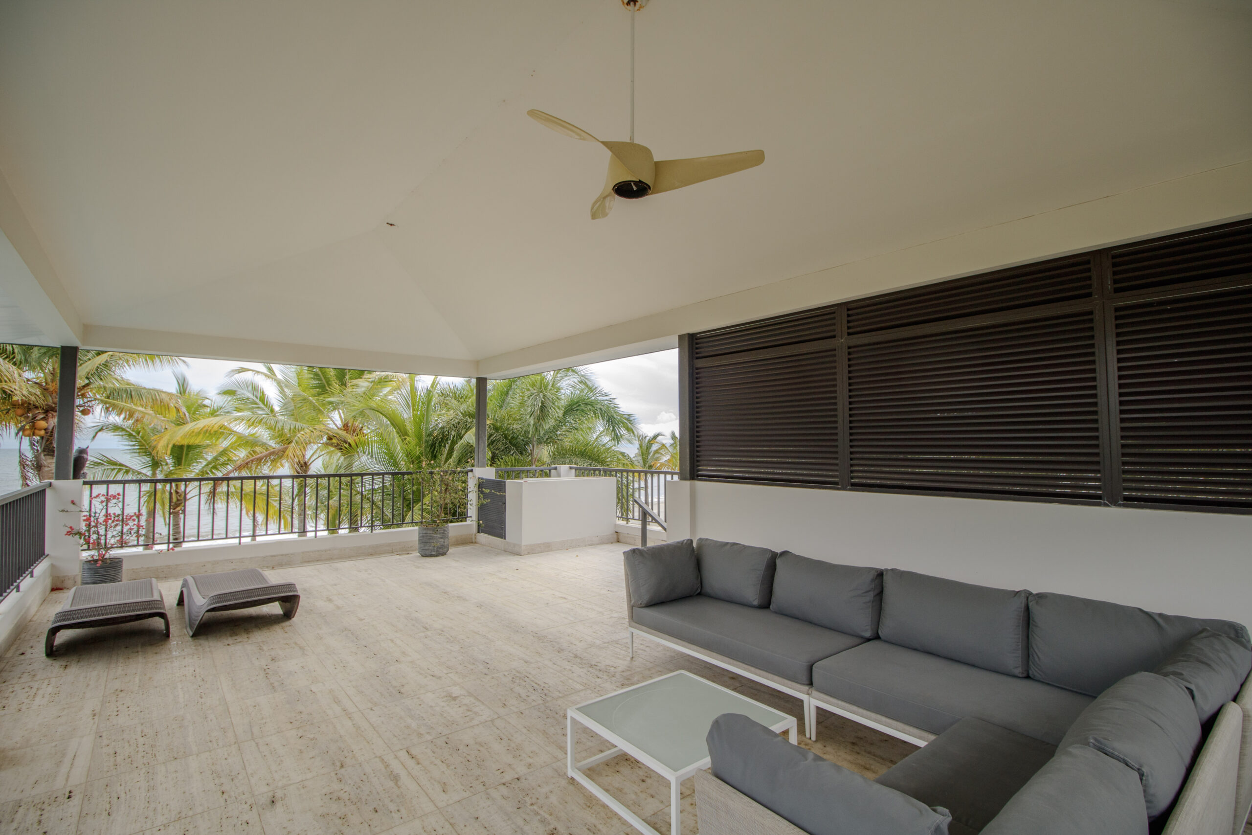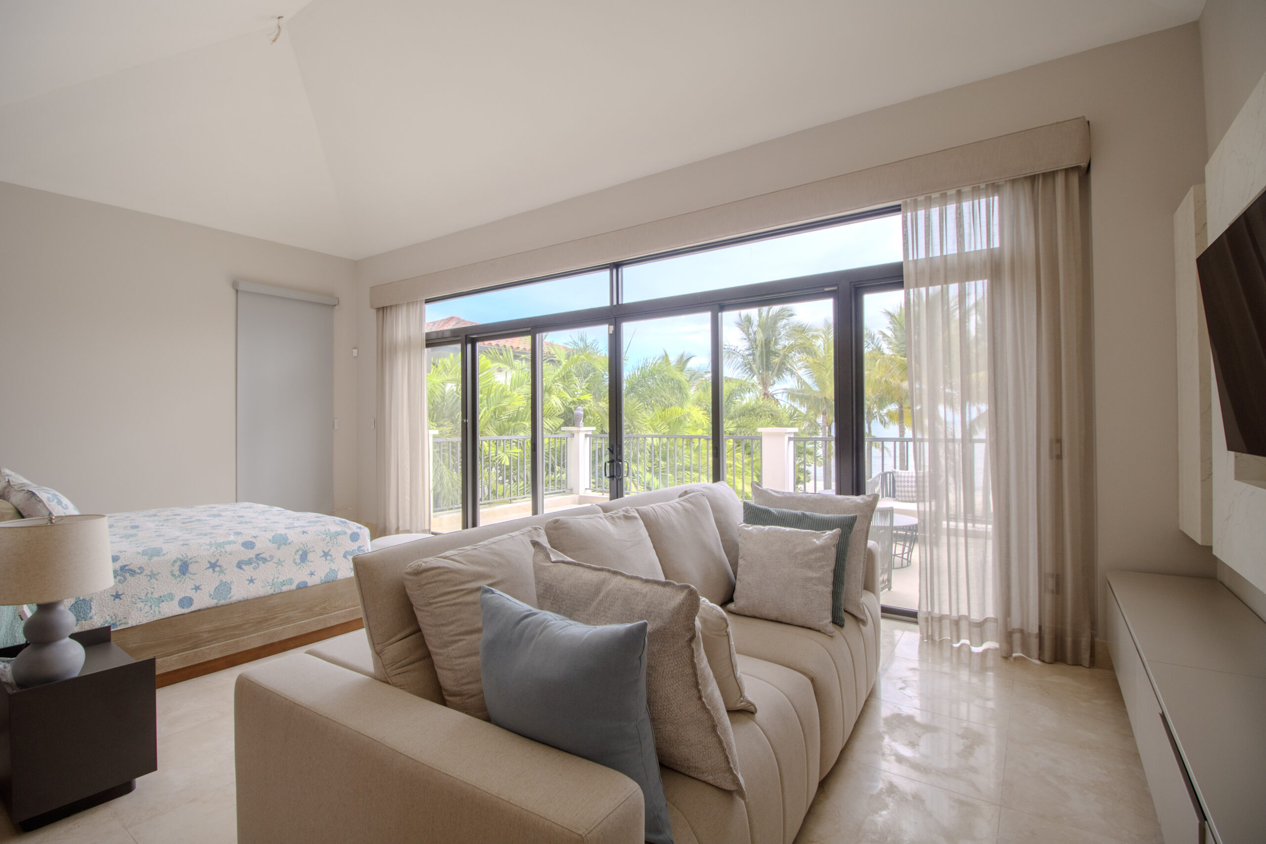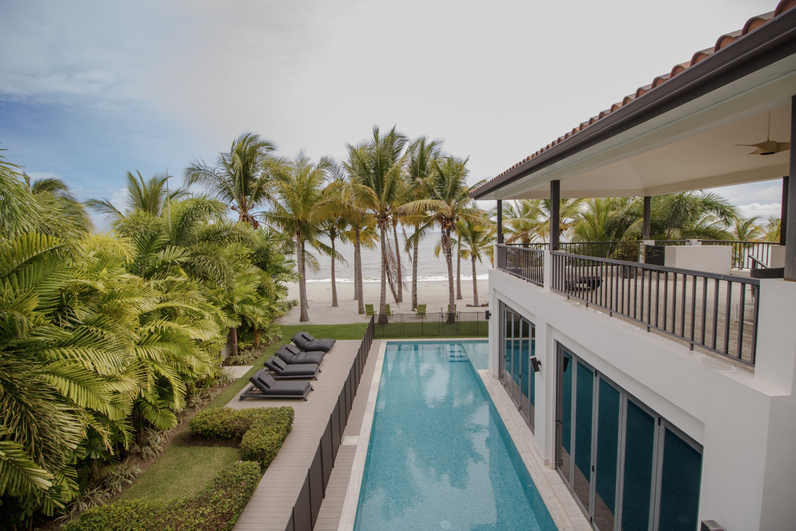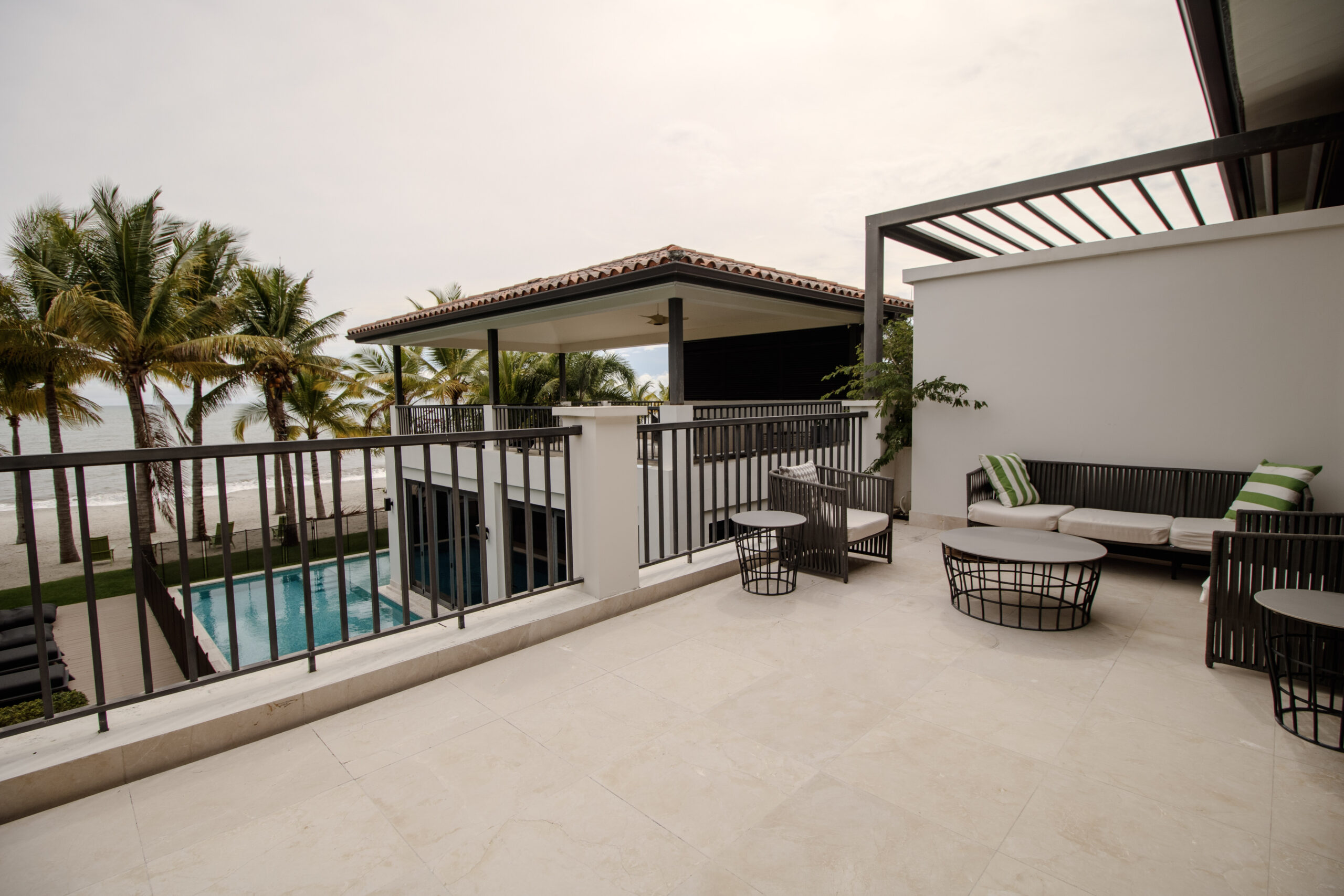 La recámara principal cuenta con lavamanos dobles y una bañera exterior, y se abre a una amplia terraza. Esta terraza se conecta con un área exterior cubierta en la planta alta con vista a la piscina. Es lo mejor de ambos mundos: vida frente al mar y mucho espacio para relajarse o recibir invitados.