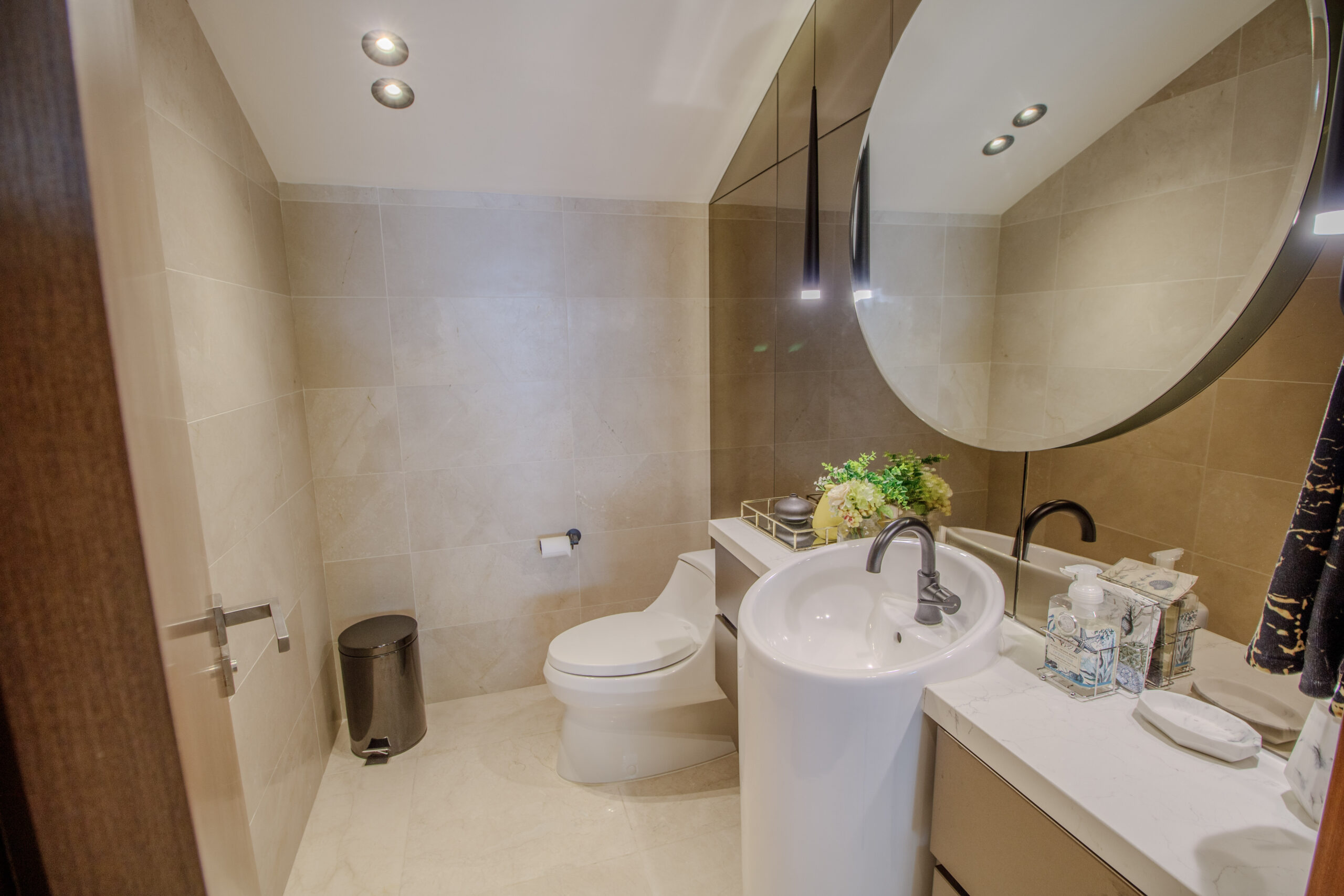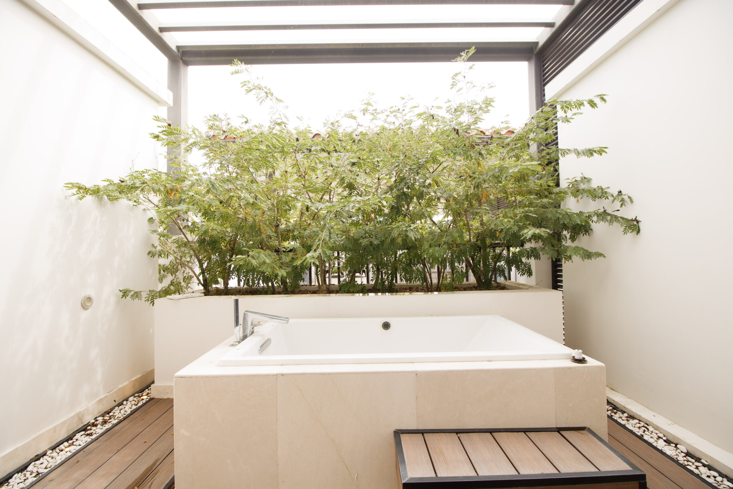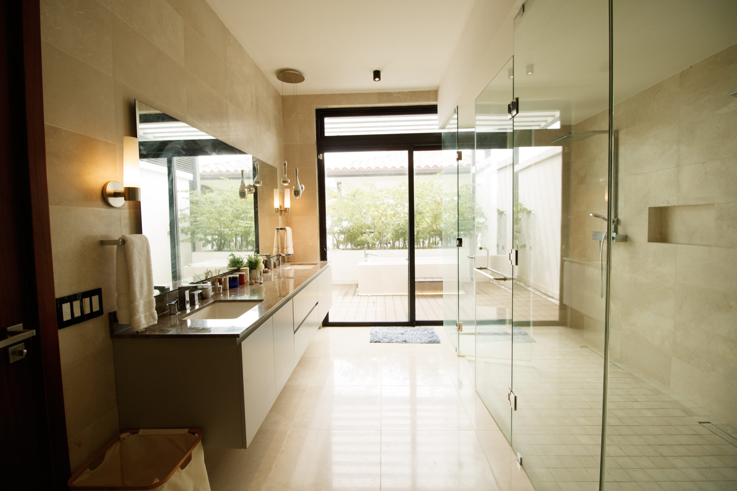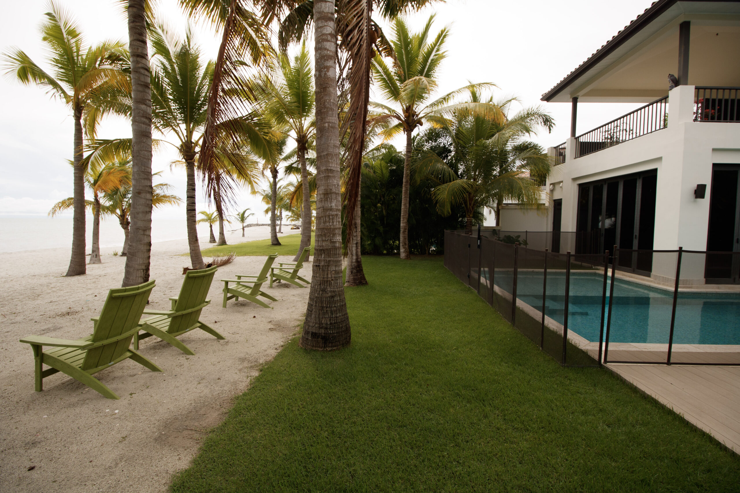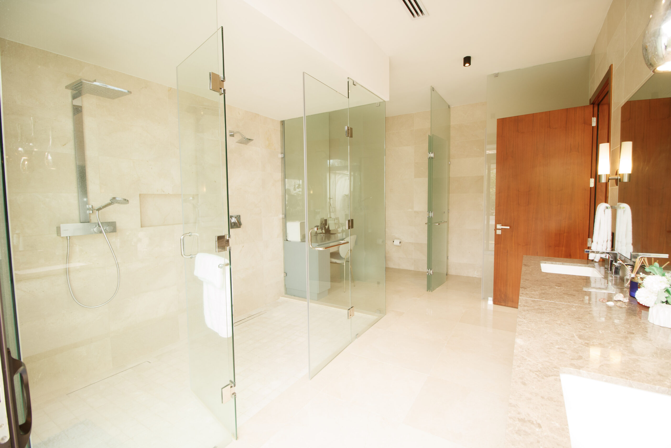 La recámara principal cuenta con lavamanos dobles y una bañera exterior, y se abre a una amplia terraza. Esta terraza se conecta con un área exterior cubierta en la planta alta con vista a la piscina. Es lo mejor de ambos mundos: vida frente al mar y mucho espacio para relajarse o recibir invitados.