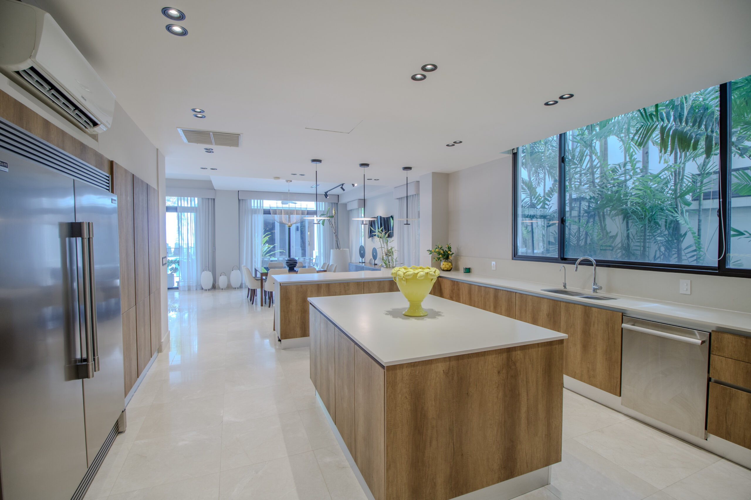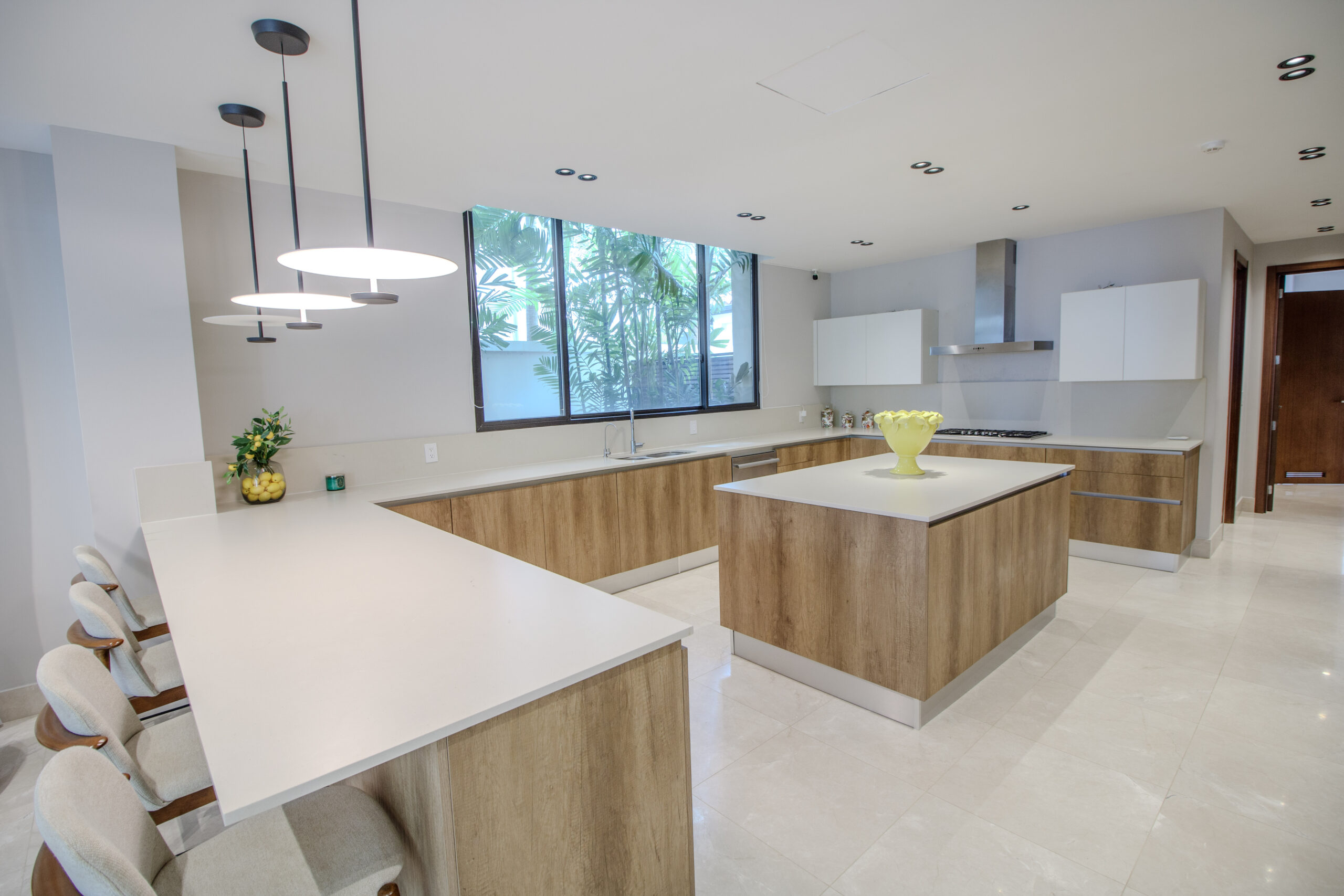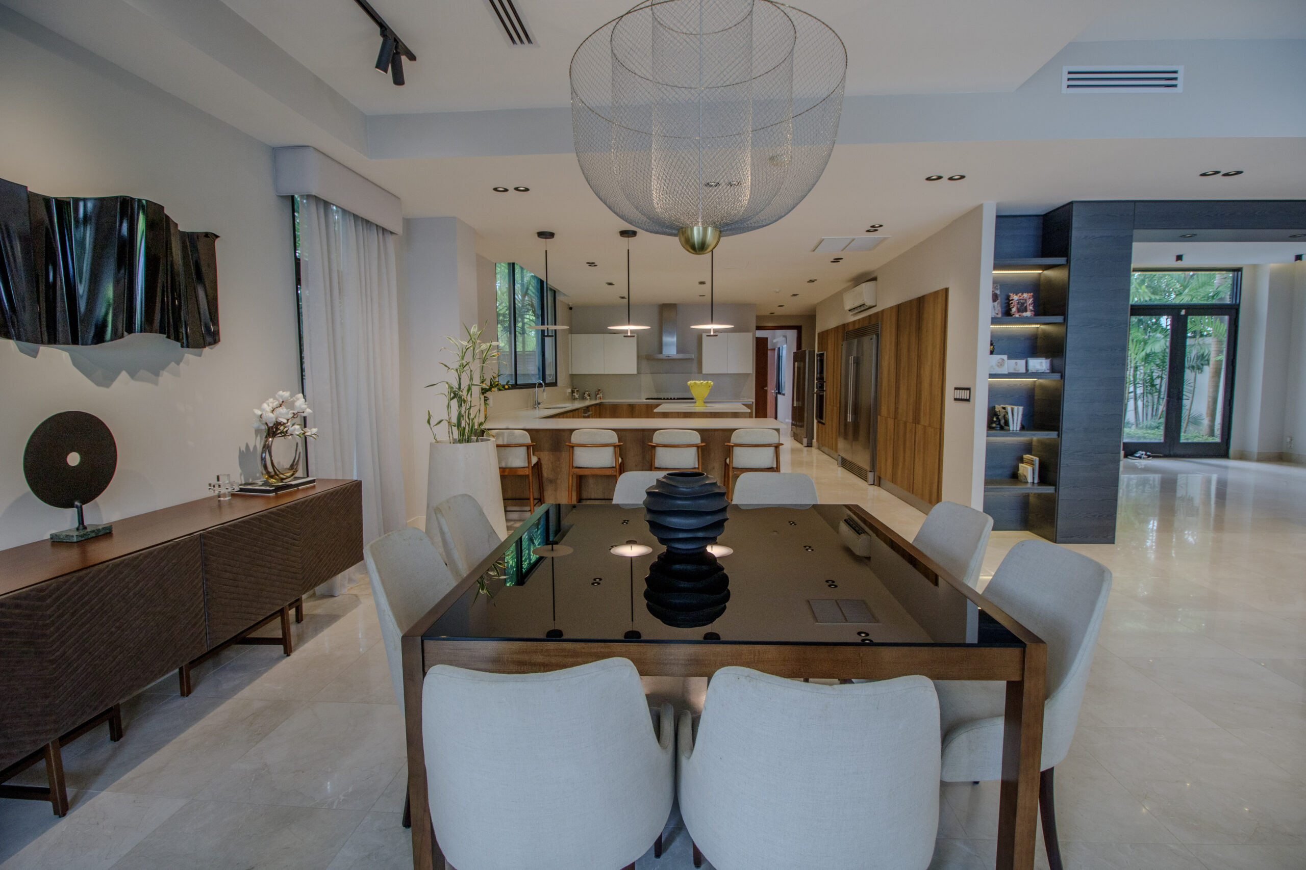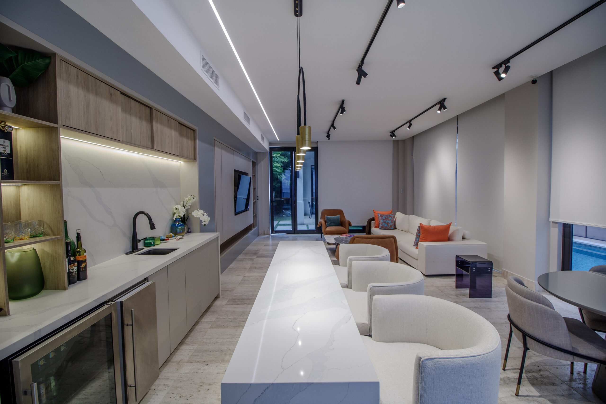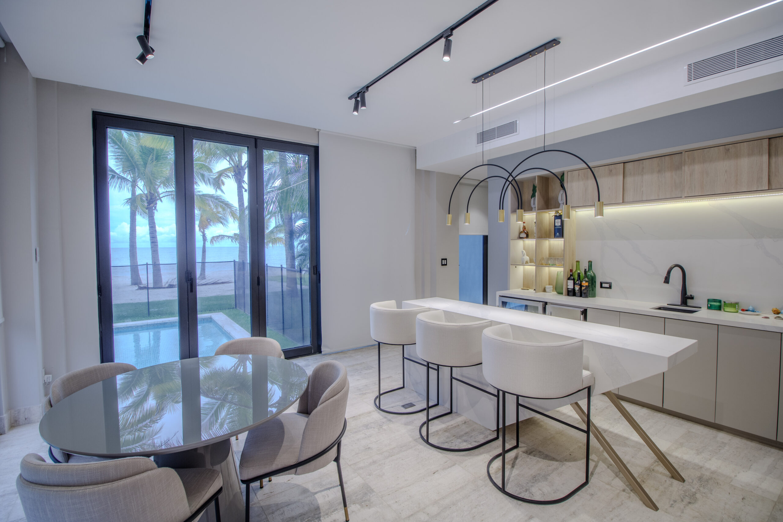 La planta baja cuenta con una distribución abierta que integra la cocina, el comedor y la sala en un solo espacio práctico y fácil de usar. La cocina incluye una isla y una encimera en forma de L que funciona muy bien como barra de desayuno o área de asientos informales. Las grandes puertas corredizas se abren directamente hacia la terraza y la piscina, creando una conexión fluida entre el interior y el exterior que hace que el espacio se sienta más amplio y versátil.