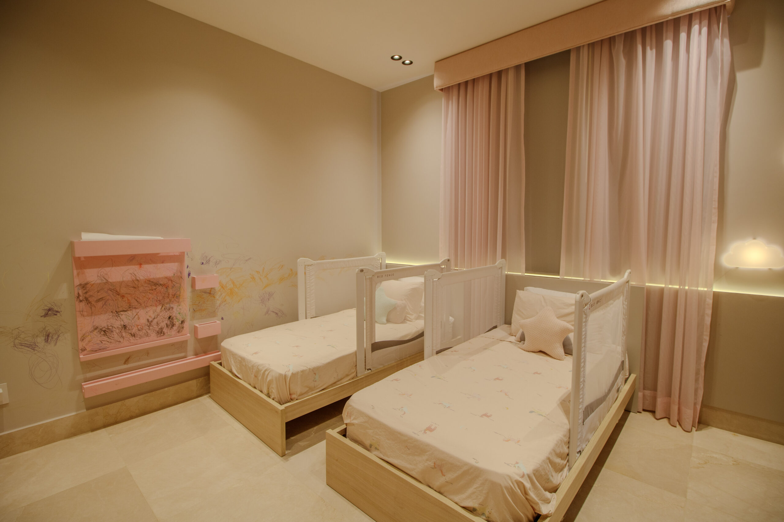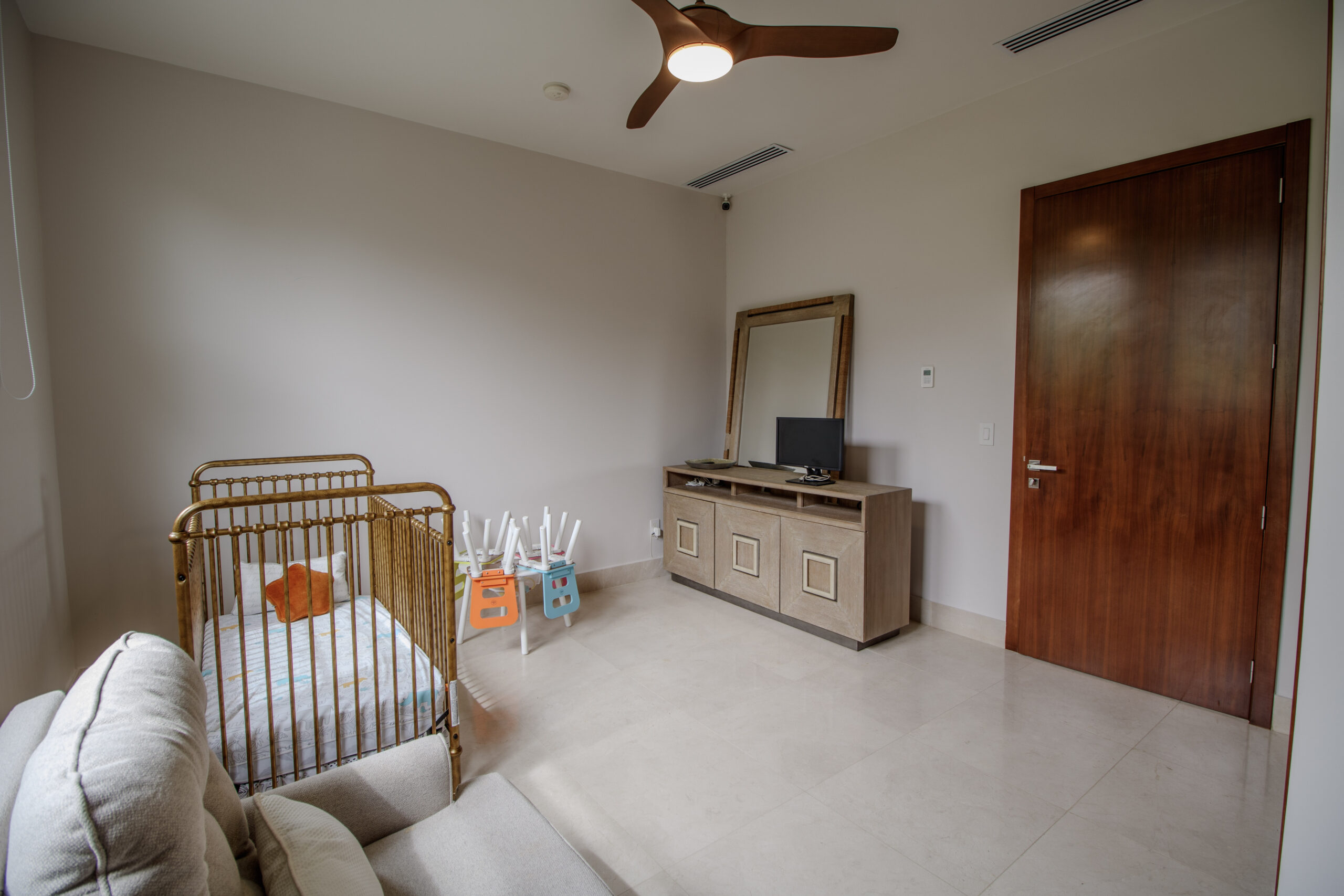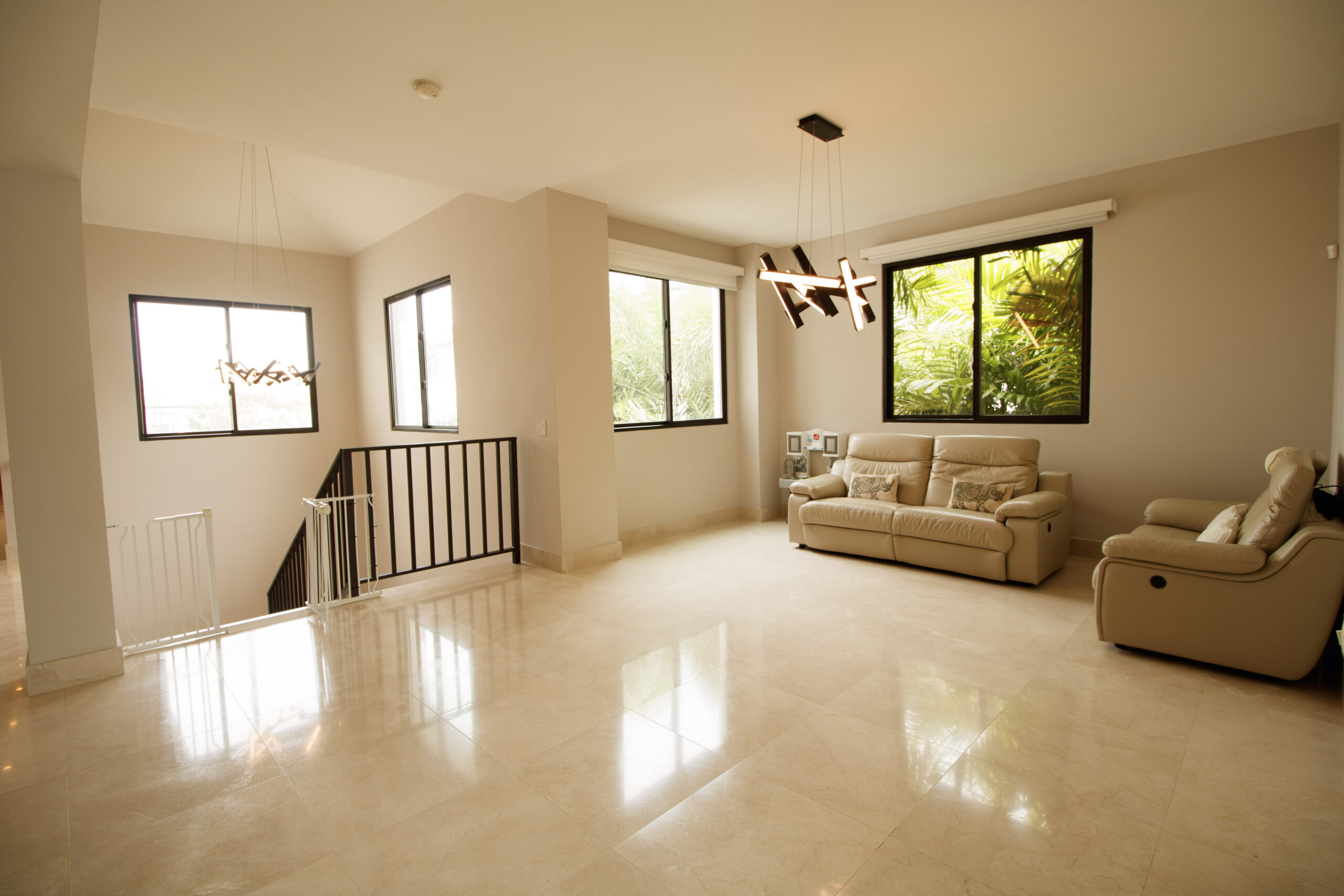 Las recámaras se encuentran en el segundo piso, lo que mantiene las áreas privadas separadas de la zona social principal. Cada recámara cuenta con su propio baño y clósets empotrados, manteniendo una distribución ordenada y funcional. Además, hay un pequeño descanso en la parte superior de las escaleras que funciona bien como rincón de lectura, espacio de TV o área de descanso tranquila.