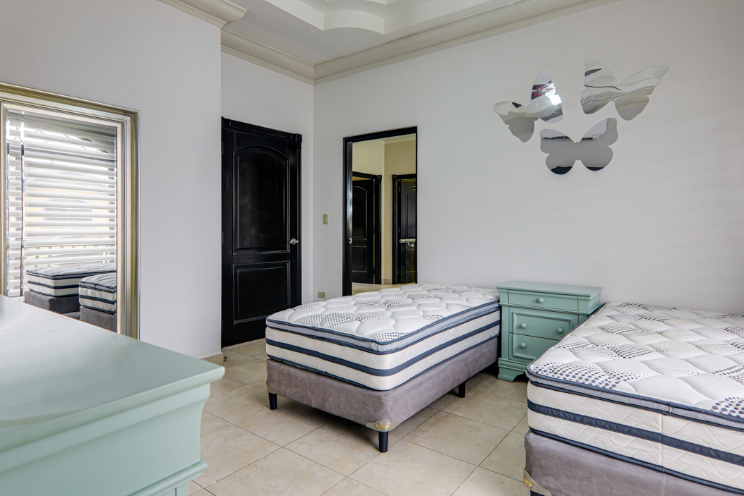 En la planta alta, un vestíbulo central conecta cuatro recámaras, cada una con su propio baño y con walk-in closet o clóset empotrado. Este espacio central también se puede usar como sala familiar, rincón de lectura o área de estudio. Otros detalles incluyen una elegante escalera con barandal de vidrio, techos altos, unidades de aire acondicionado tipo split, abanicos de techo y acabados sólidos en toda la casa. La propiedad está lista para mudarse.