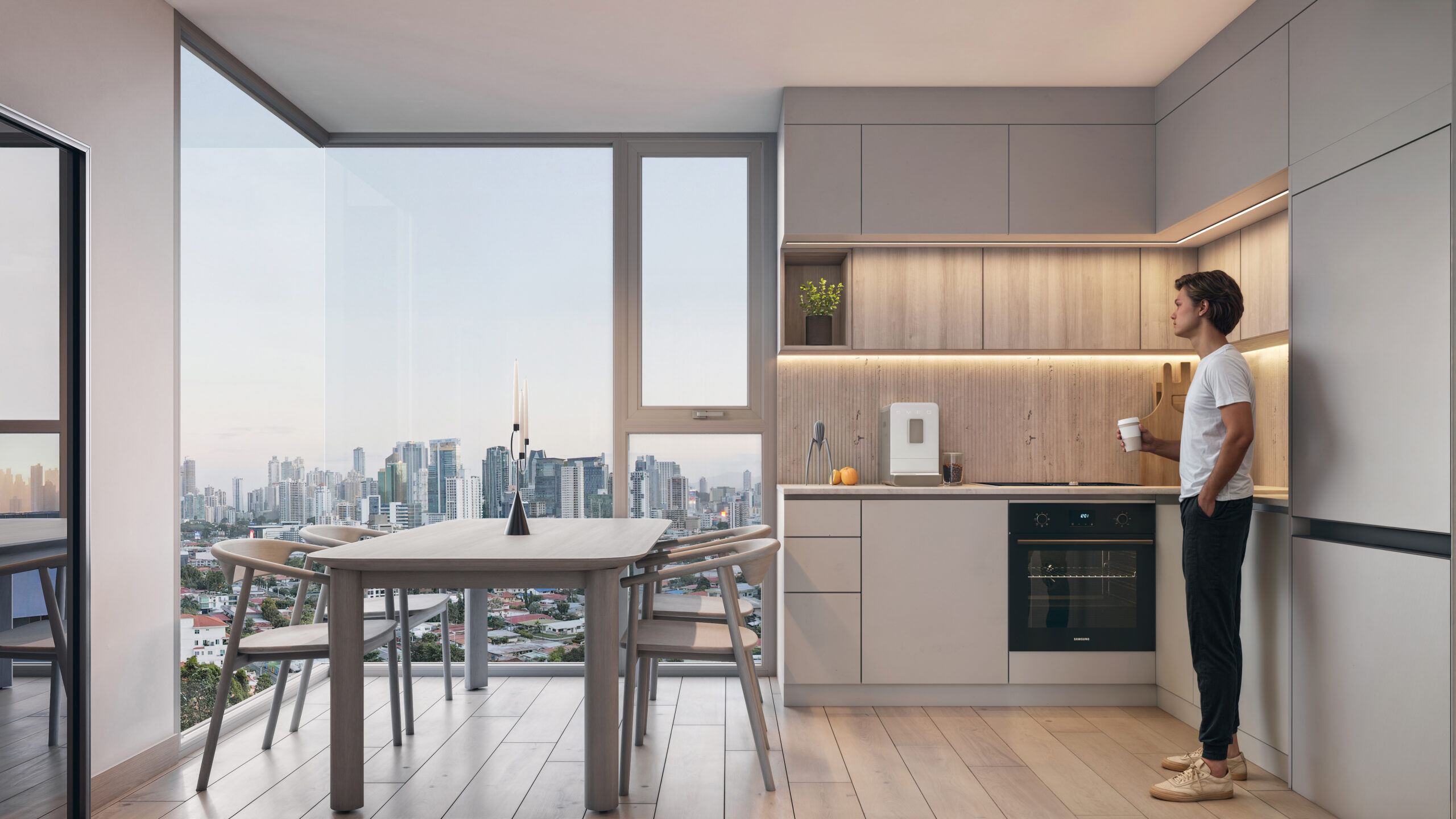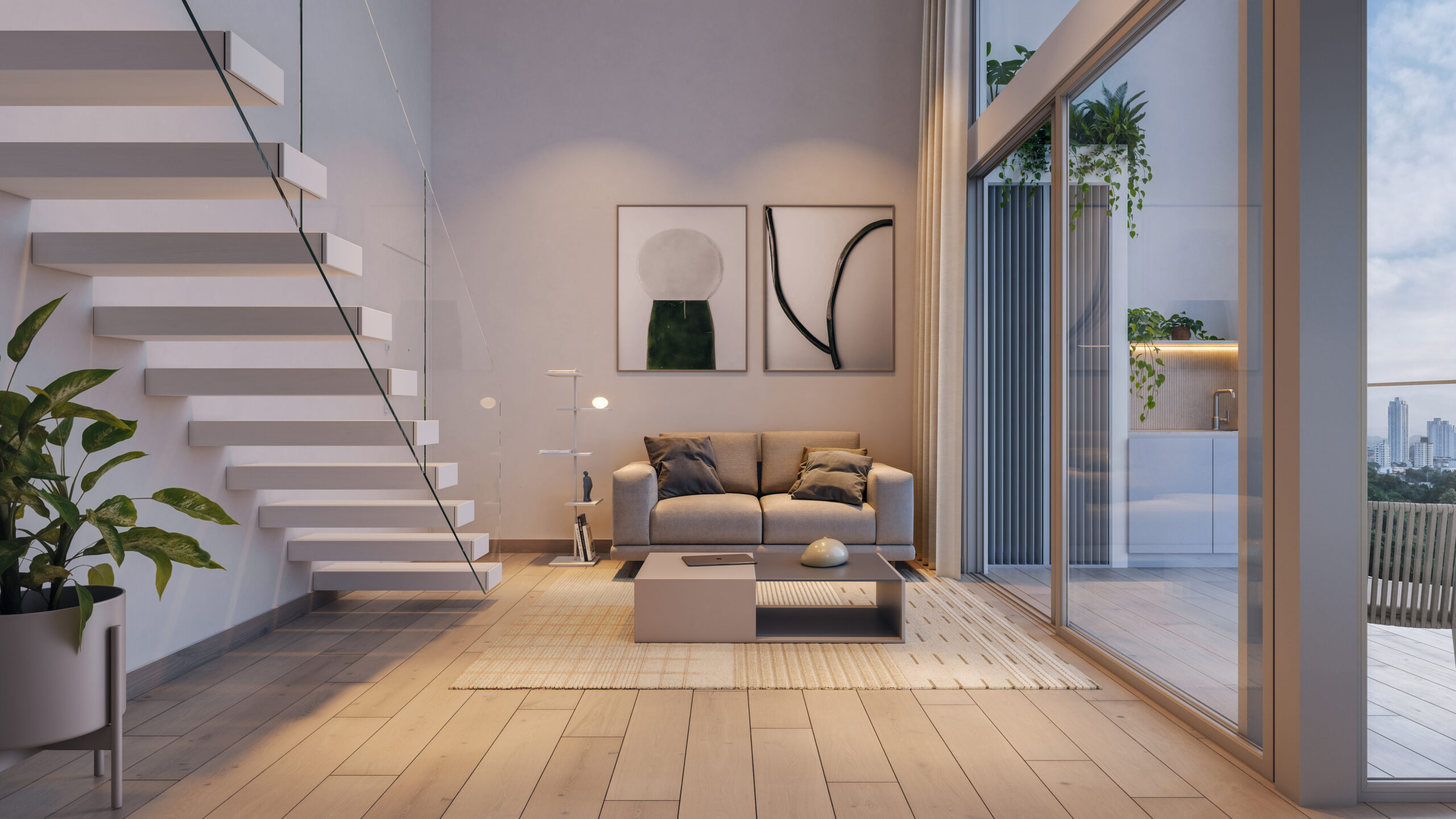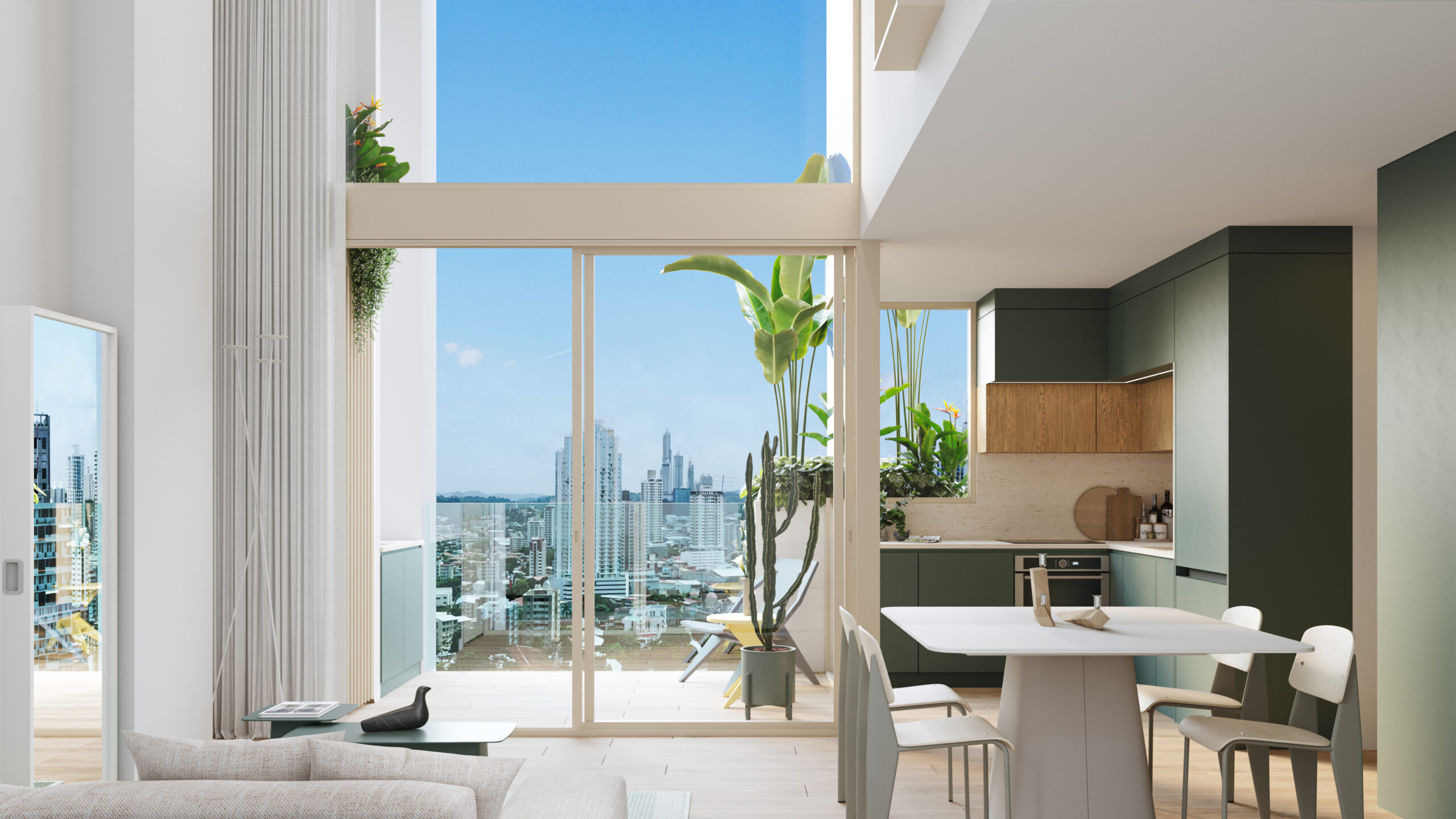 El diseño tipo loft separa el área de descanso del espacio principal de sala y comedor, manteniendo al mismo tiempo una sensación abierta y luminosa en todo el apartamento. Las ventanas de doble panel ayudan a mantener el apartamento silencioso y eficiente en el consumo de energía, mientras que la cocina cuenta con gabinetes de inspiración italiana y acabados de calidad que reflejan las raíces de diseño del edificio.