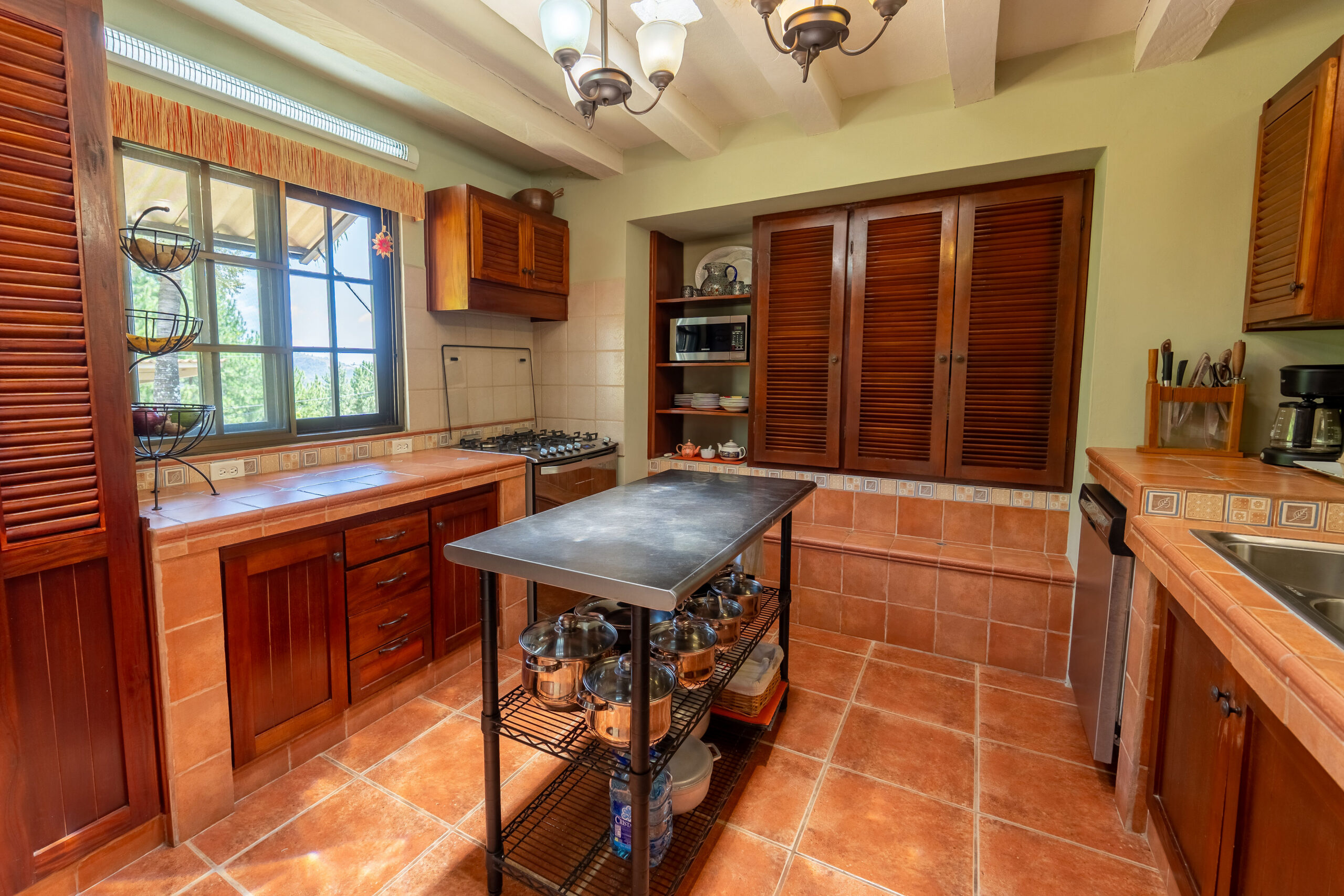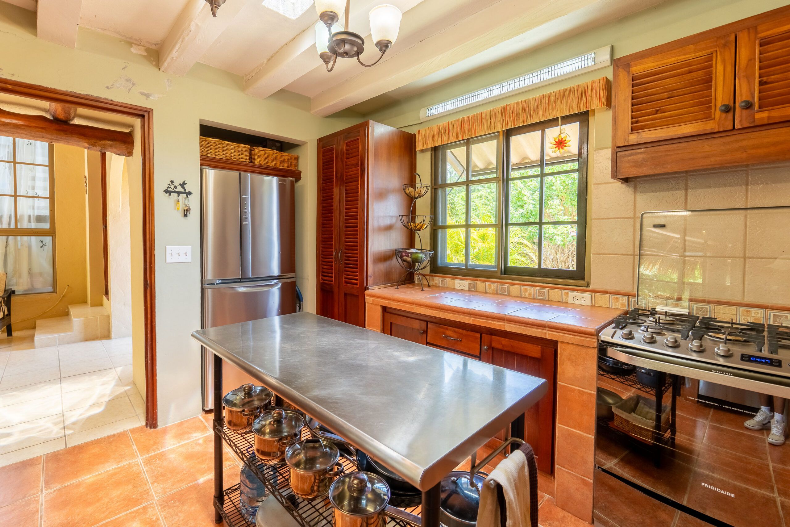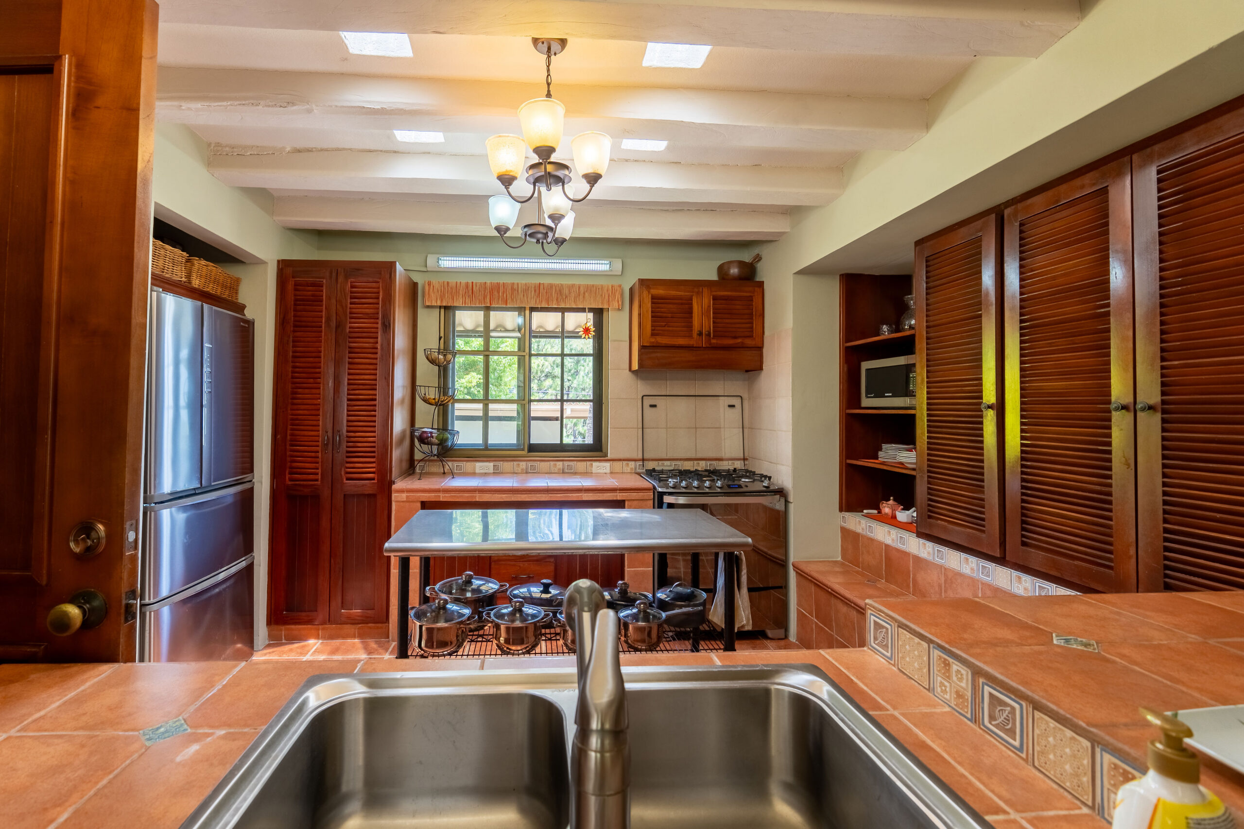 La cocina está totalmente equipada y conectada a una barra y parrilla de barbacoa de gas con mucho espacio para sentarse.