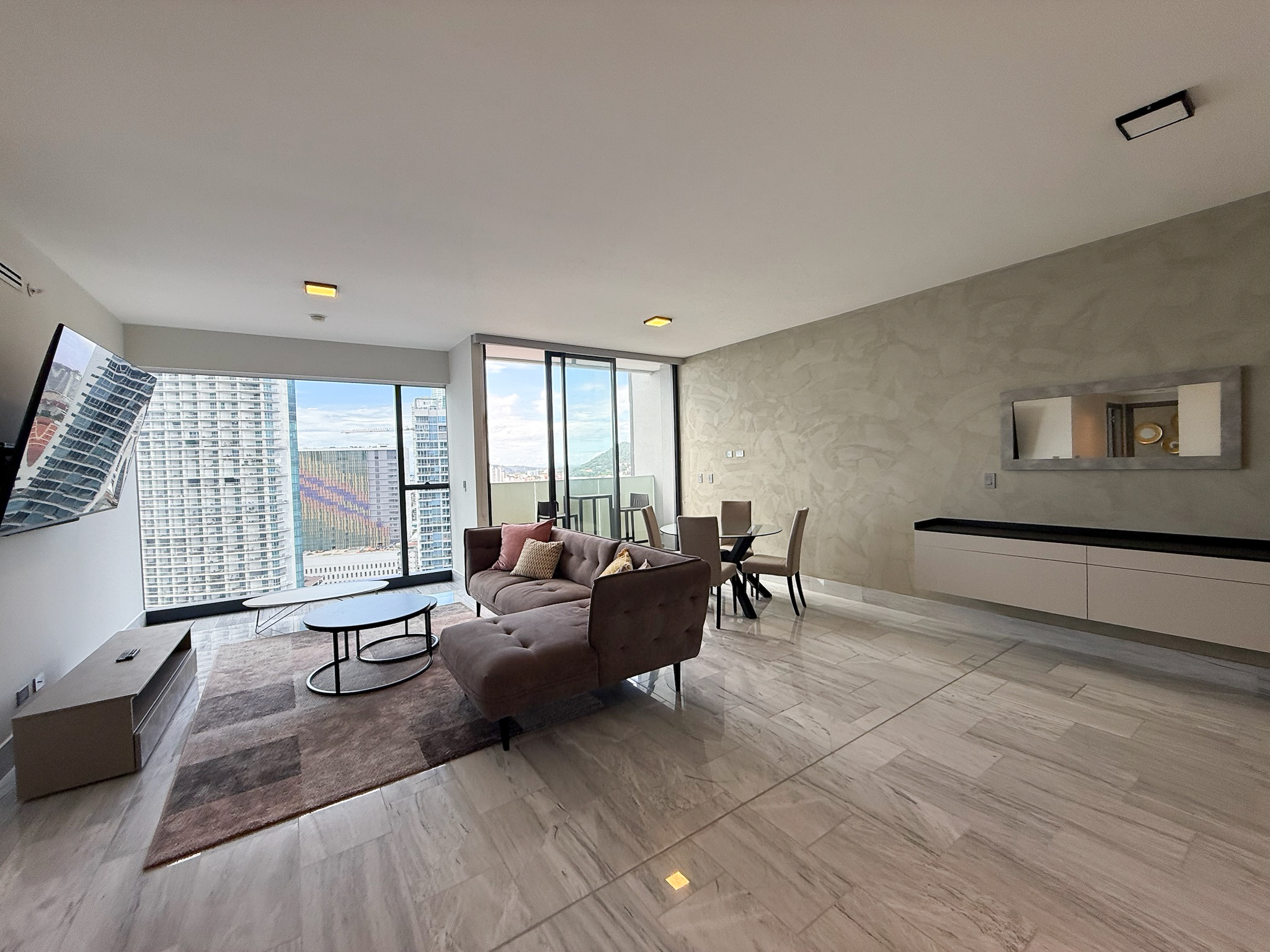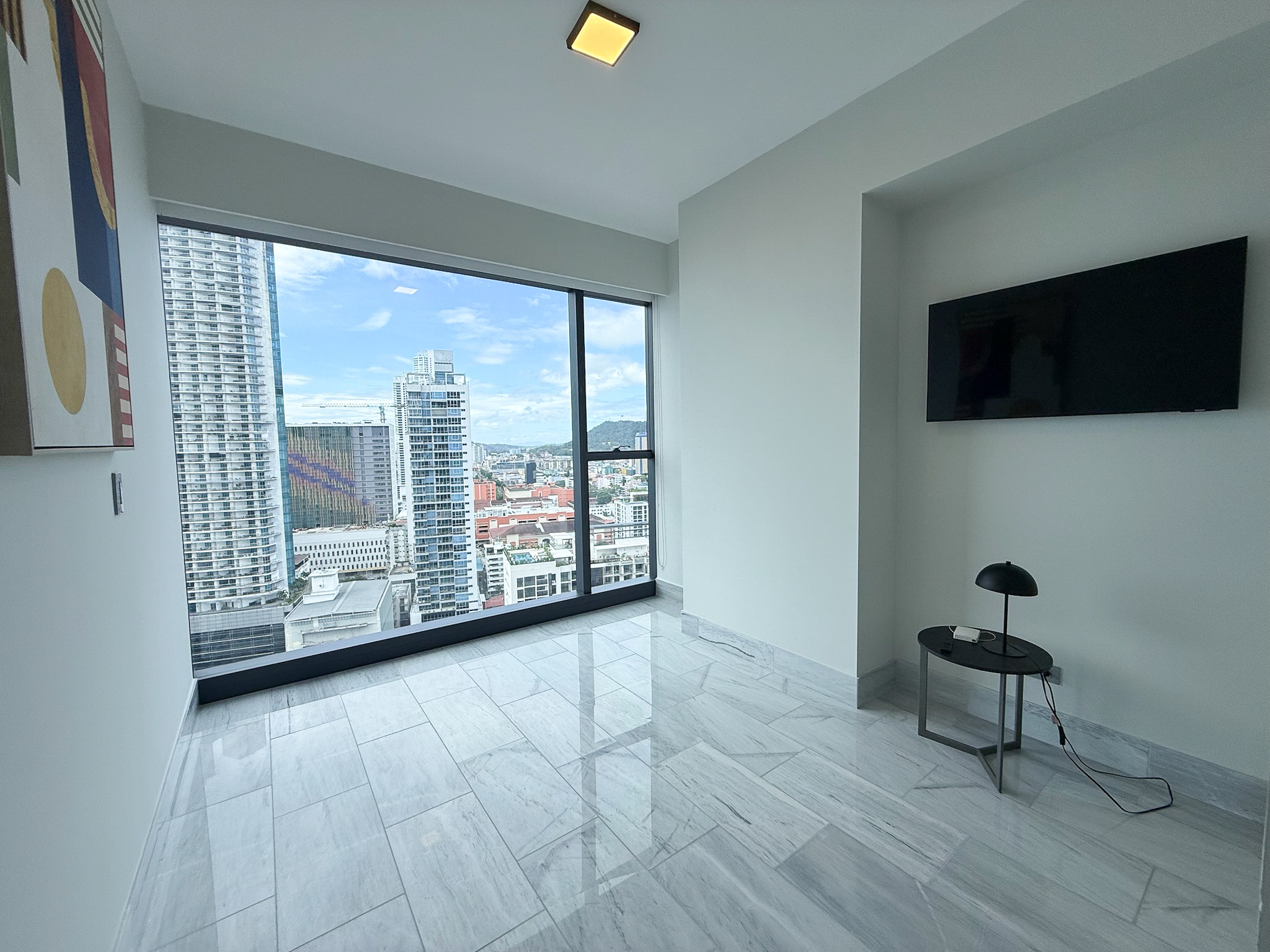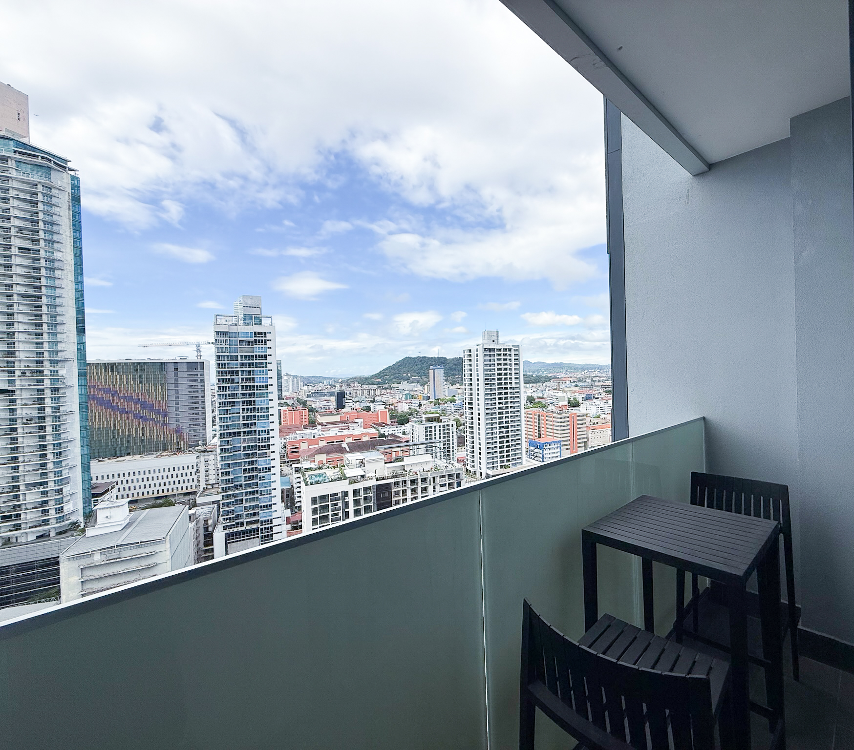 Ubicado en el piso 22, este apartamento de 123 metros cuadrados está distribuido de manera eficiente, aprovechando bien el espacio sin sentirse reducido. Las ventanas de piso a techo enmarcan vistas del skyline de la Ciudad de Panamá, con vistas parciales al Océano Pacífico al fondo.