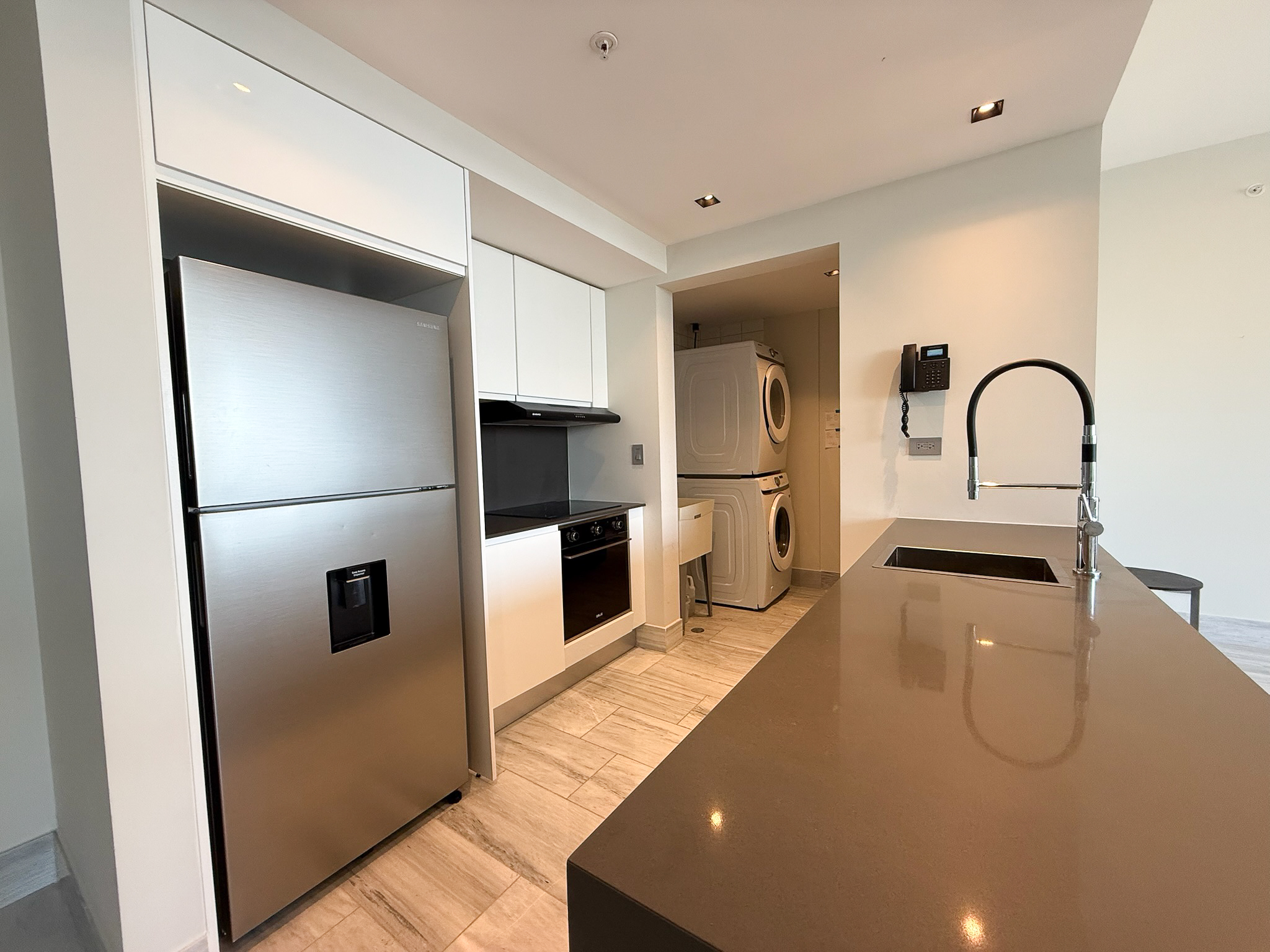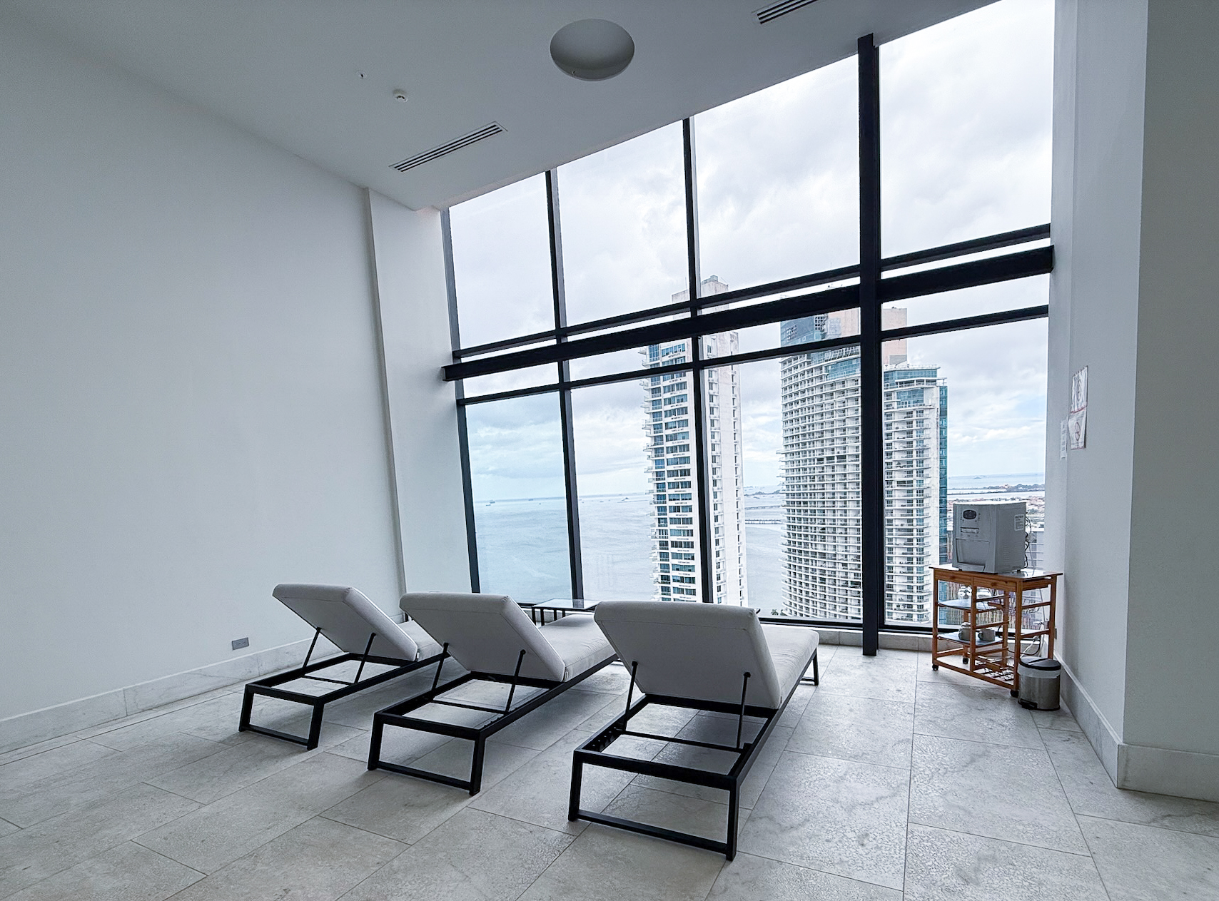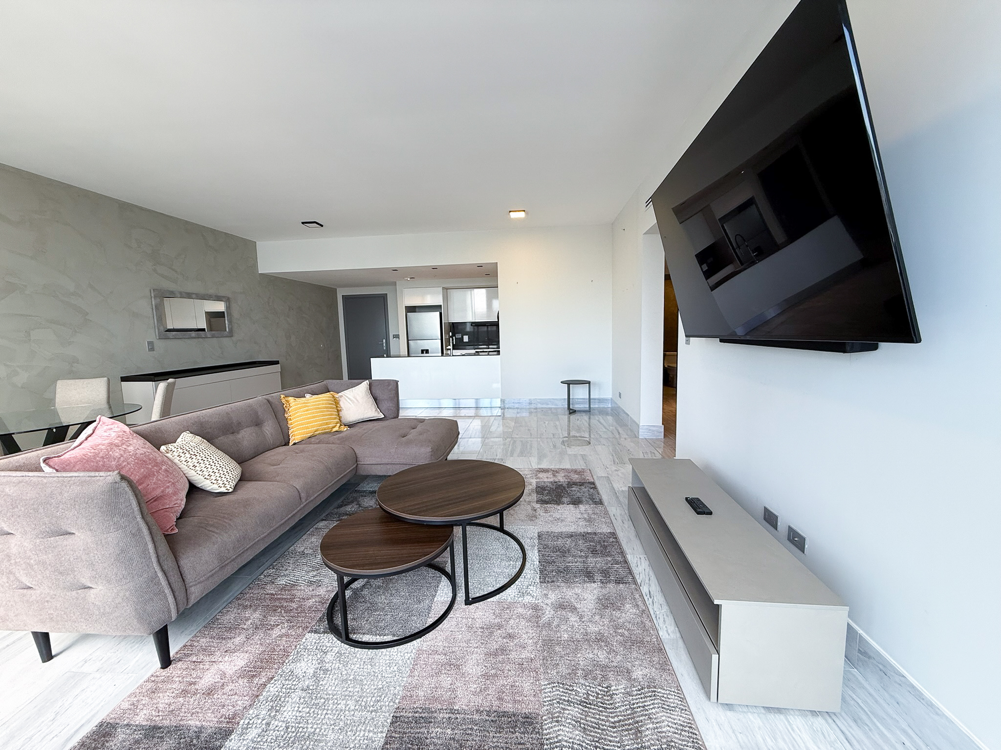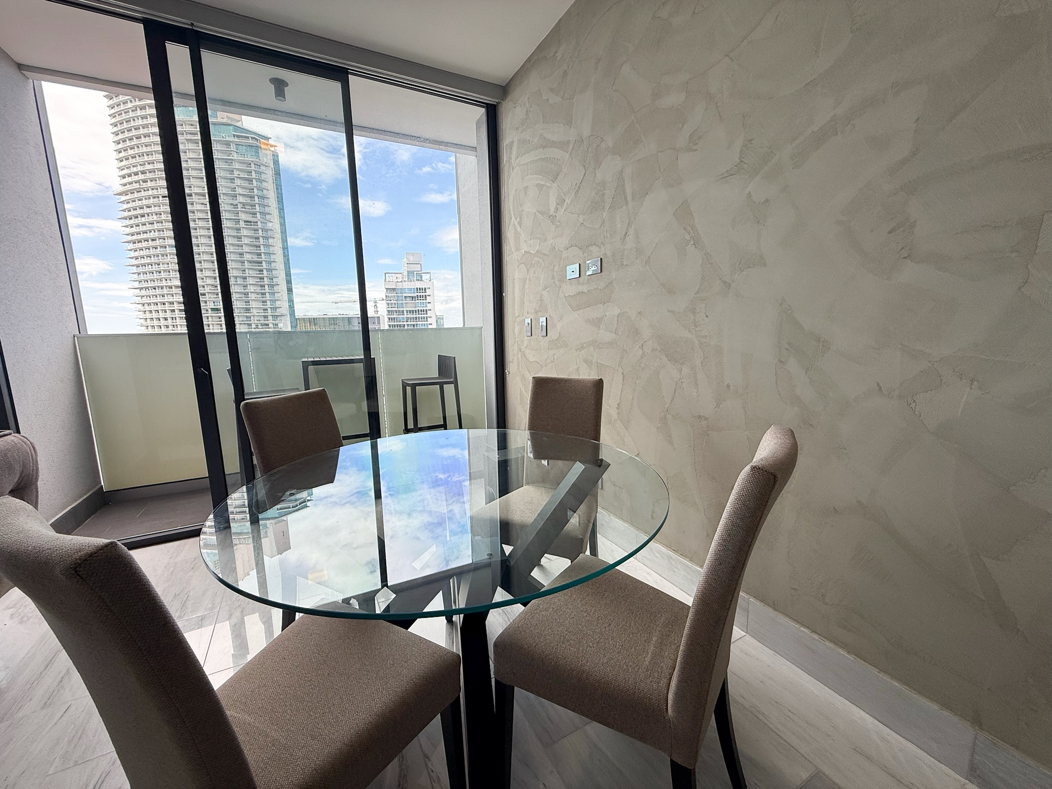 Ubicado en el piso 22, este apartamento de 123 metros cuadrados está distribuido de manera eficiente, aprovechando bien el espacio sin sentirse reducido. Las ventanas de piso a techo enmarcan vistas del skyline de la Ciudad de Panamá, con vistas parciales al Océano Pacífico al fondo.