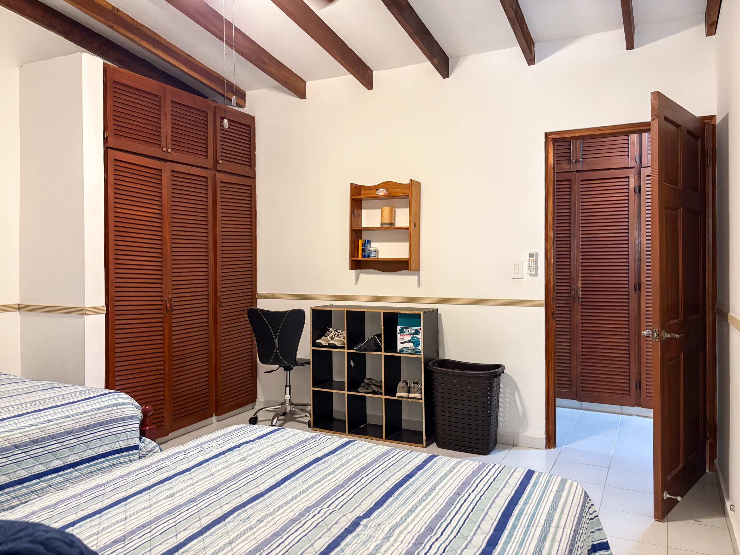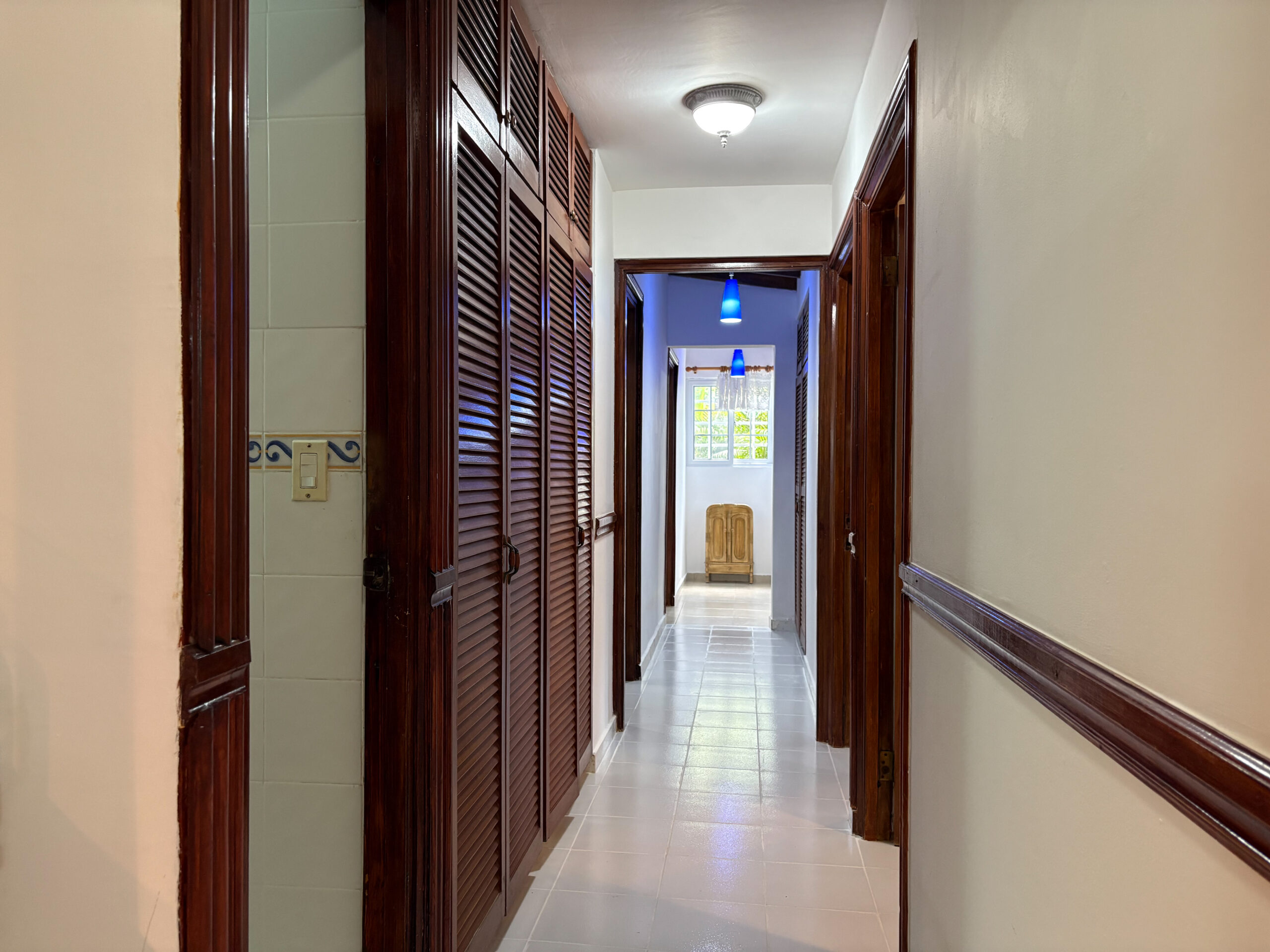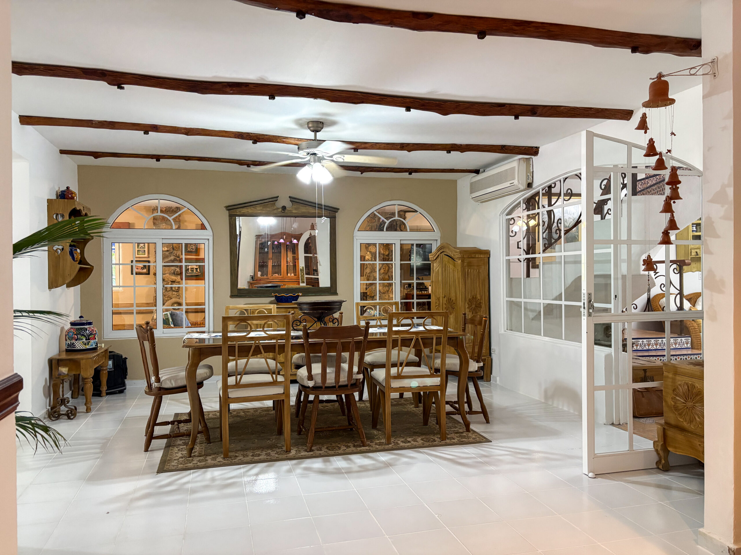 Al entrar, te recibe un vestíbulo que conduce a la planta alta, donde se encuentra la recámara principal con baño privado, que incluye una sala de TV y una terraza con vista al patio trasero. En la planta baja encontrarás cinco recámaras, dos salas familiares, una cocina y un comedor.