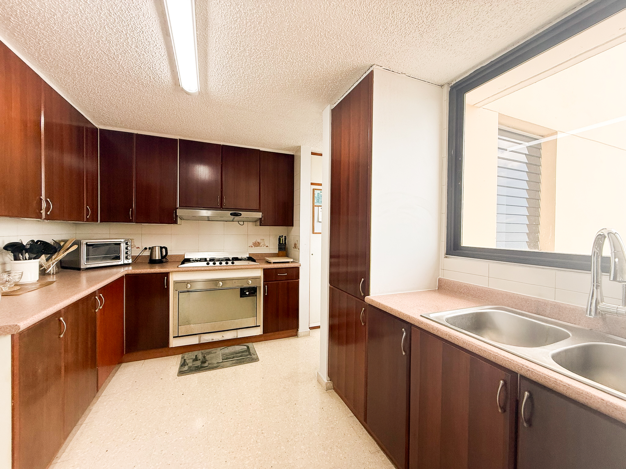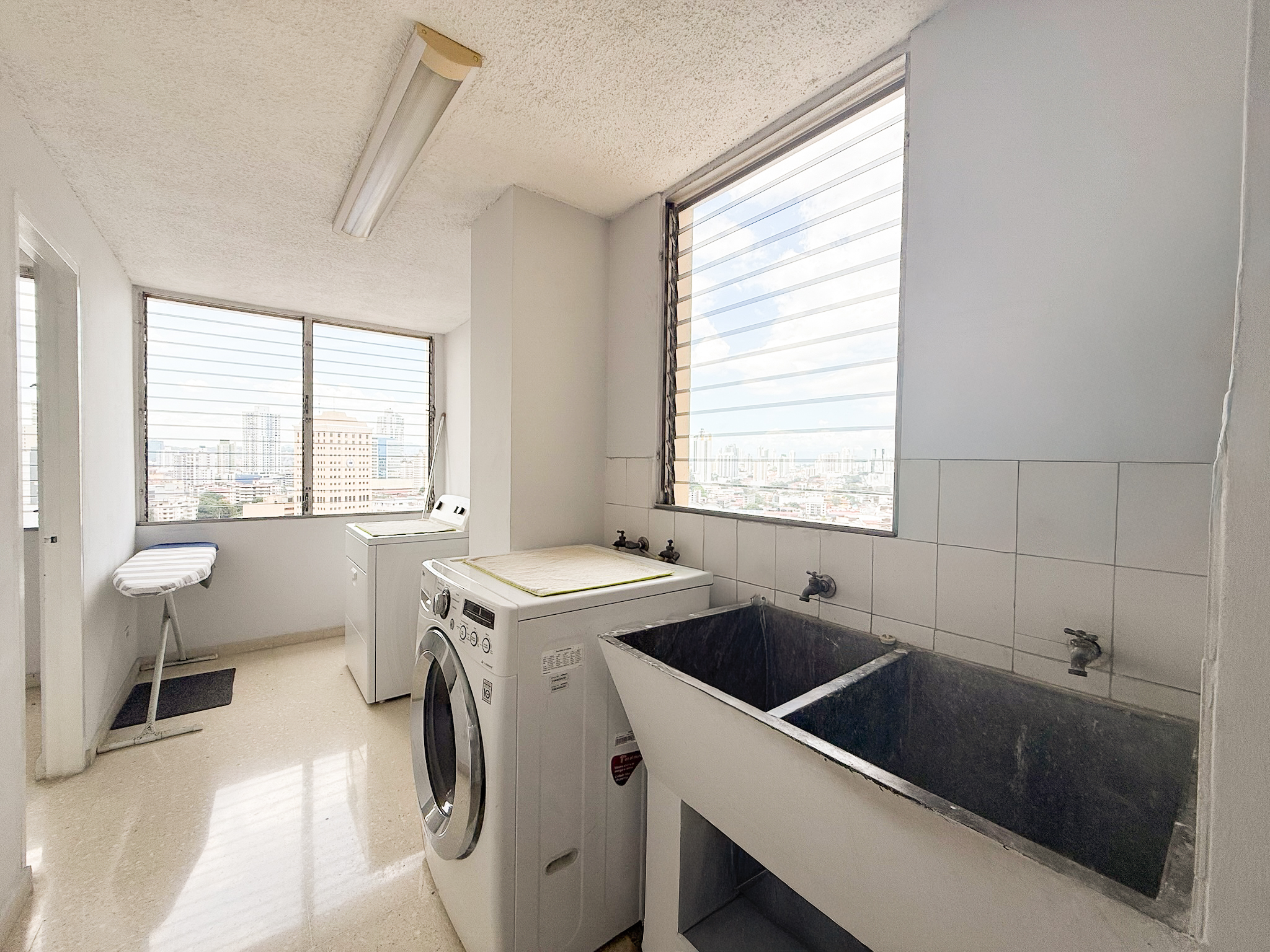 An entrance hallway leads into a well-sized living and dining area with city views and enough space to comfortably set up both areas without overlap. The kitchen is closed and connects to a laundry area and maid’s room that includes a small bathroom. Many owners have converted this into a studio bedroom.