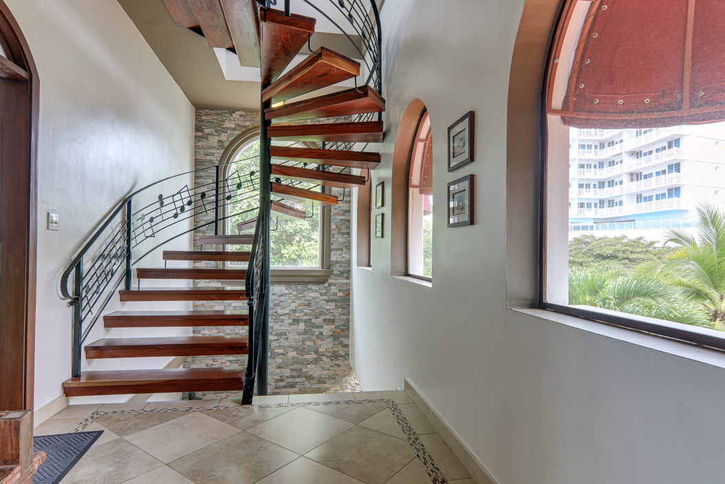 The building has a spiral staircase leading up to the floors and a rooftop terrace.