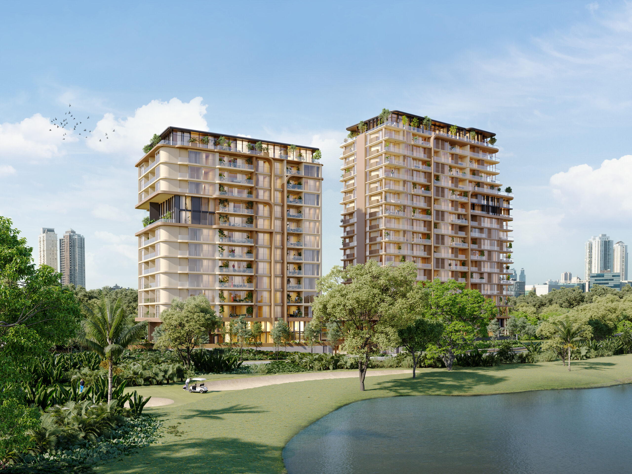 The development borders six holes of the Santa María Golf Course, which means most residences enjoy open views of greenery and lakes instead of nearby towers.