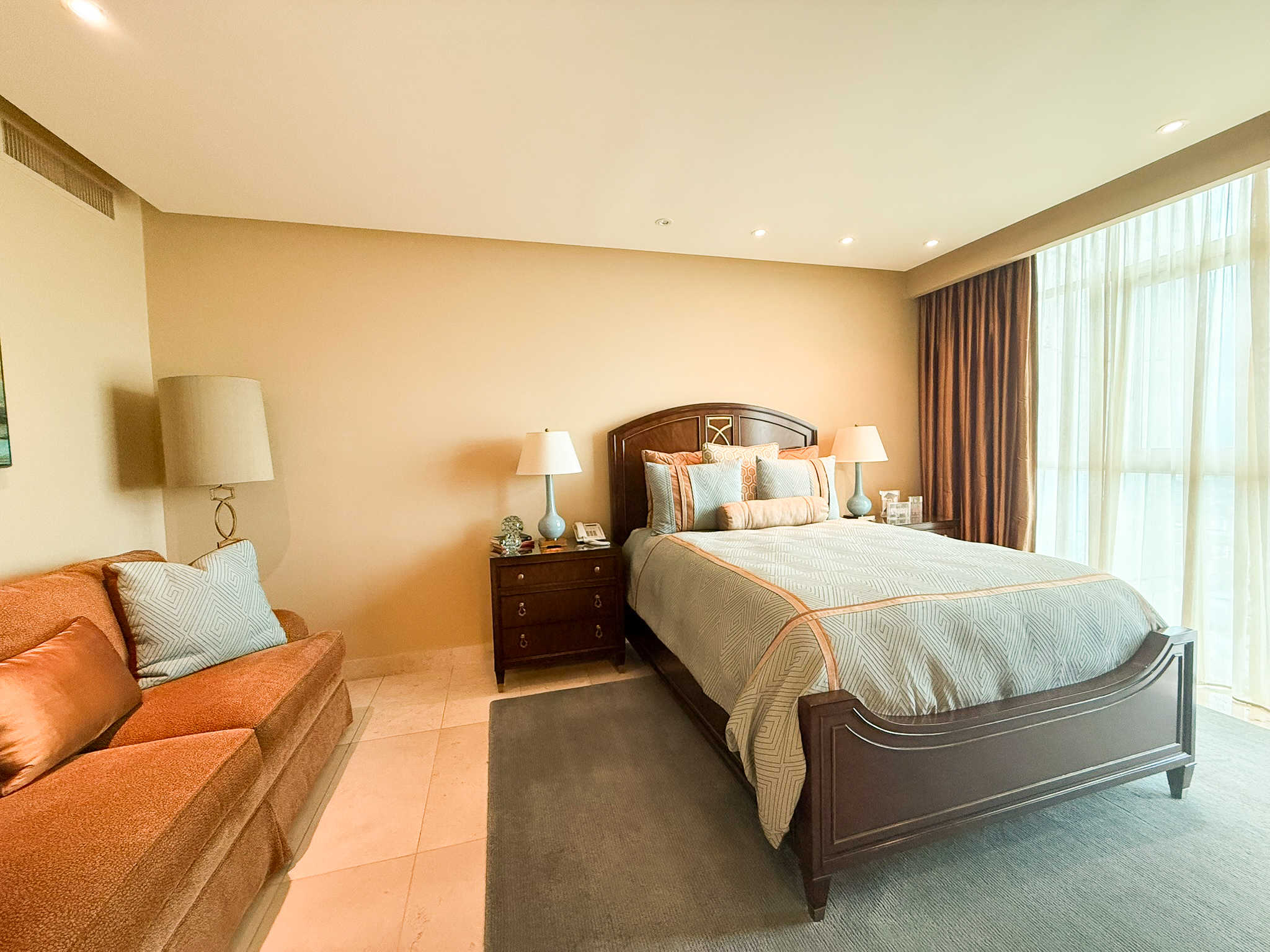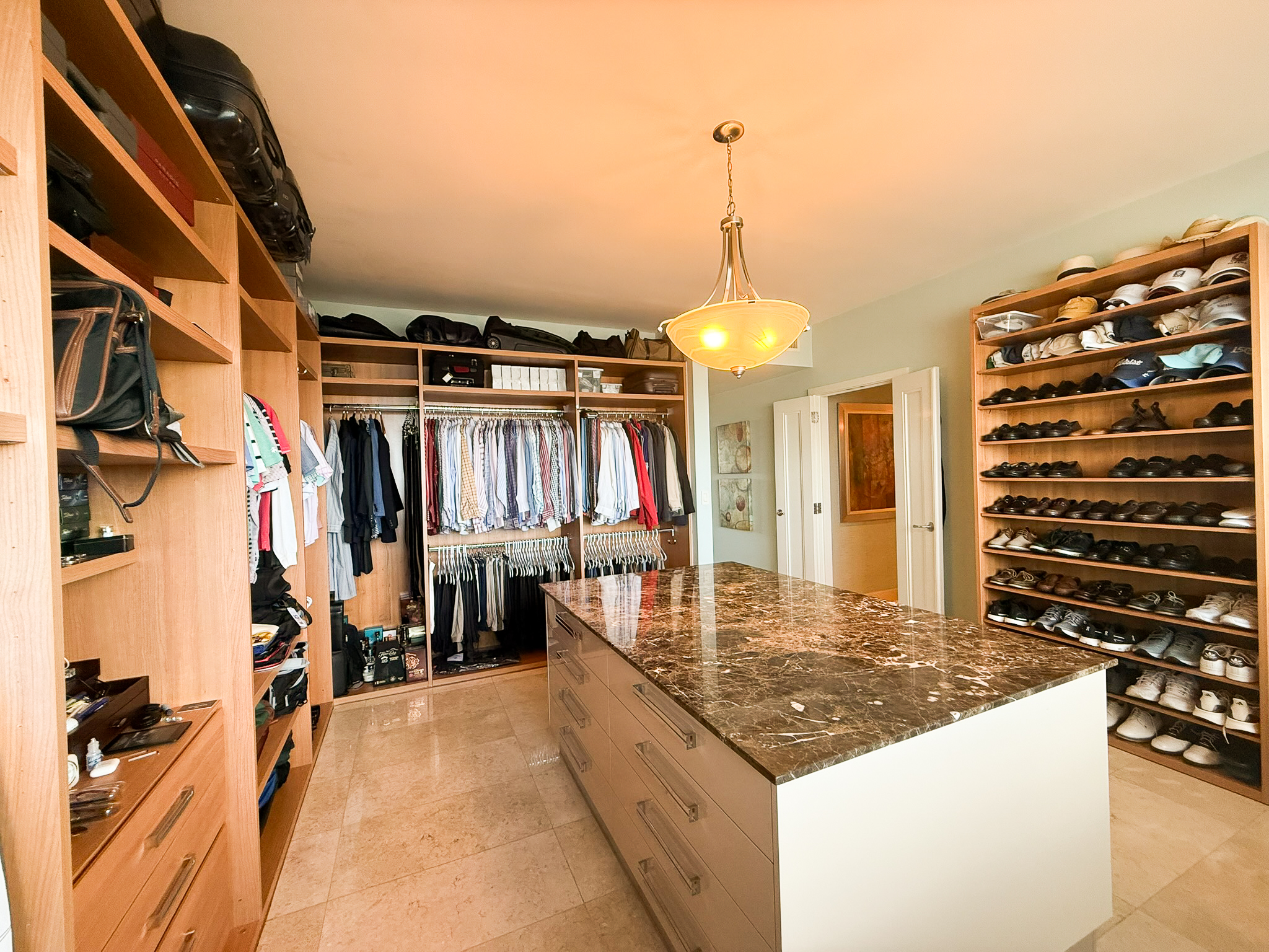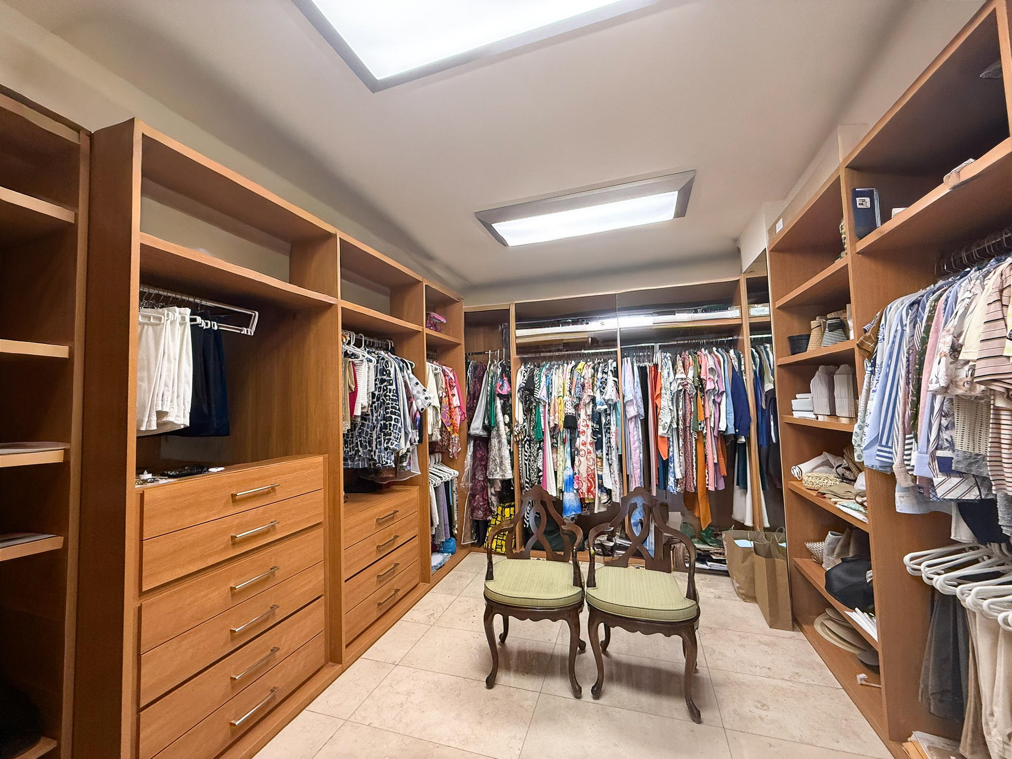 Each bedroom includes walk-in closets and motorized curtains. The primary suite is set apart from the rest of the home and features his and hers walk-in closets, each with its own bathroom, giving the main bedroom a sense of privacy and independence.