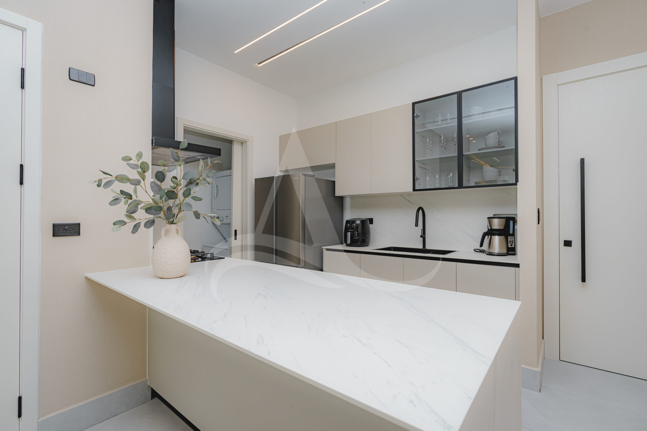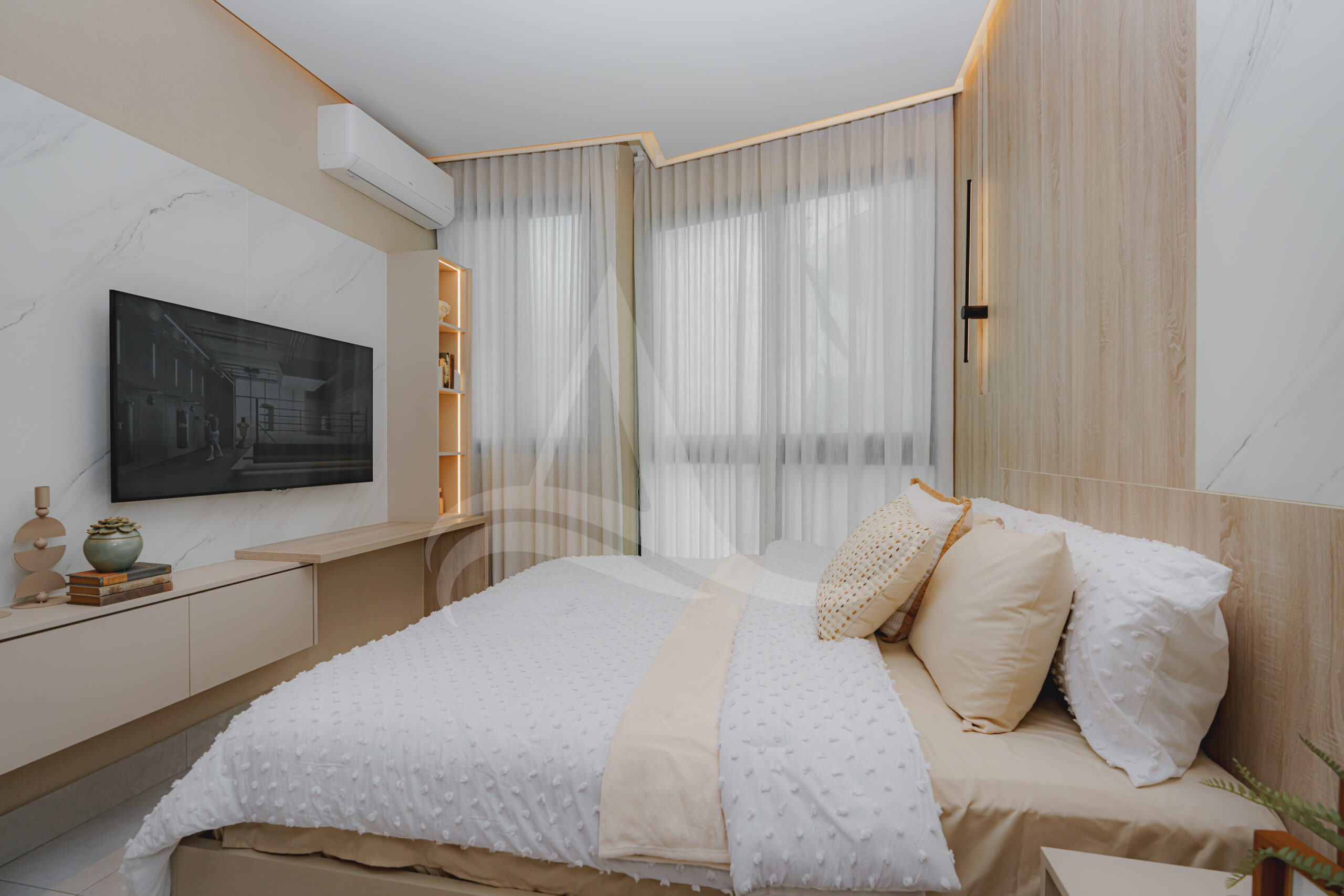 The bedroom is set slightly apart from the main living area, with a walk-in closet and its own bathroom, so it feels more private without being completely closed off. There’s also a separate laundry and service space, which adds some flexibility depending on how you use it.