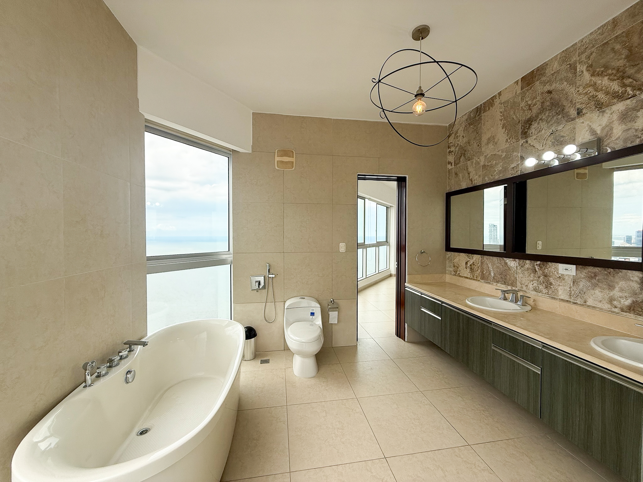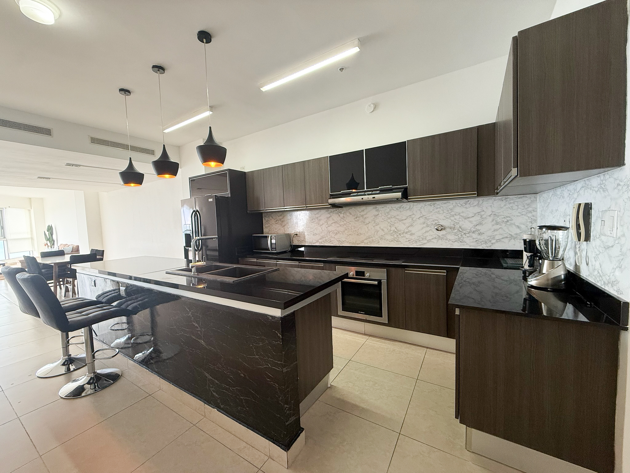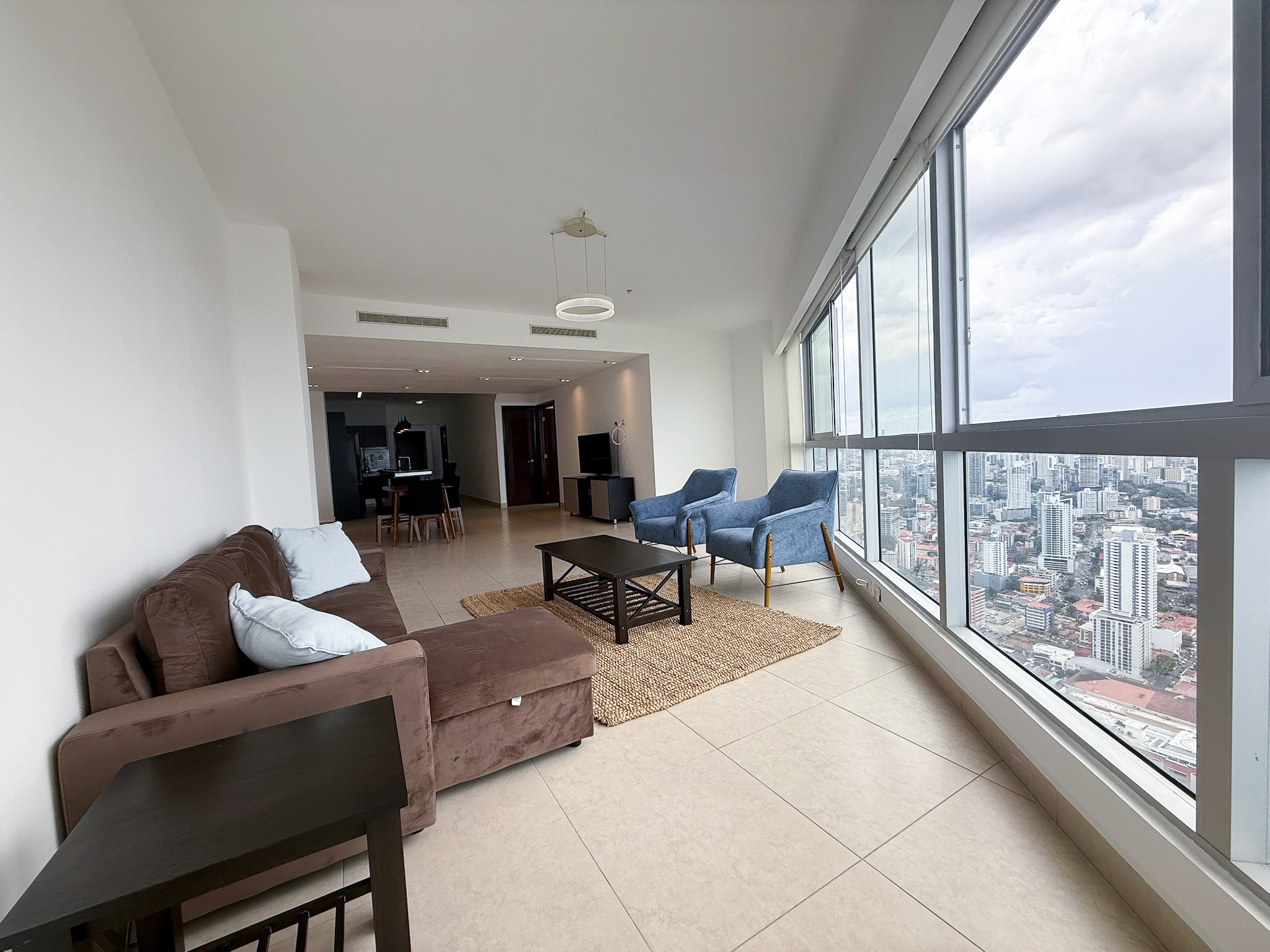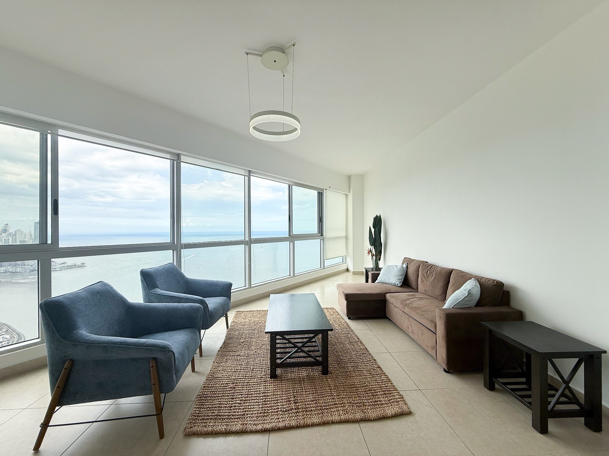 Fully furnished and move-in ready, the penthouse features an open layout with floor-to-ceiling windows overlooking the Pacific Ocean and Panama City skyline. The kitchen connects directly to the living and dining areas, creating a functional space that works well for both daily use and hosting, and includes a built-in dishwasher.