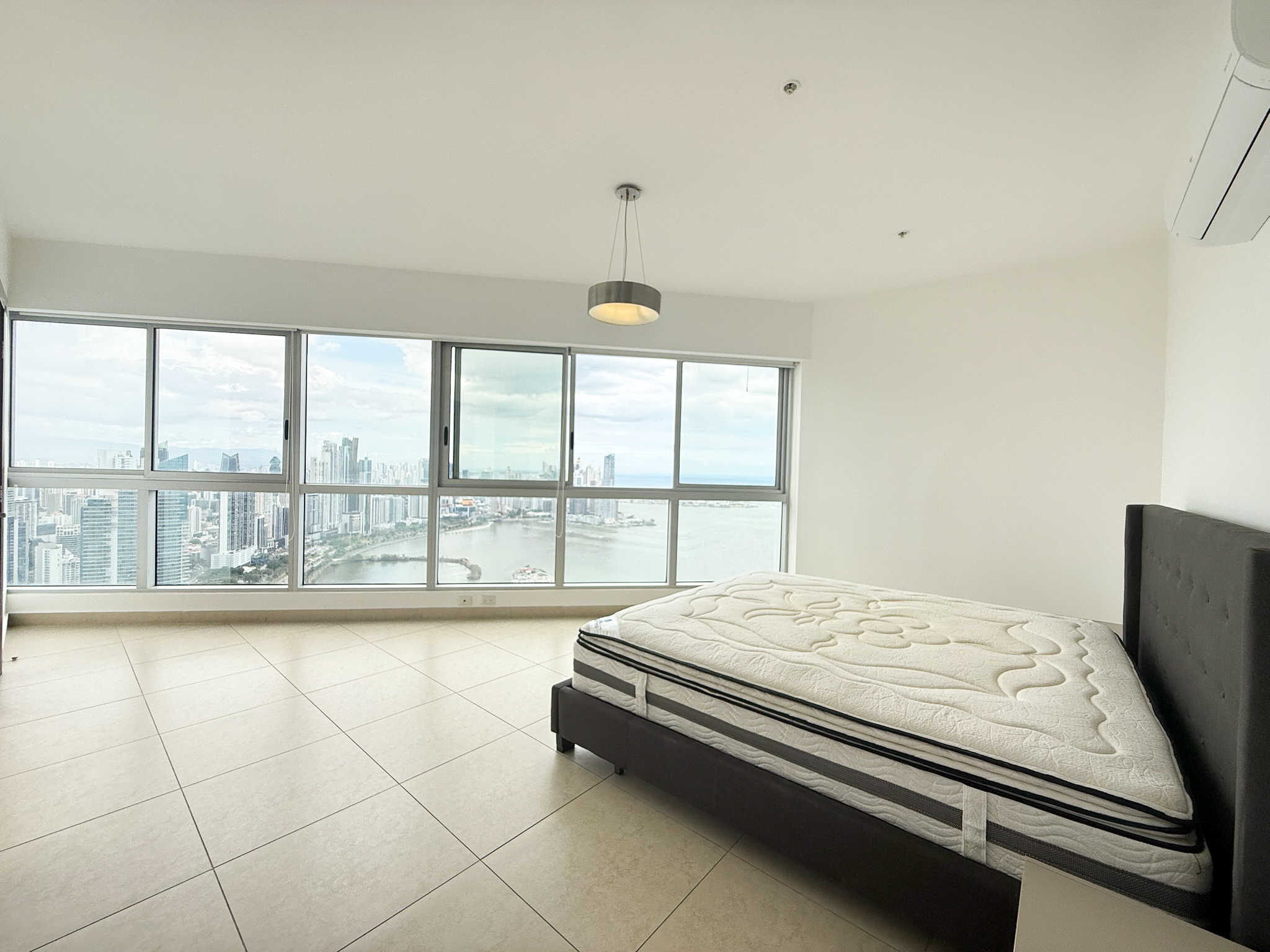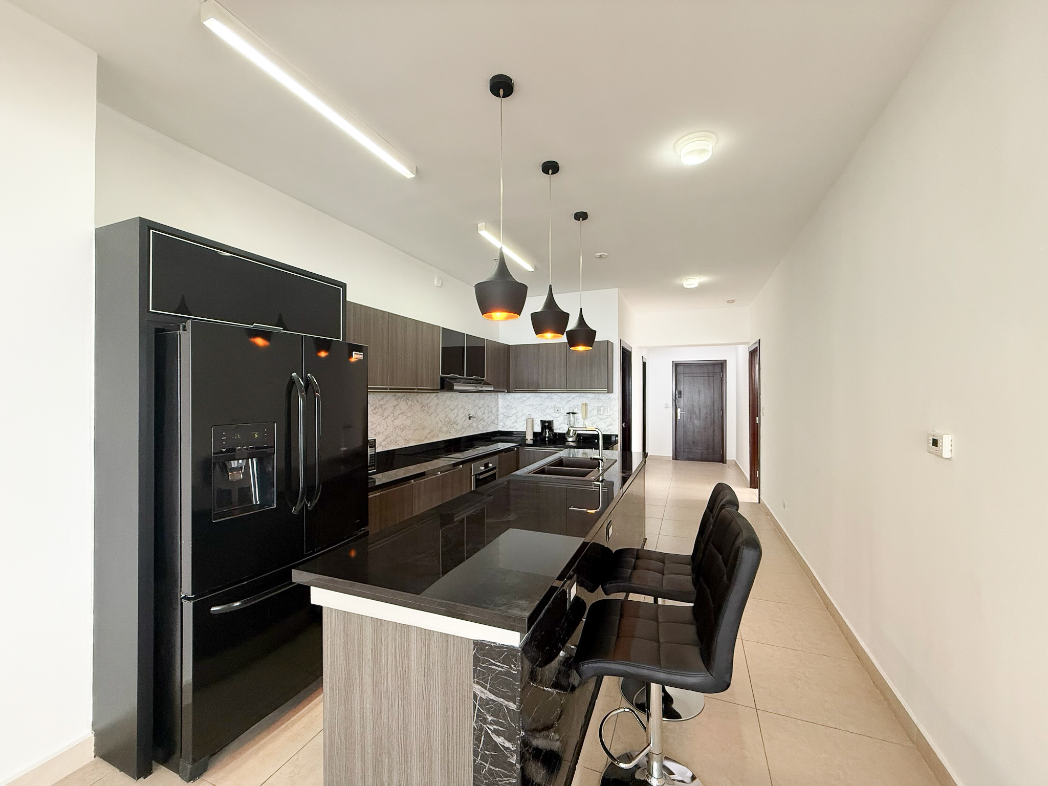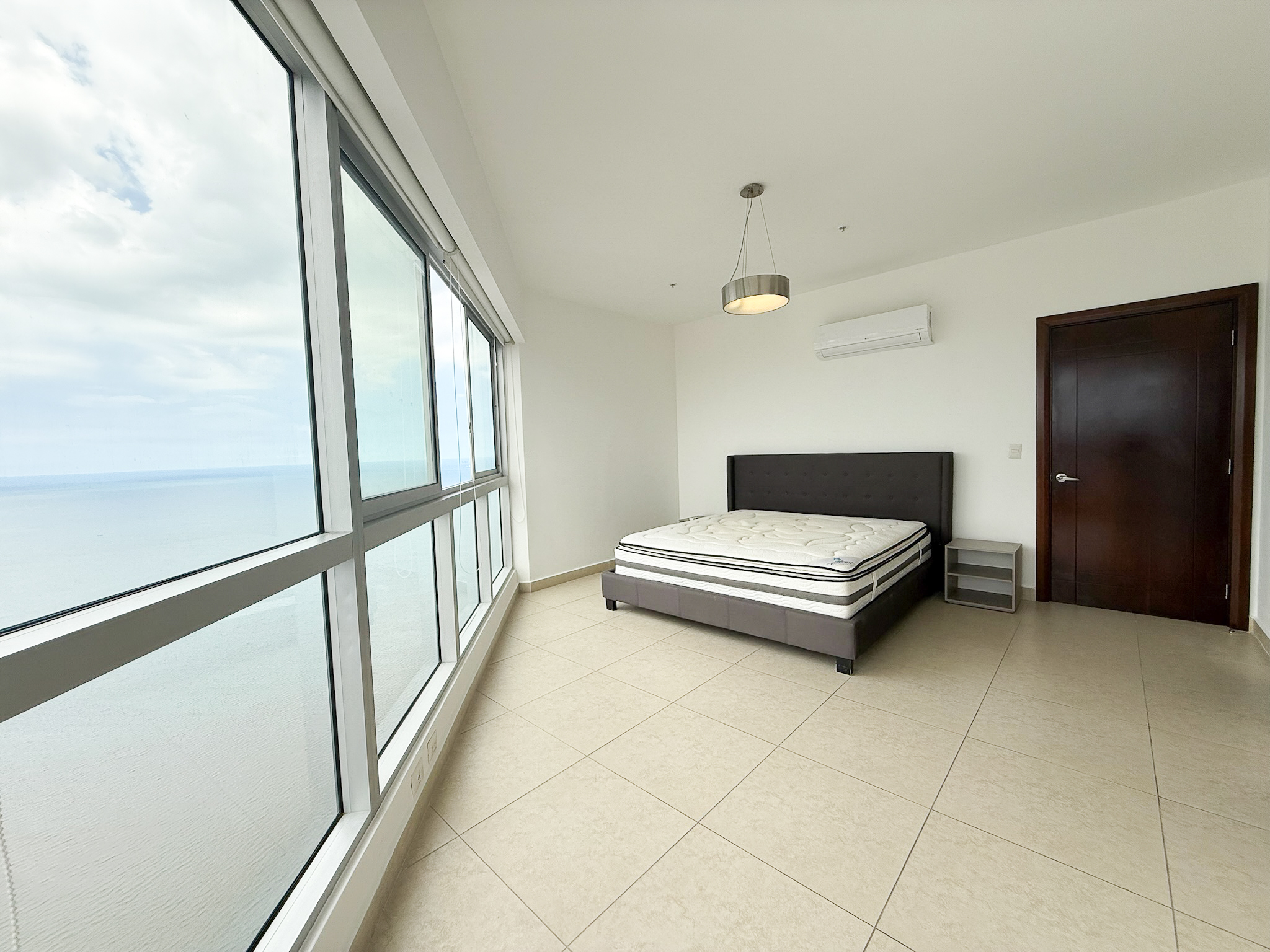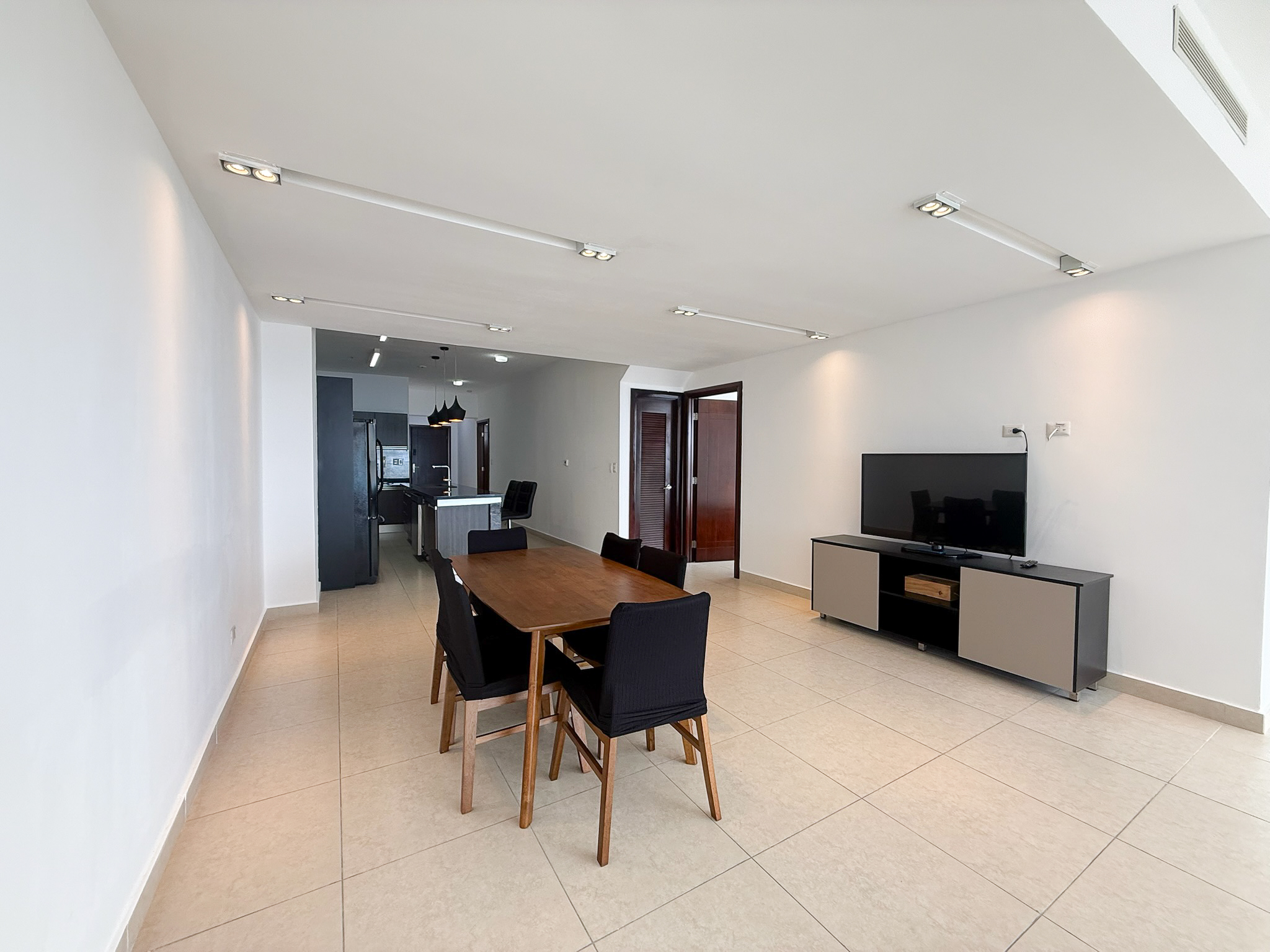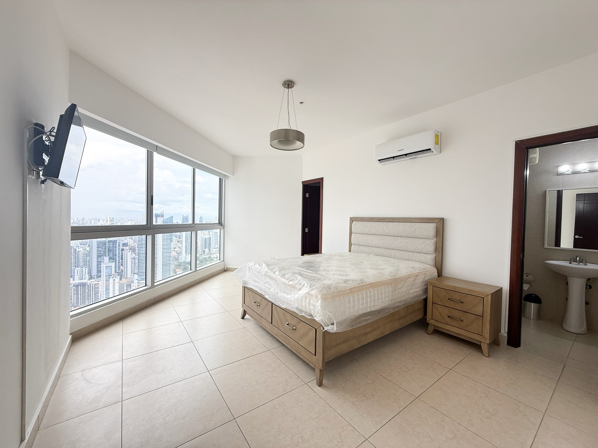 Fully furnished and move-in ready, the penthouse features an open layout with floor-to-ceiling windows overlooking the Pacific Ocean and Panama City skyline. The kitchen connects directly to the living and dining areas, creating a functional space that works well for both daily use and hosting, and includes a built-in dishwasher.