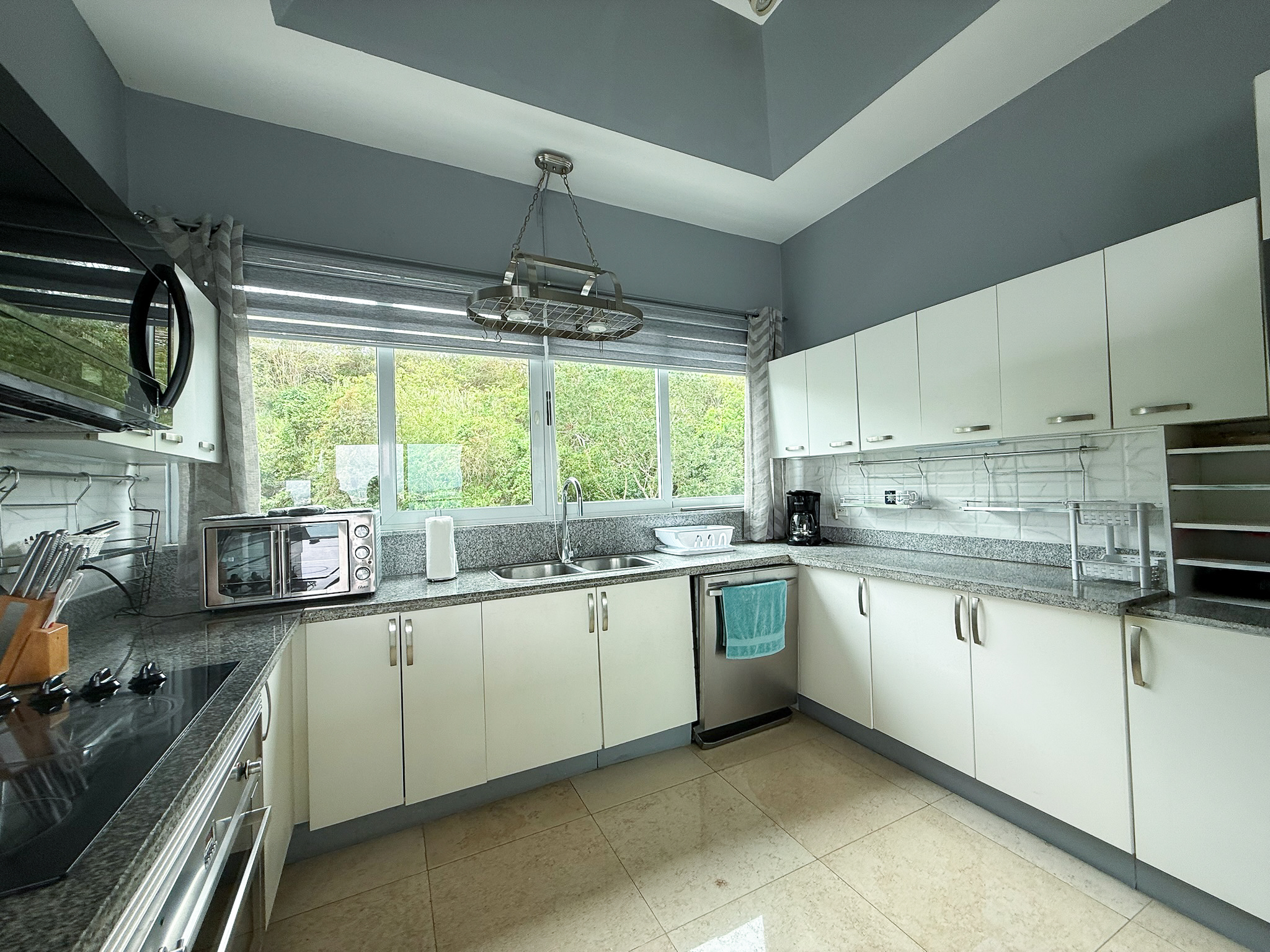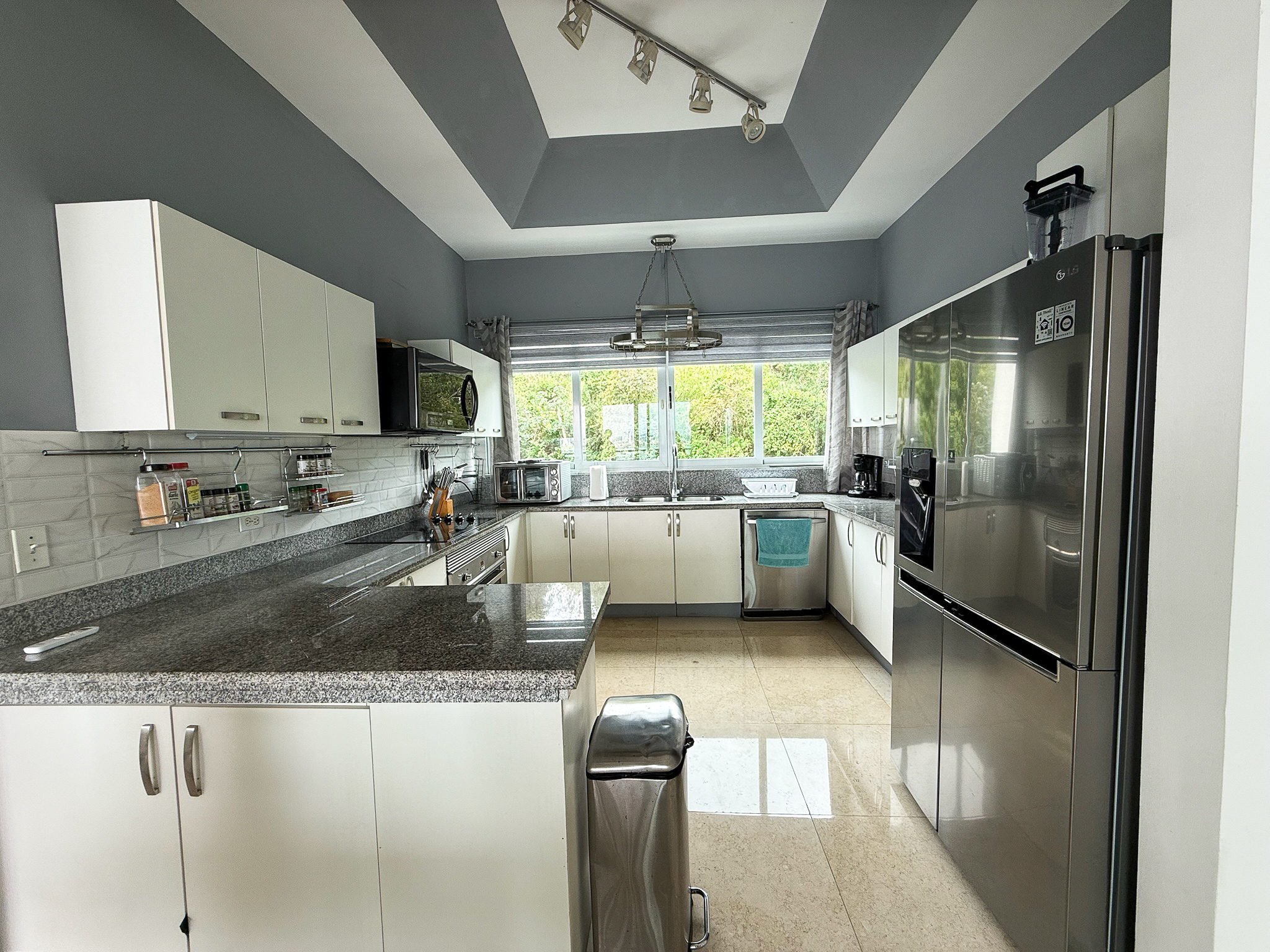 Living and dining areas connect easily and benefit from the ceiling height, creating a sense of space without wasted square meters. The open kitchen includes a breakfast bar, granite countertops, and comes fully equipped with all appliances.