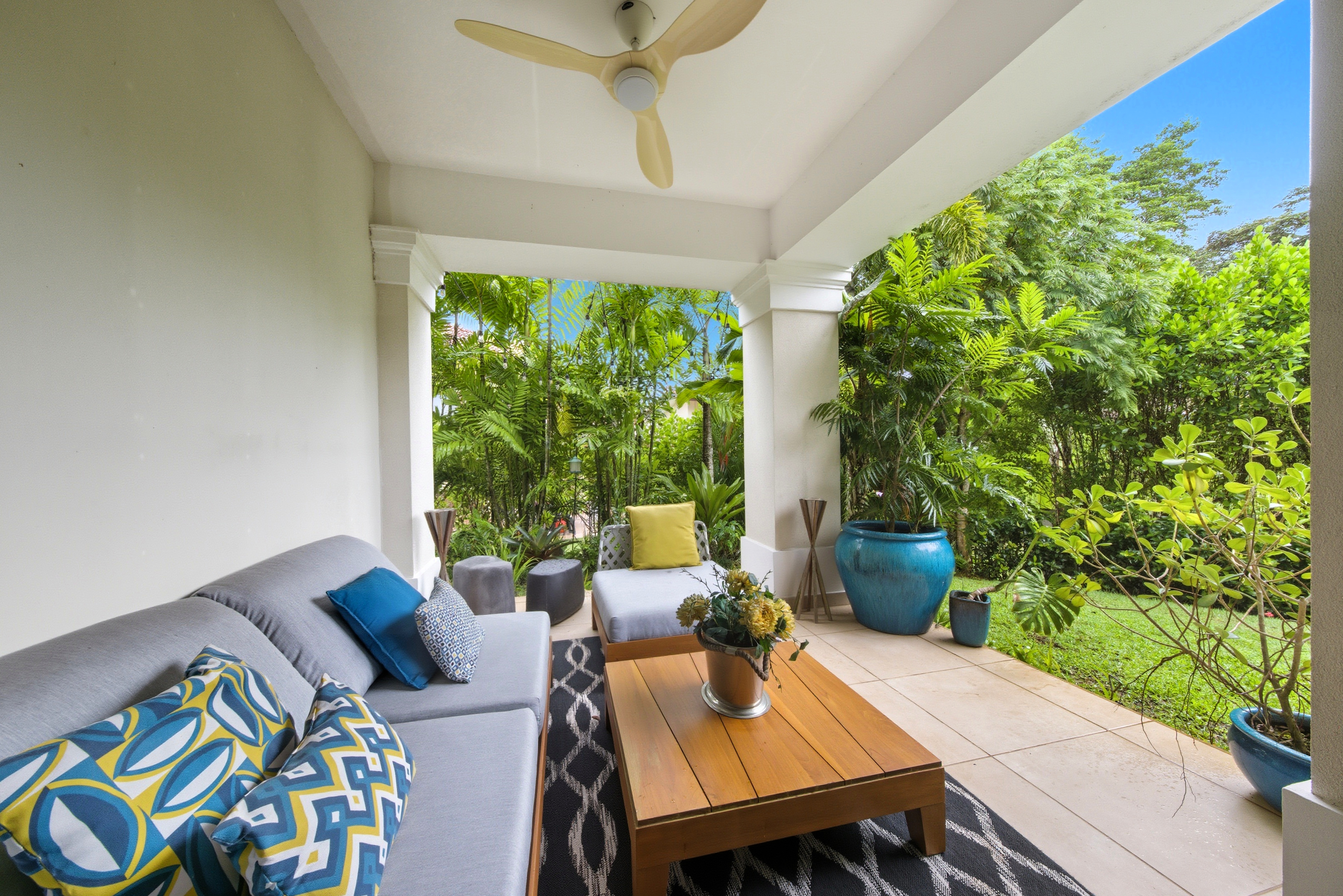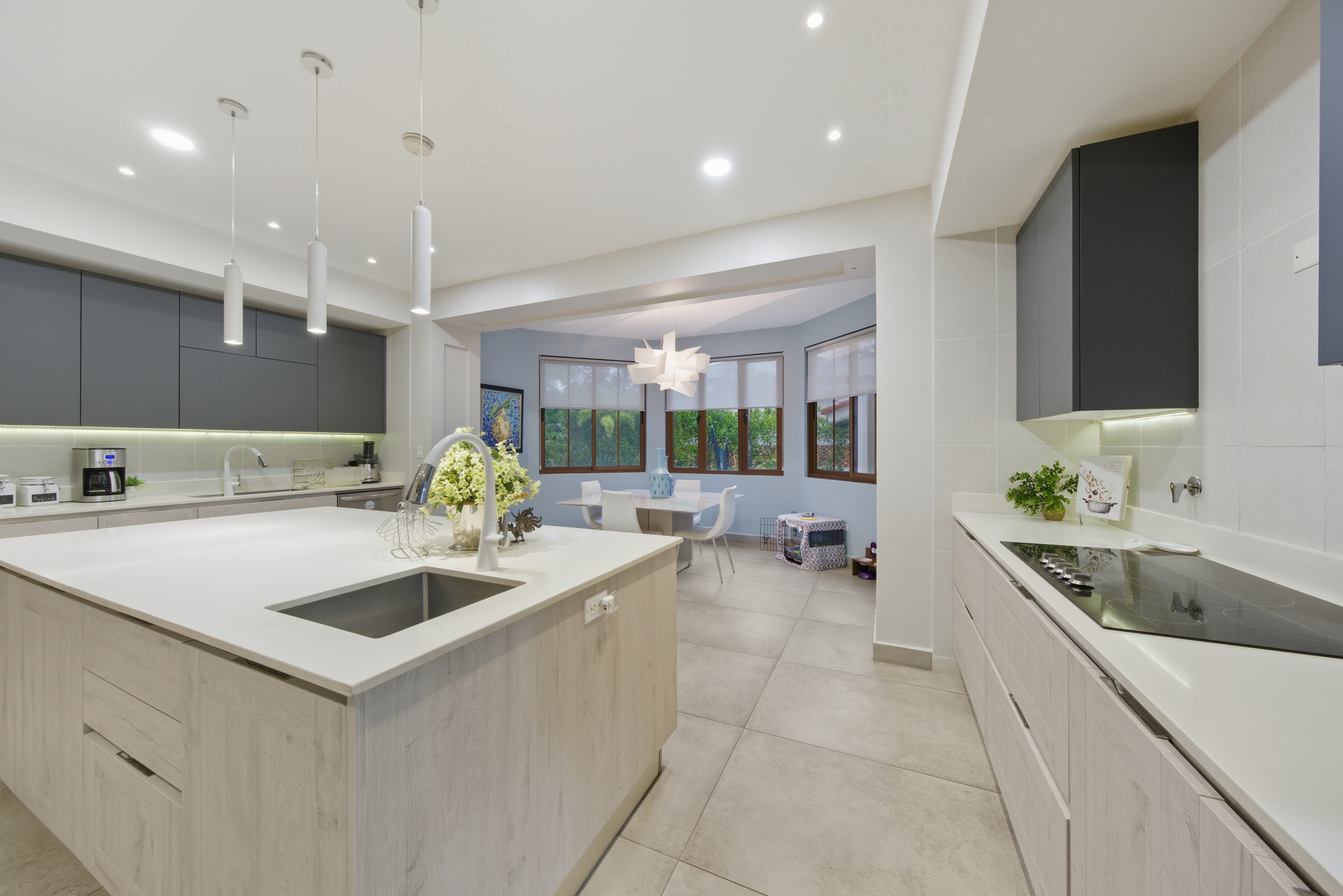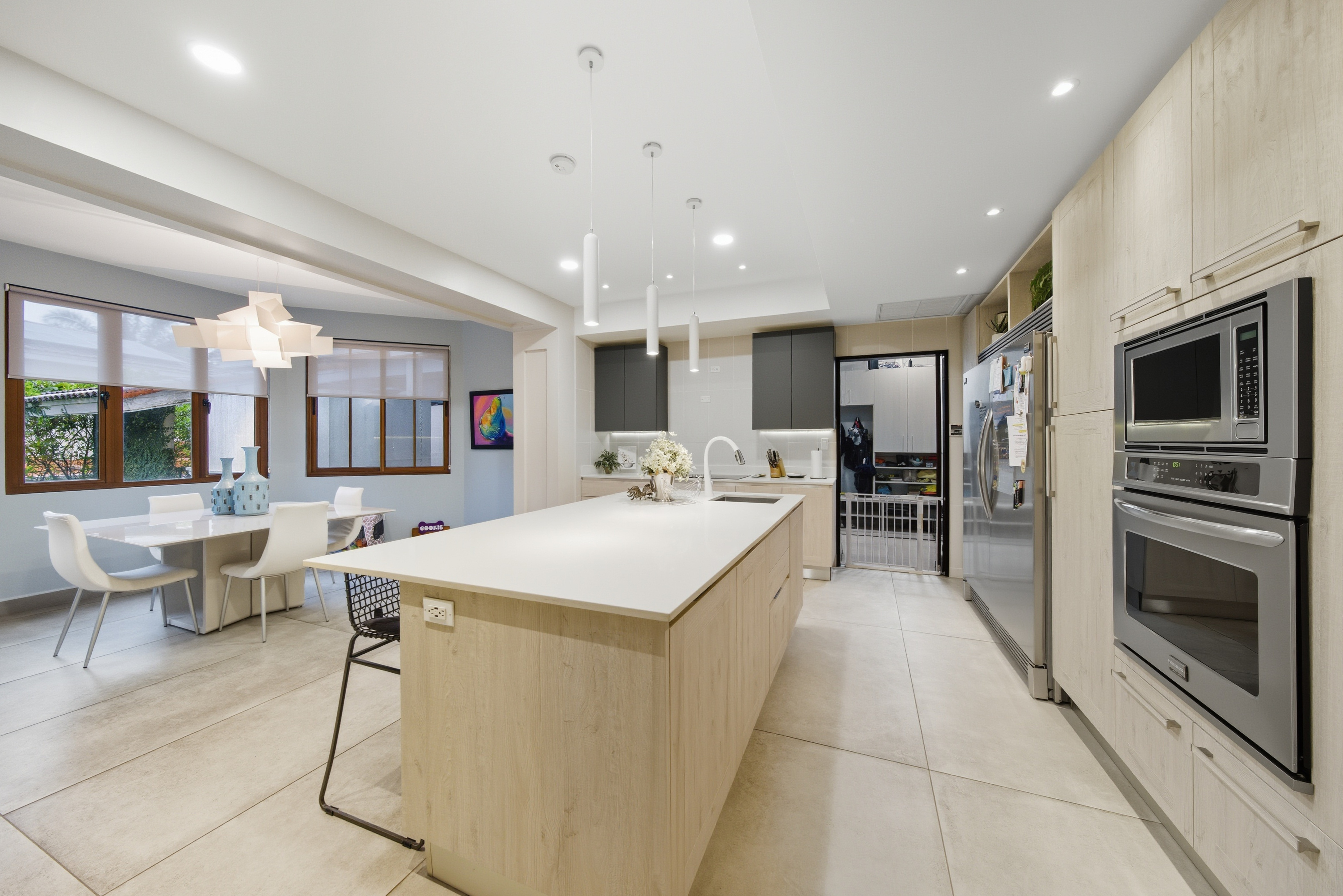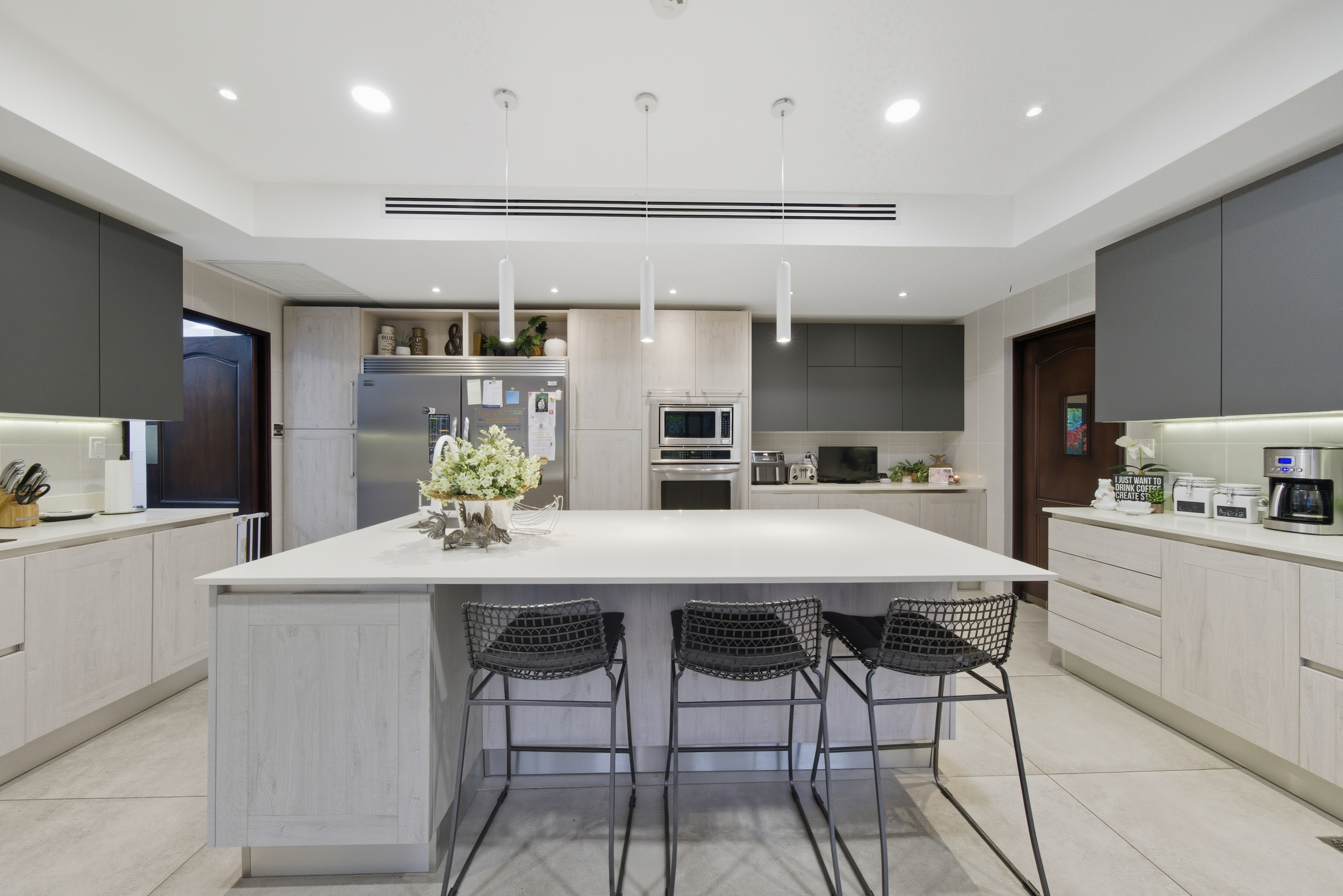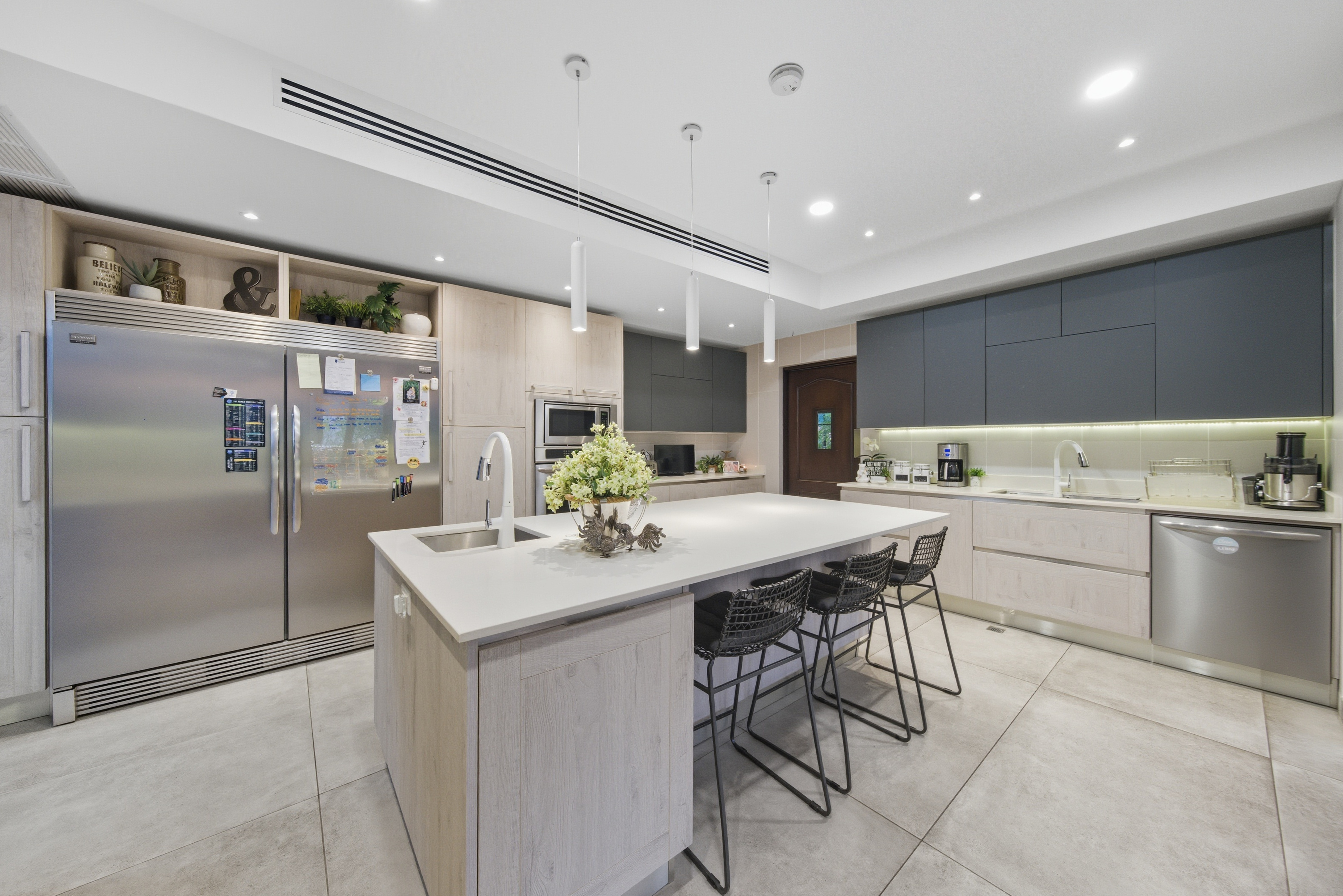 The covered terrace has room for both a seating area and a coffee table, perfect for family meals or gatherings with friends. It overlooks the yard, which includes an irrigation system that keeps maintenance simple. The custom Italian kitchen is spacious and functional, with an island that works well as a breakfast bar. It’s close to the main areas but still private, with direct access to the maid’s room and bathroom, plus a laundry room with built-in storage and workspace.