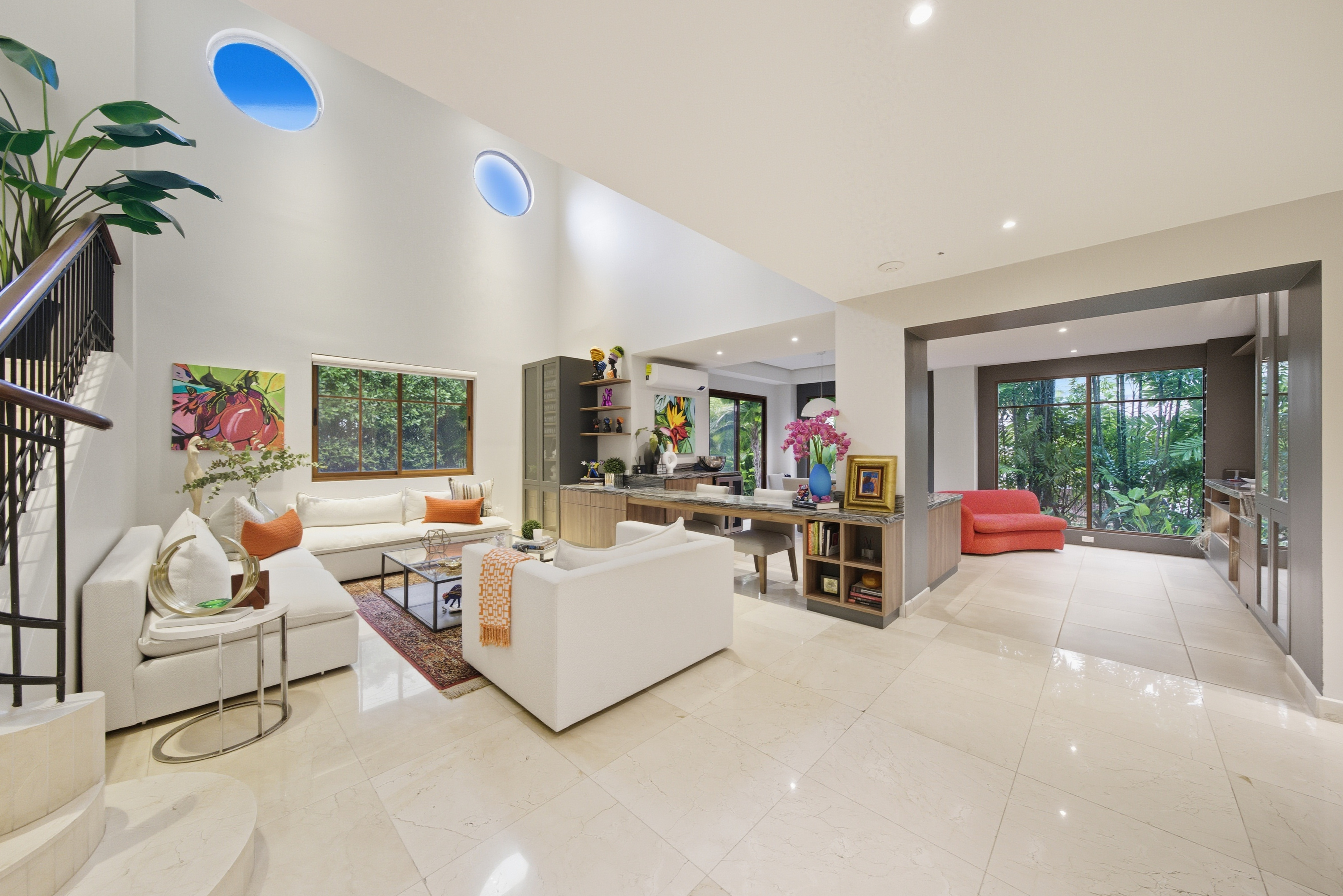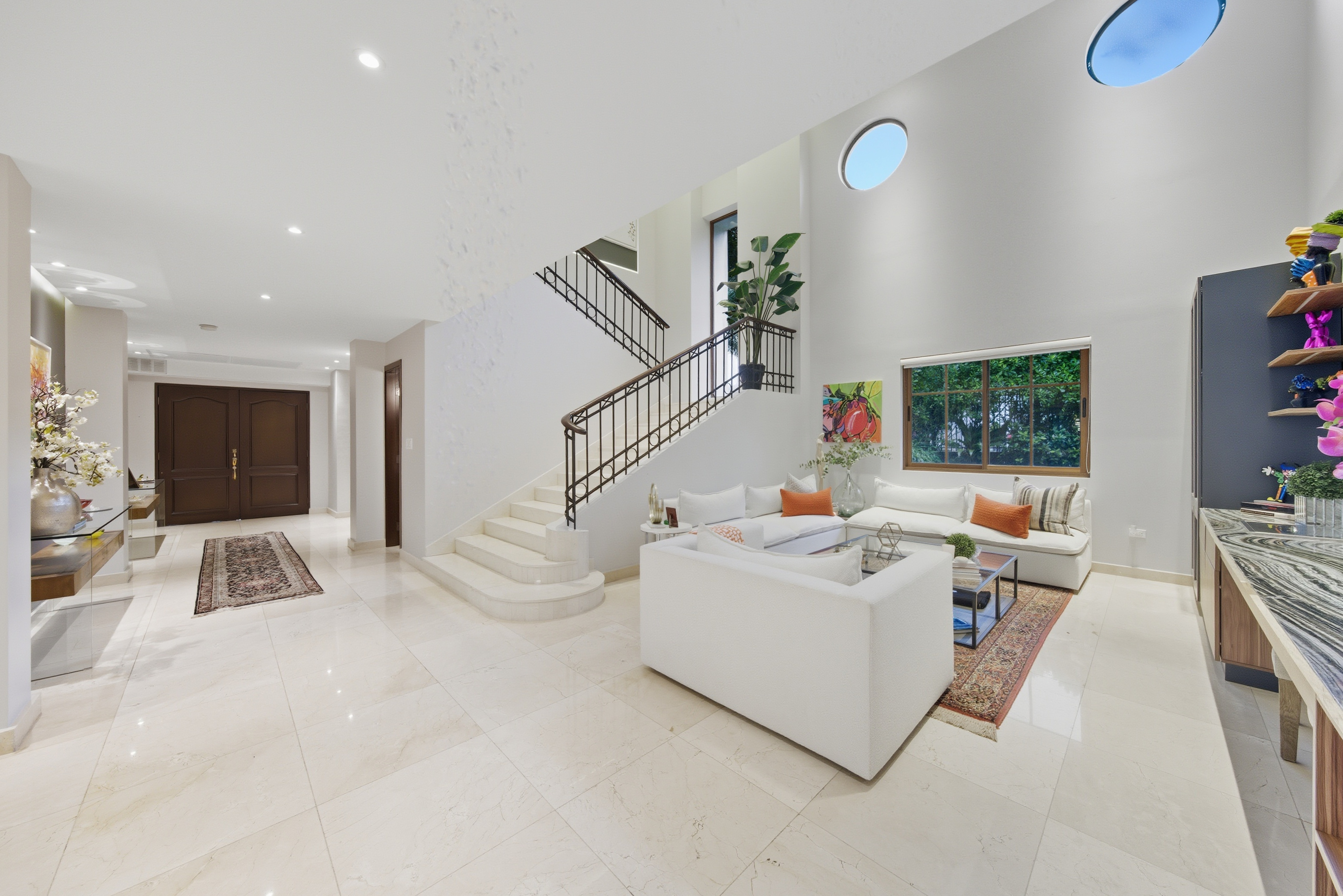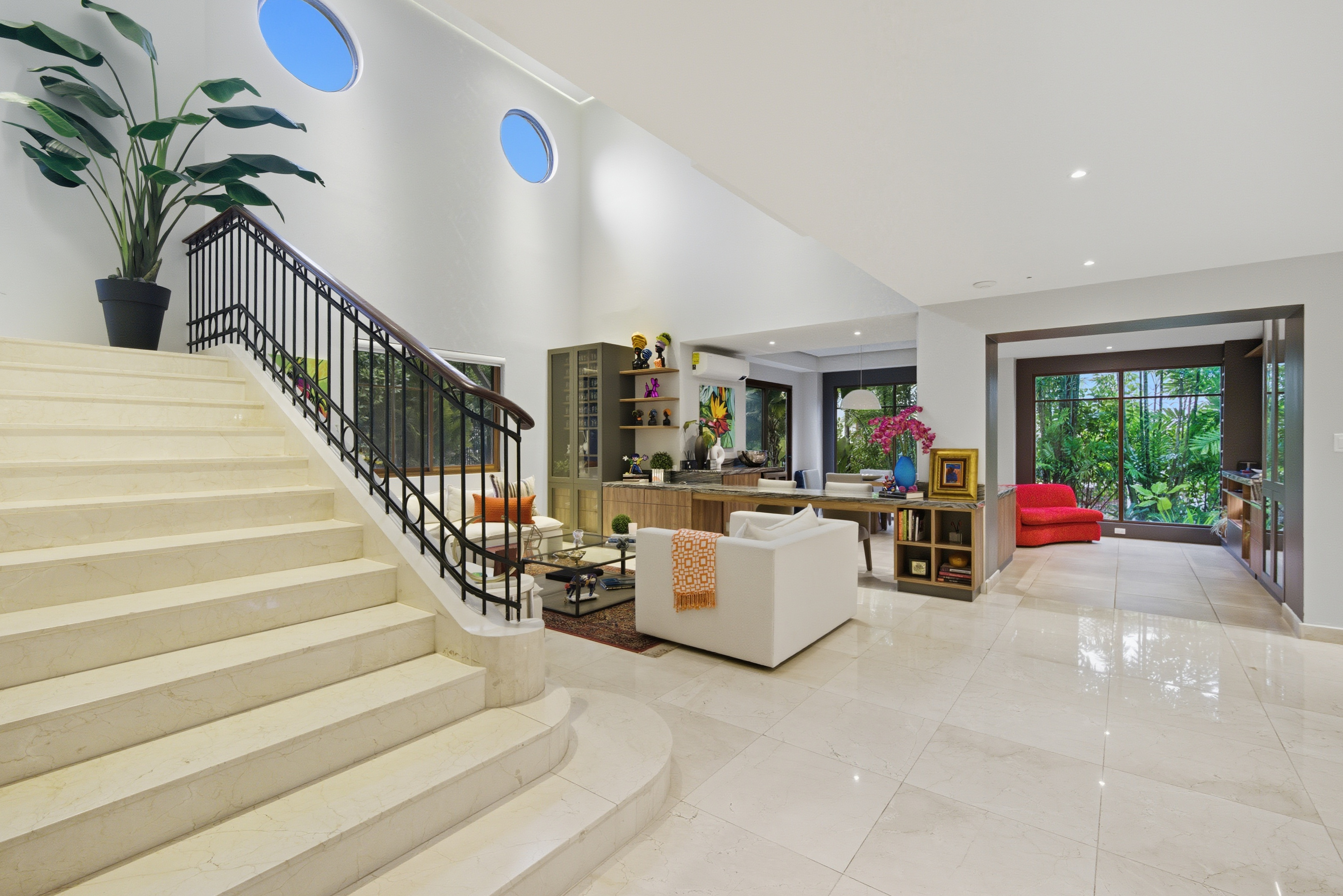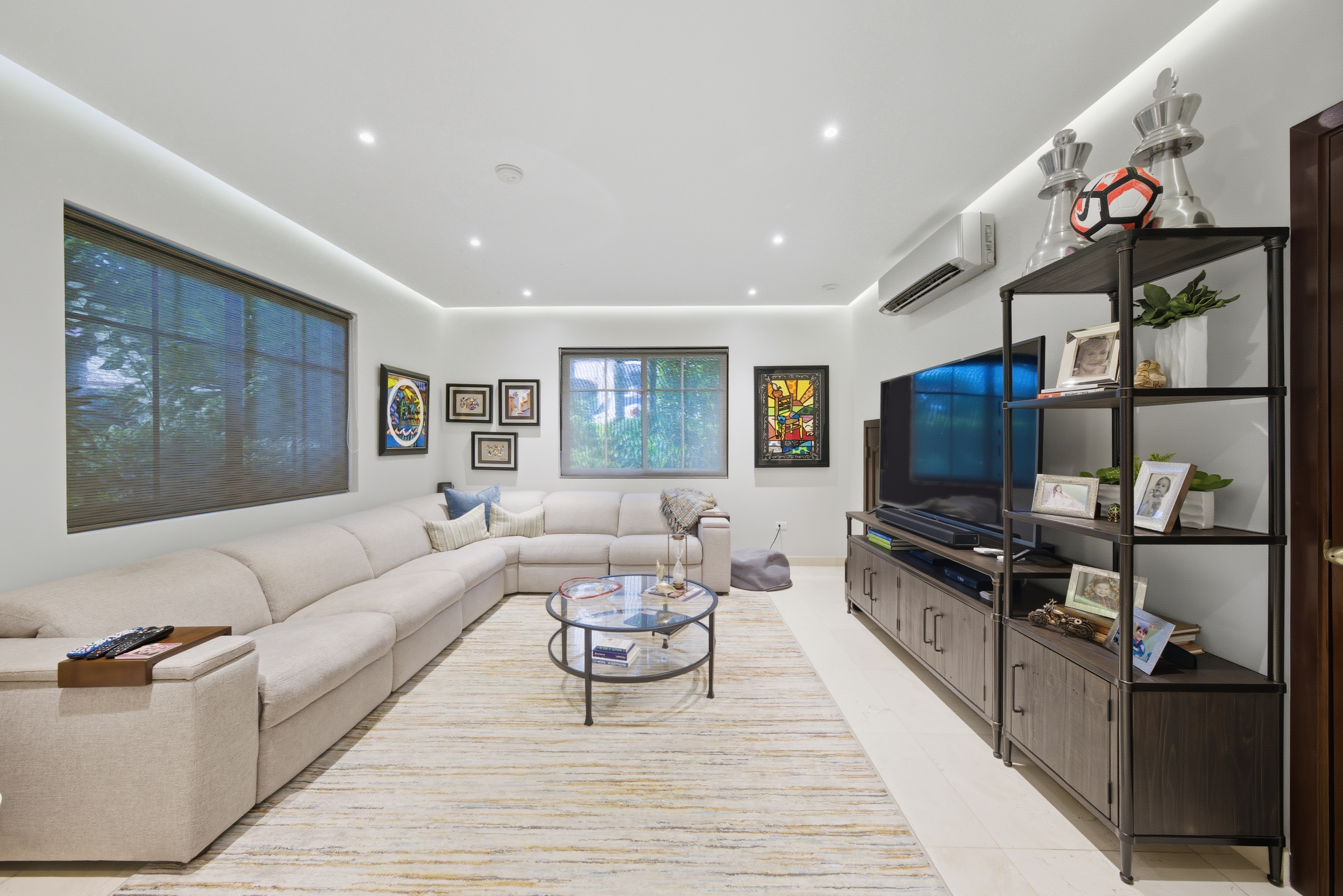 Double wooden doors open to the main level, where the spaces connect easily. To the left is a TV room (which can easily be converted to an extra bedroom), and down the hall, the bar and dining area lead to a second living room that opens onto the terrace and yard. Large windows frame views of the greenery, adding a sense of openness to the main living areas.