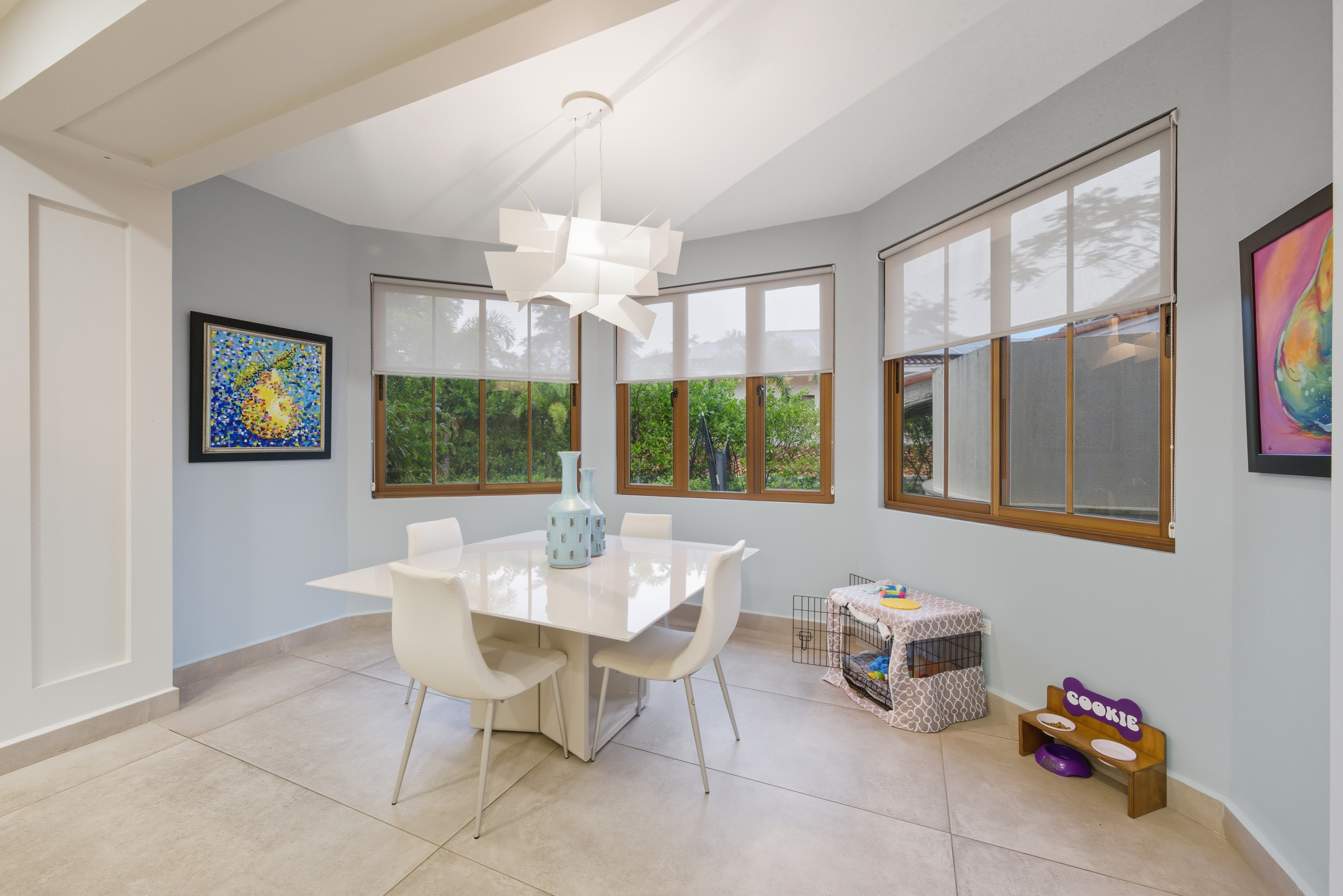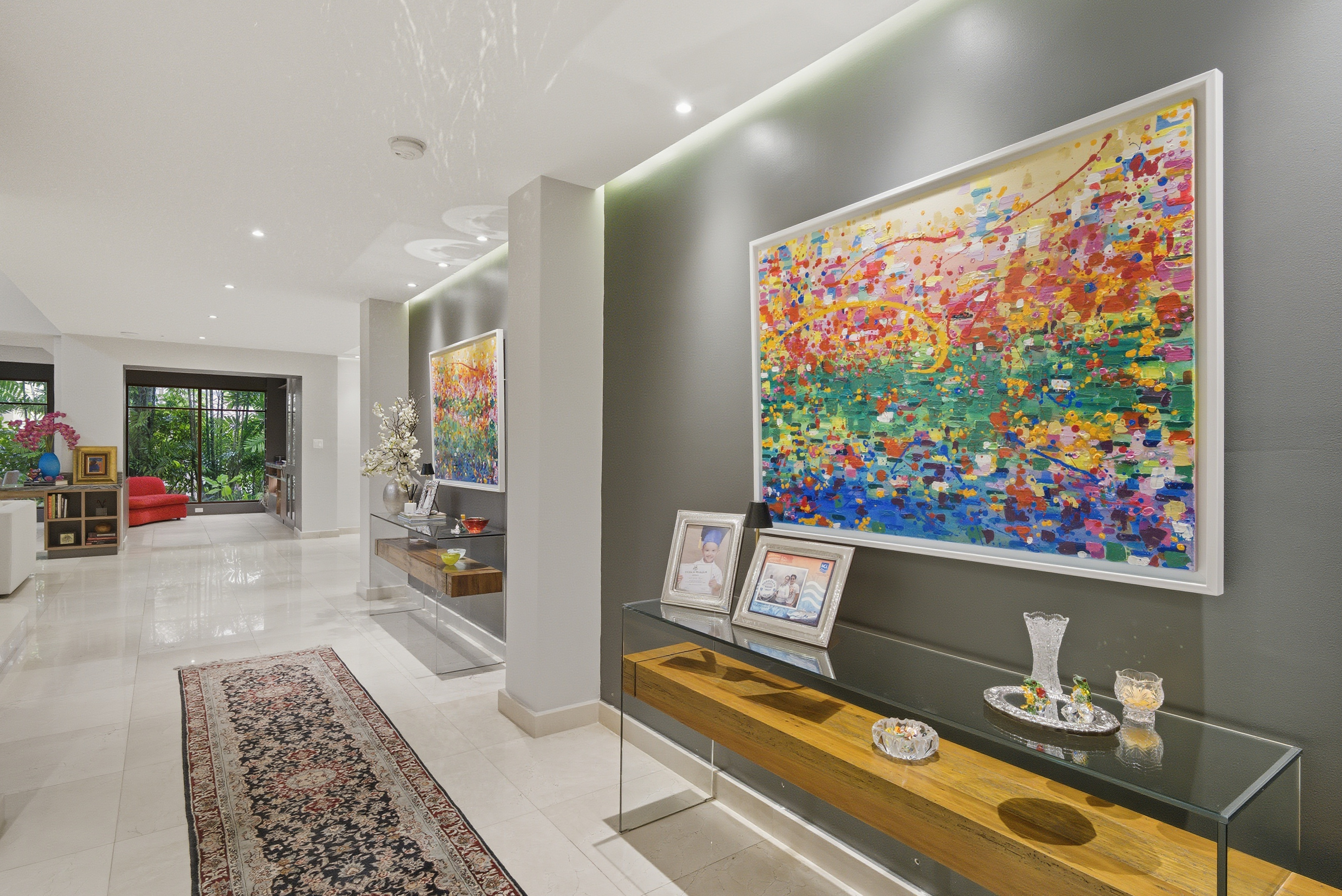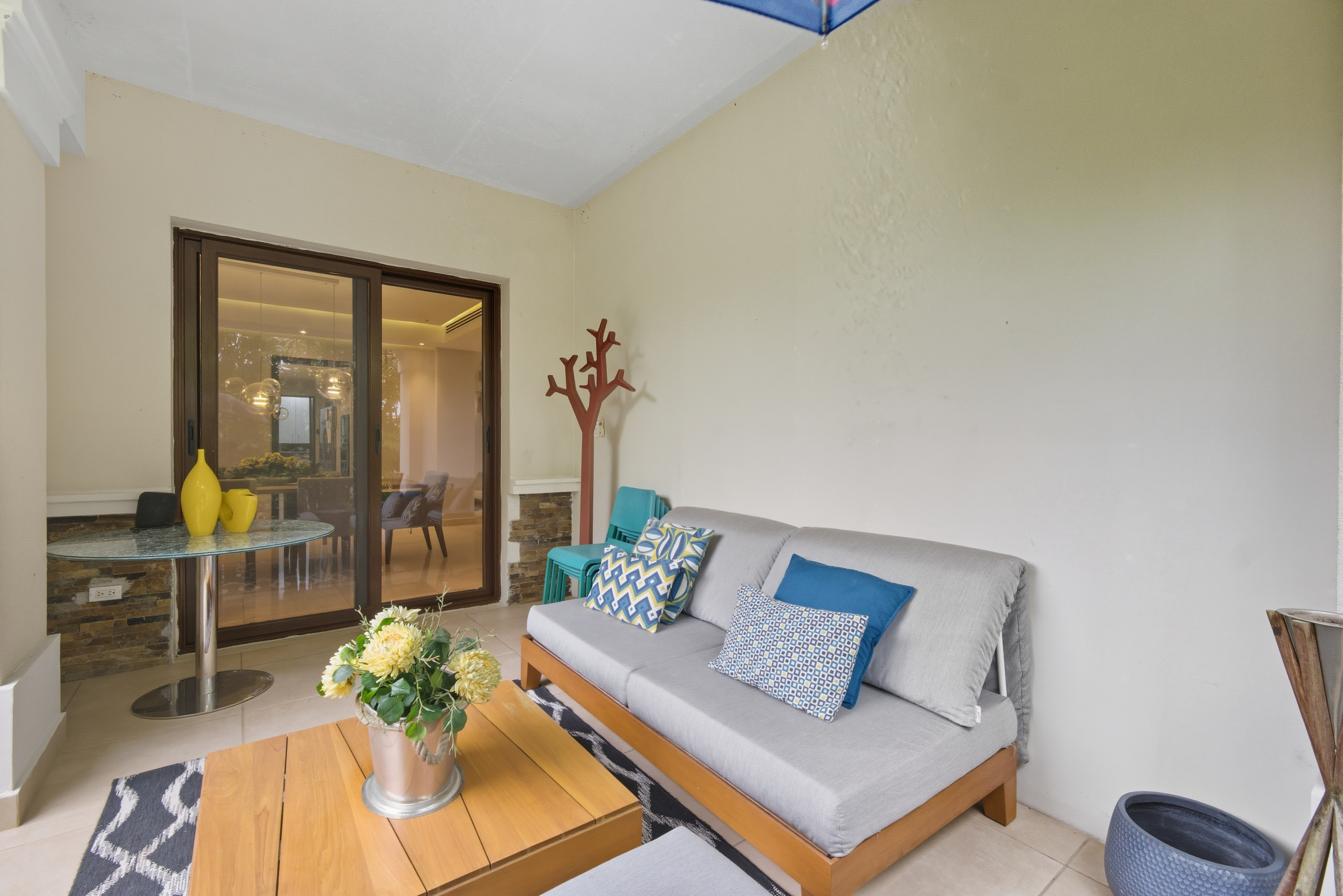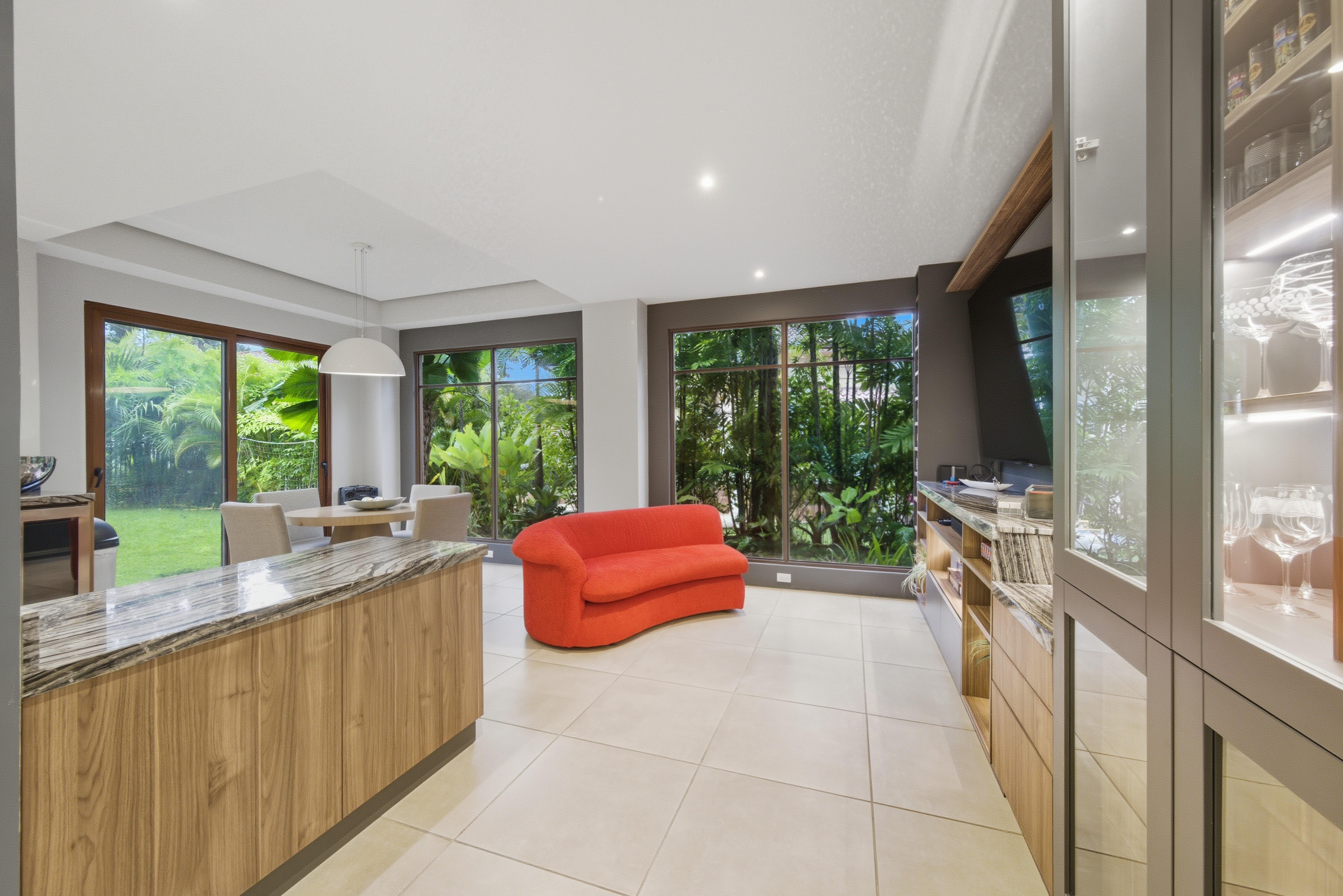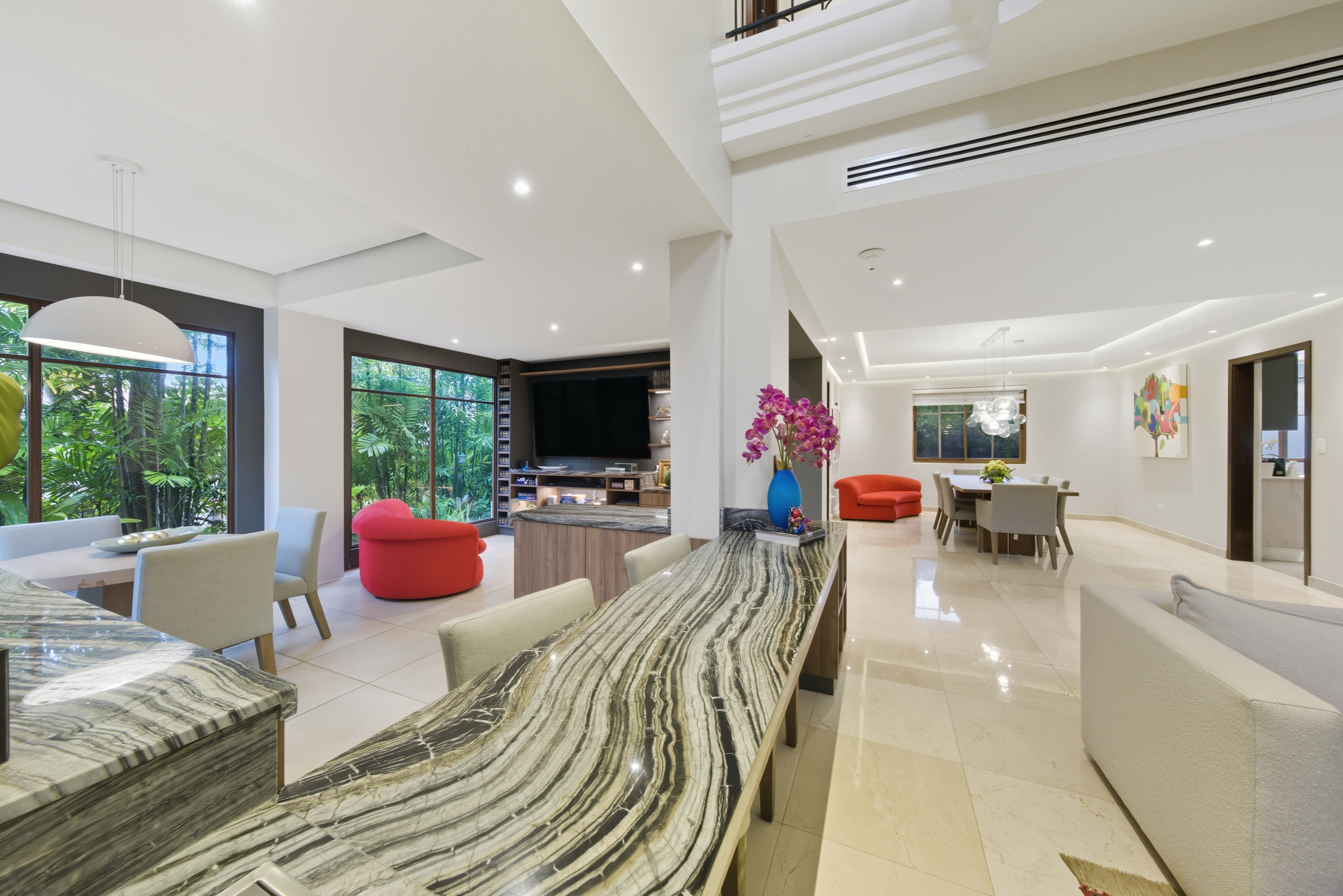 Double wooden doors open to the main level, where the spaces connect easily. To the left is a TV room (which can easily be converted to an extra bedroom), and down the hall, the bar and dining area lead to a second living room that opens onto the terrace and yard. Large windows frame views of the greenery, adding a sense of openness to the main living areas.