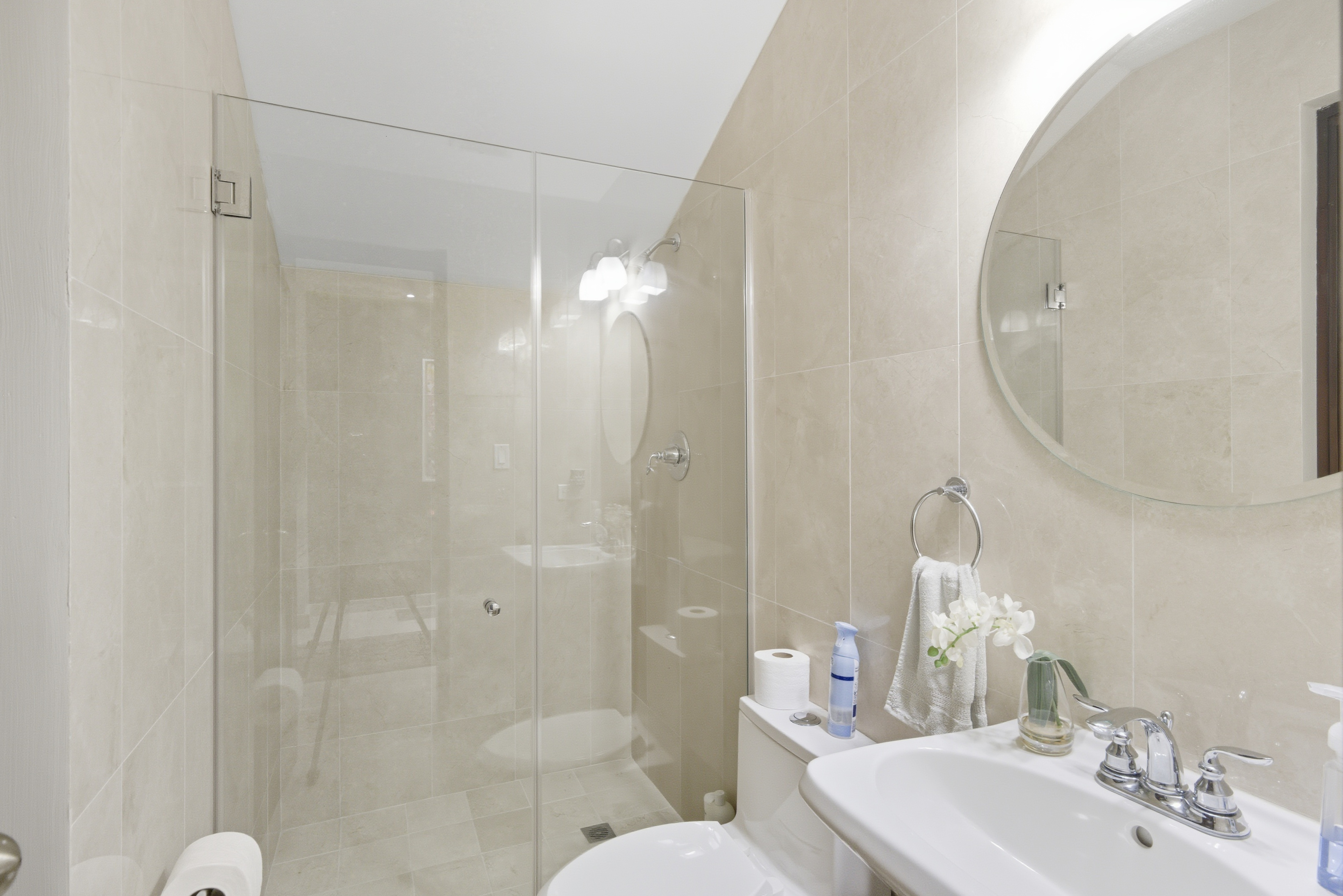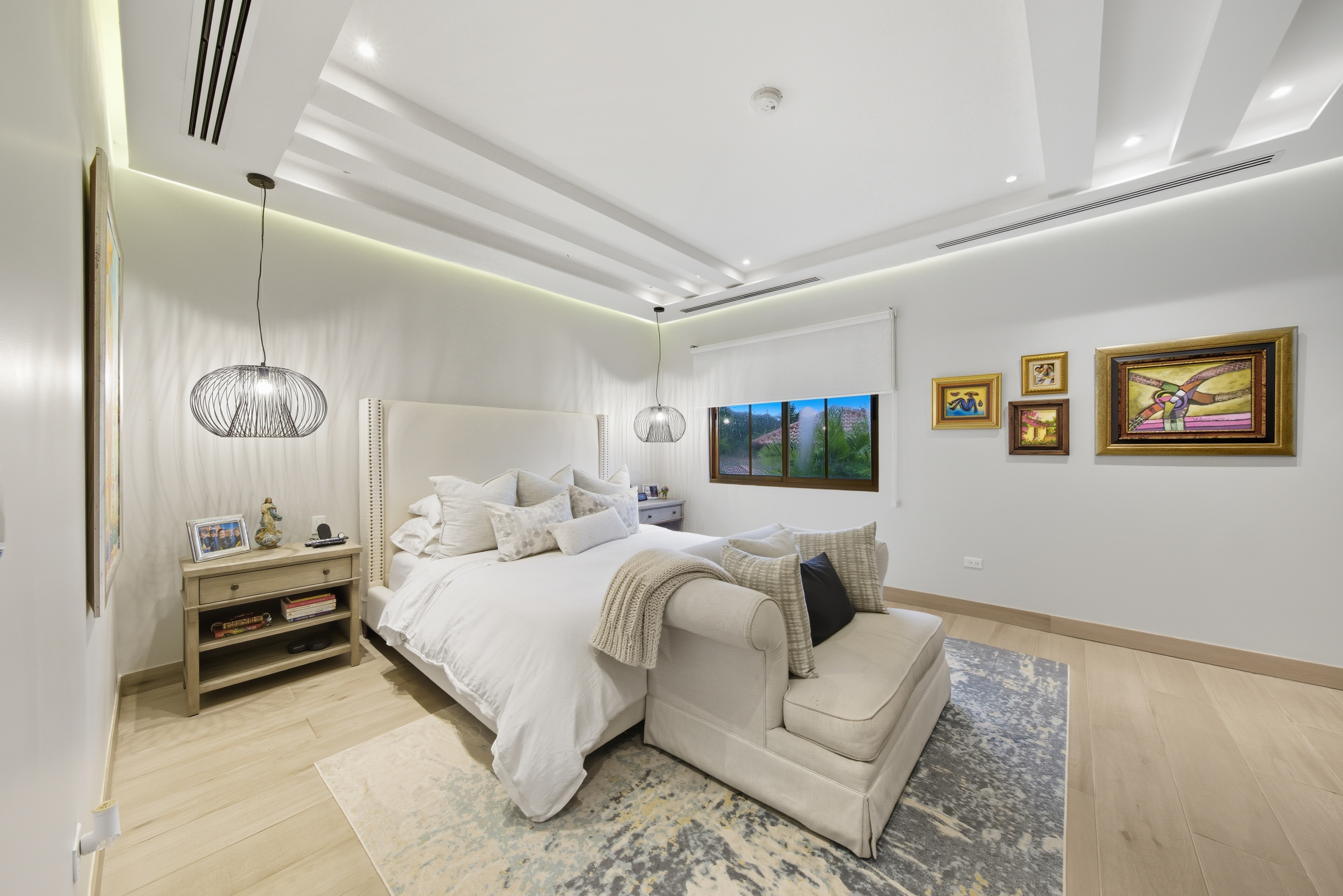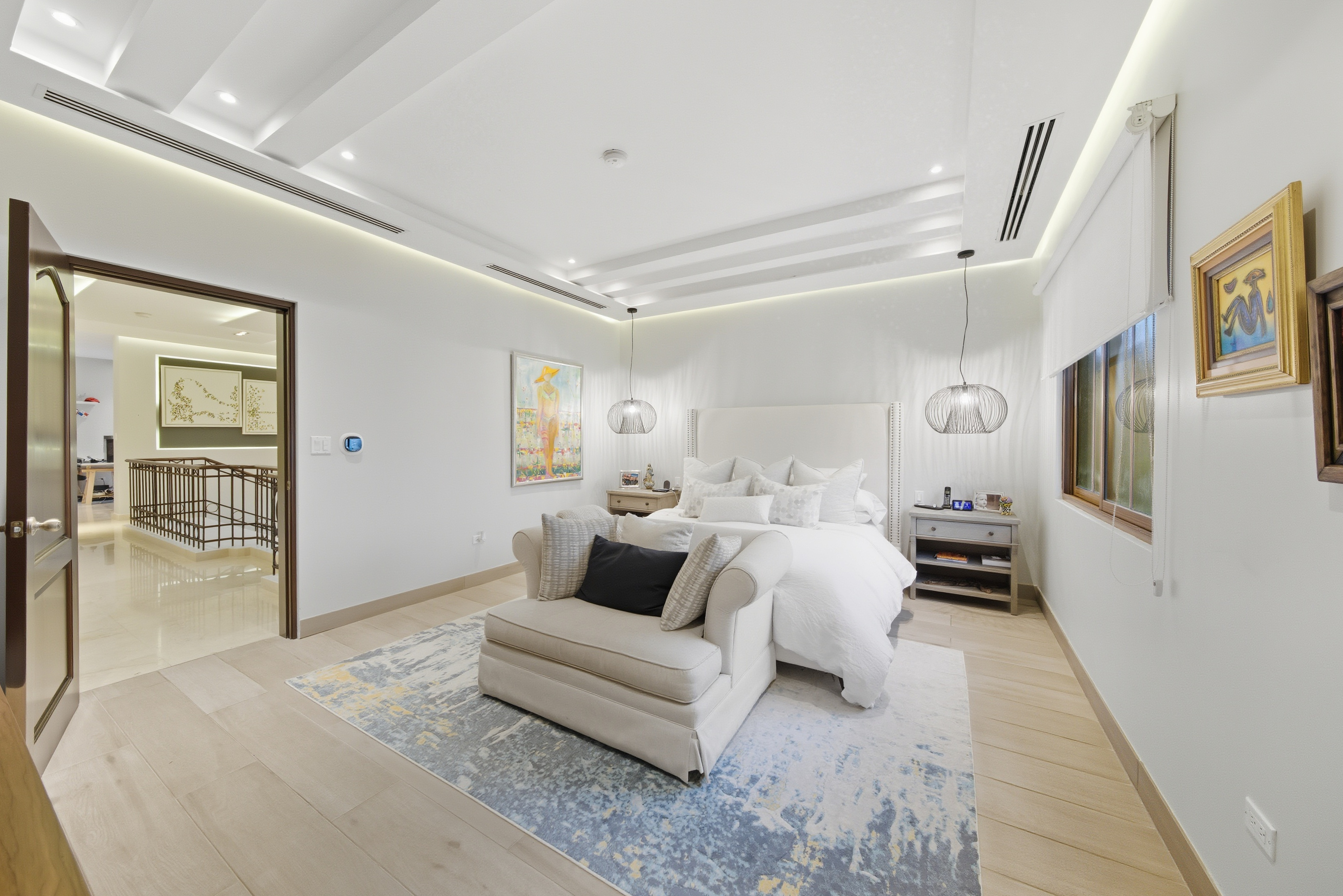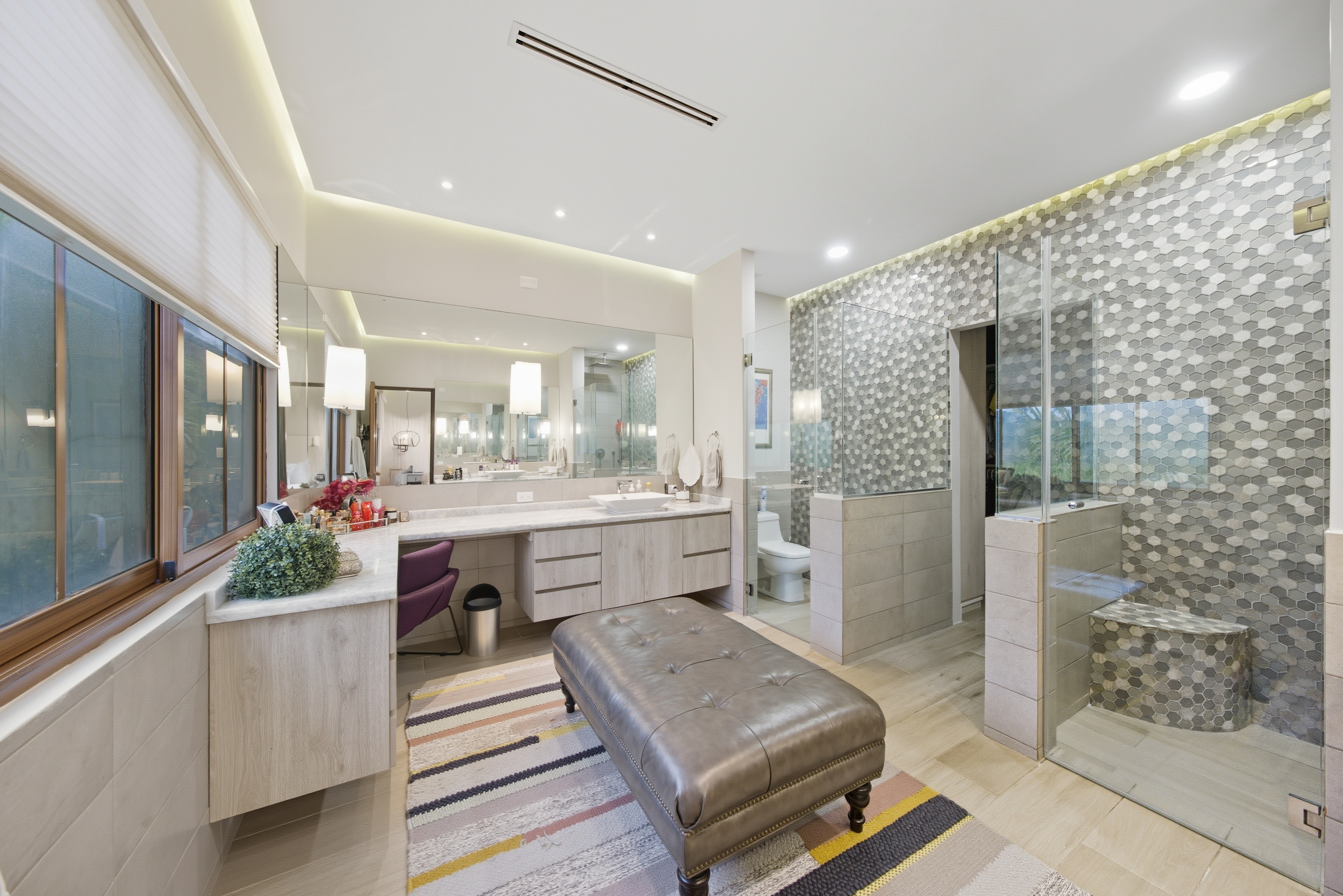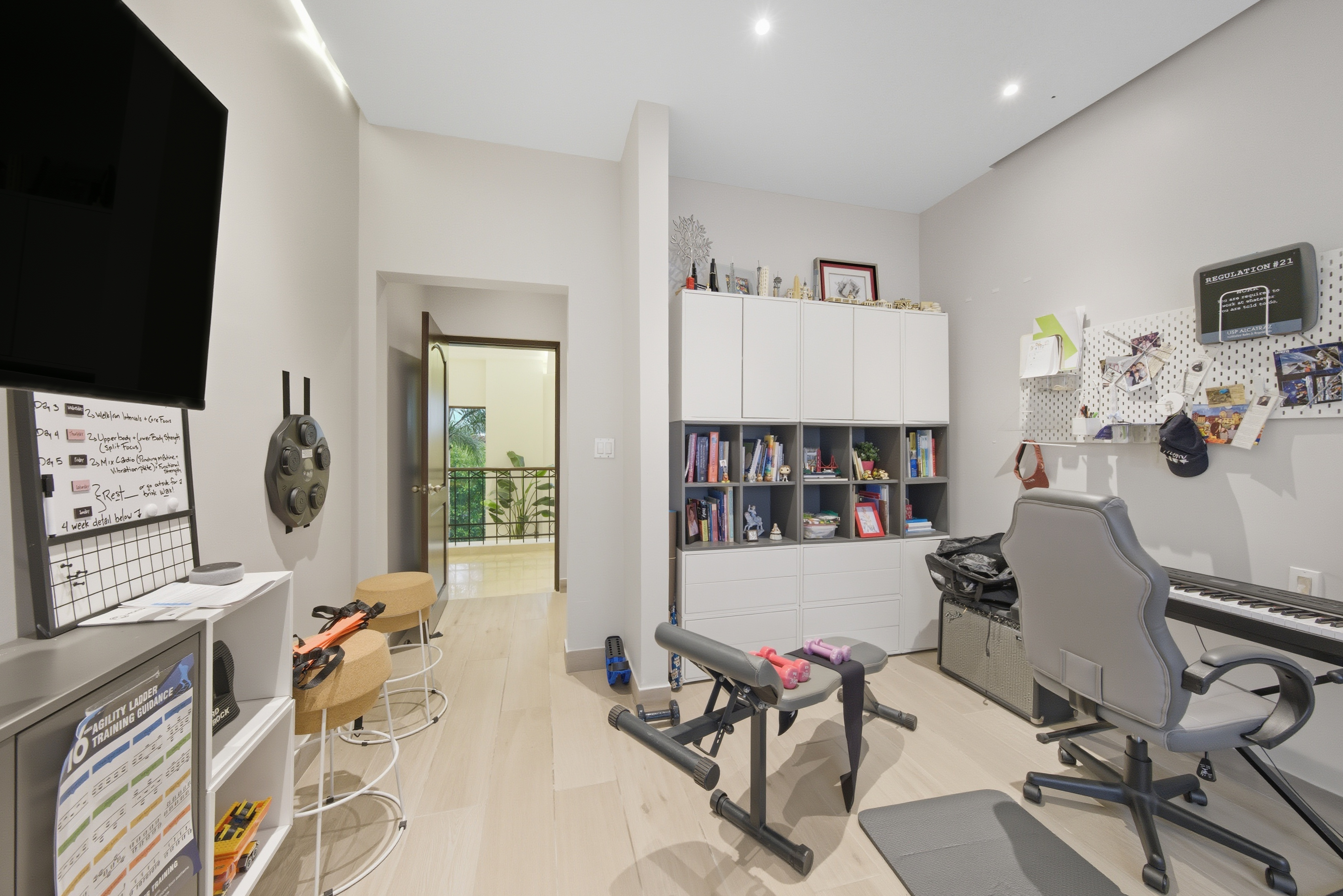 Upstairs are five rooms in total. Three rooms currently serve as bedrooms, each with an ensuite bathroom and built-in closet. The main bedroom stands out for its size, featuring a large bathroom with two showers and an extended walk-in closet. One of the rooms currently serves as a gym.