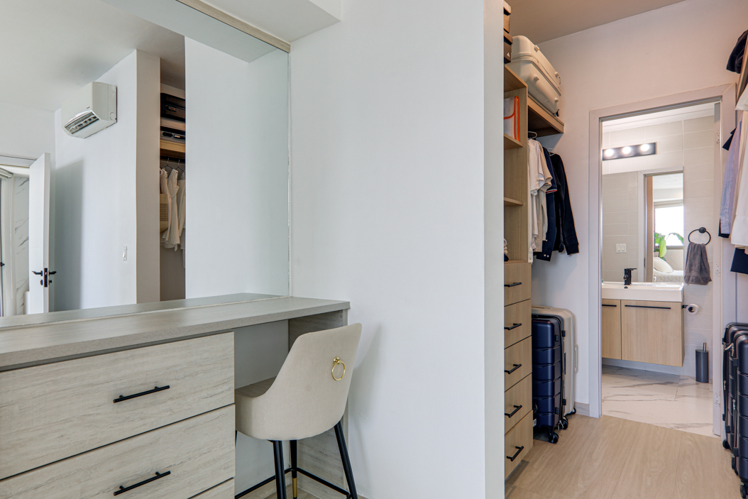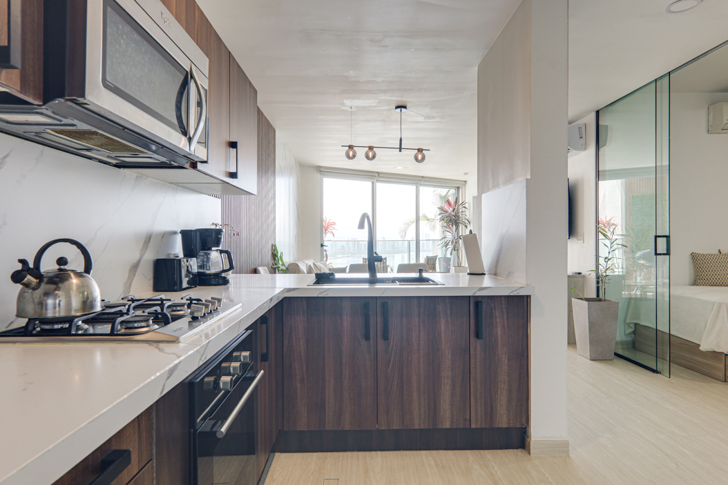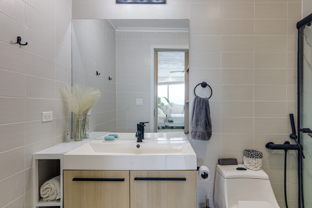 The kitchen makes the most of the space with an L-shaped counter and plenty of storage. From the living area, glass doors open out to a private balcony big enough for a table, a couple of chairs, and even a small BBQ. It’s a nice spot to enjoy the breeze and take in the view, whether it’s morning coffee or an evening glass of wine.