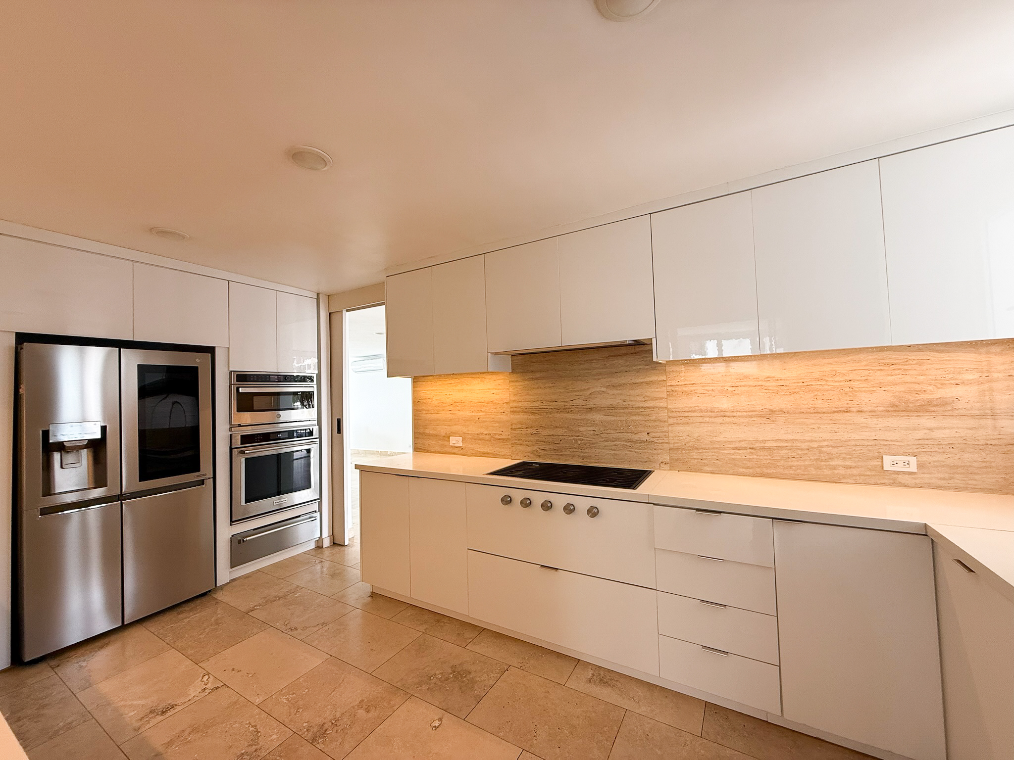 It has three bedrooms, each with its own bathroom, plus a guest half-bath. There’s also a maid’s room and bathroom, a separate laundry area, two parking spaces, and a balcony facing the ocean.