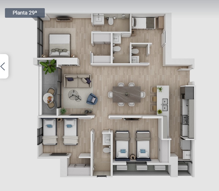 These units are spacious and designed with the main living area at the center, and the bedrooms grouped more privately to the side. Living and dining space connects to the kitchen and opens onto a balcony with floor to ceiling windows, which helps the space feel more open. Higher floors also have some distant ocean views, but all of these Model F three beds will have great city views.